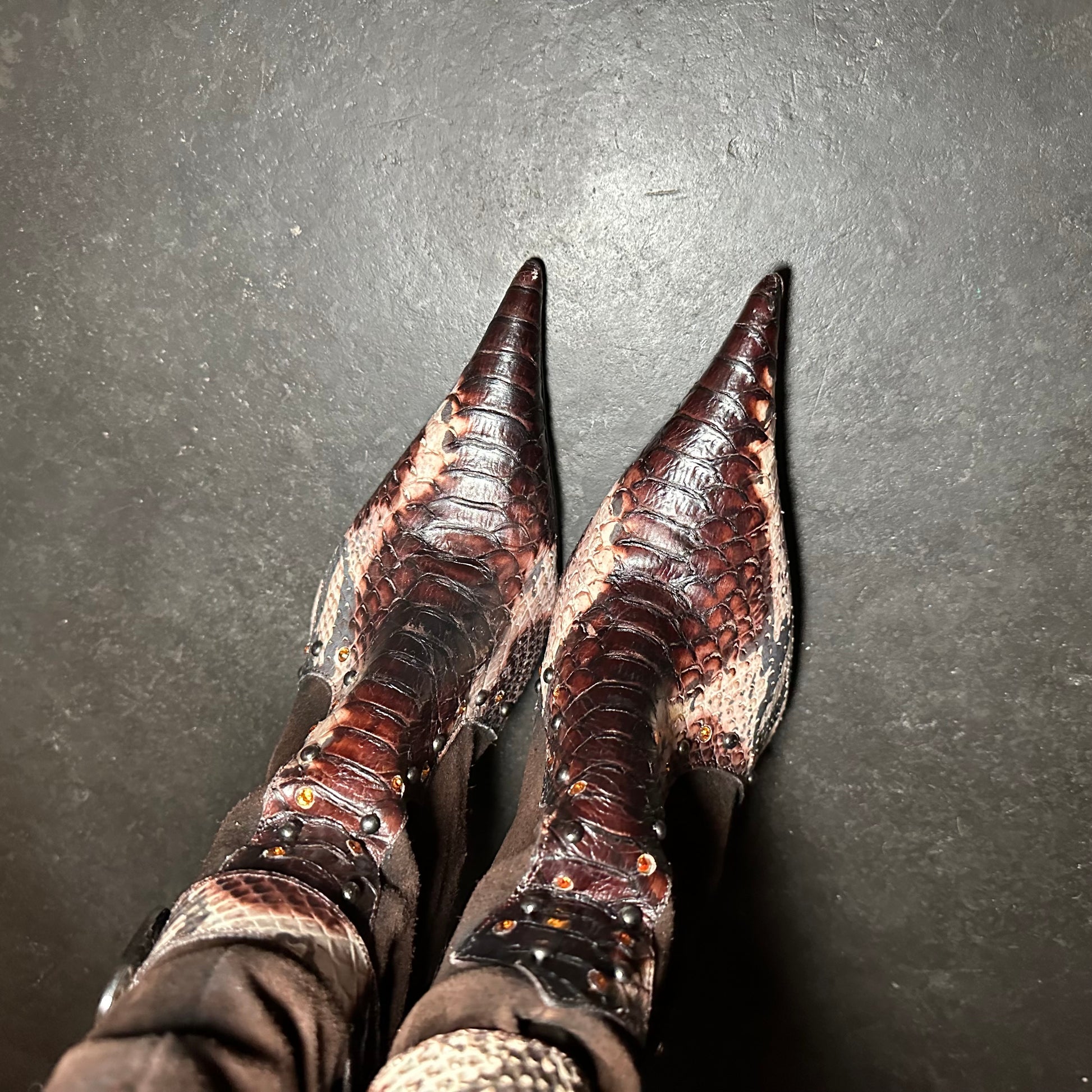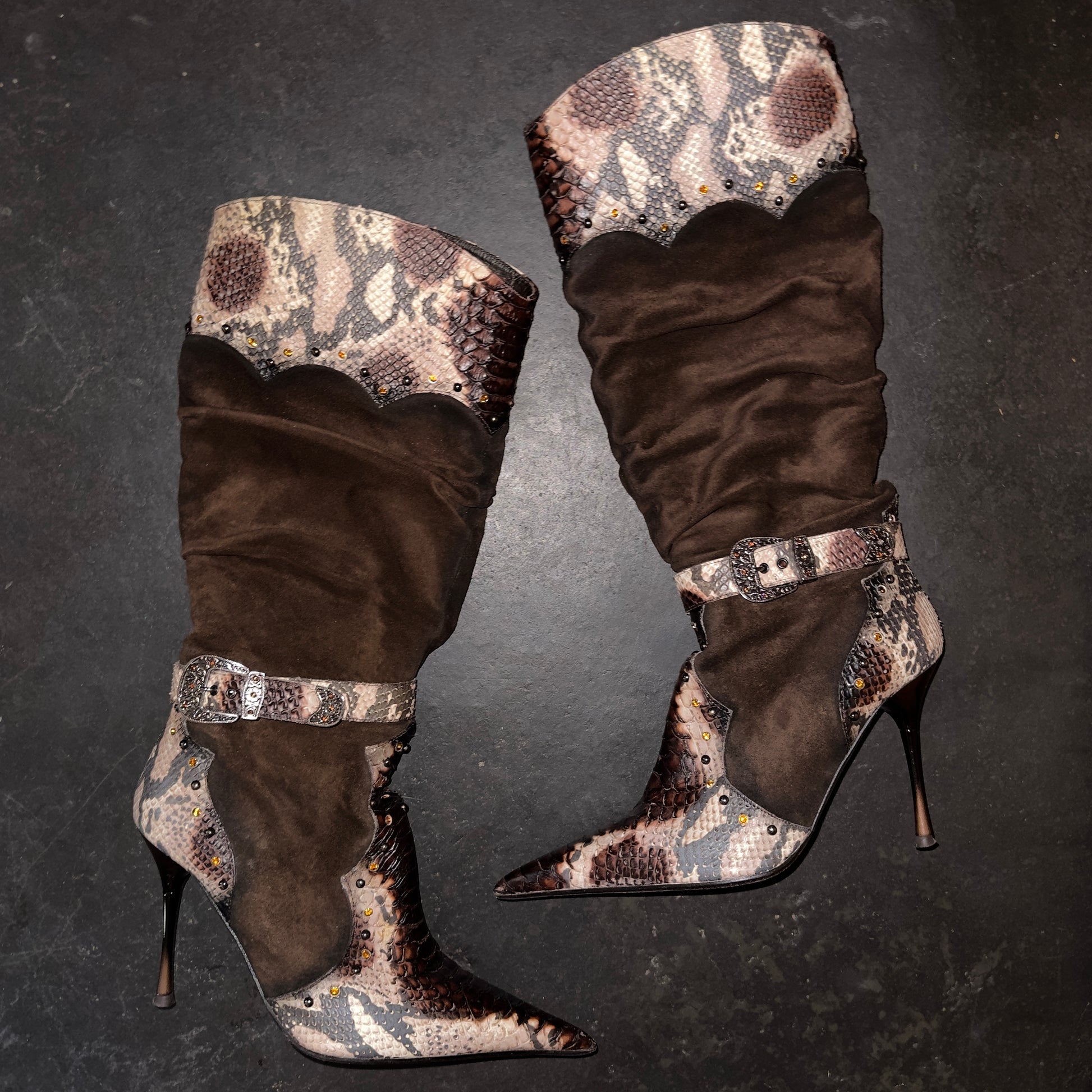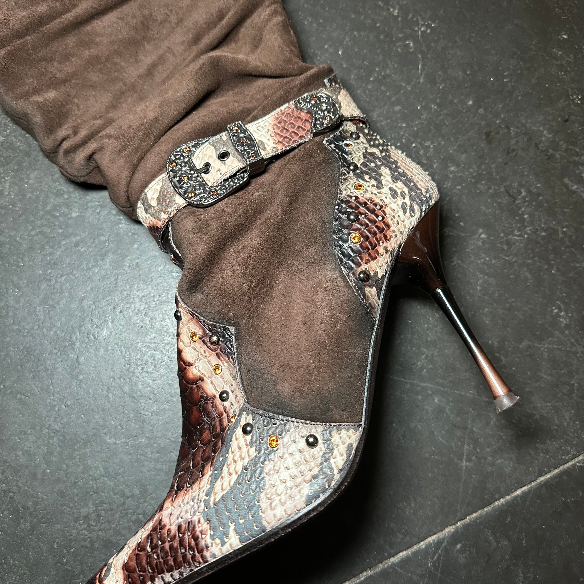 El Dante’s brown suede embellished western heeled boots with snakeskin effect accents.