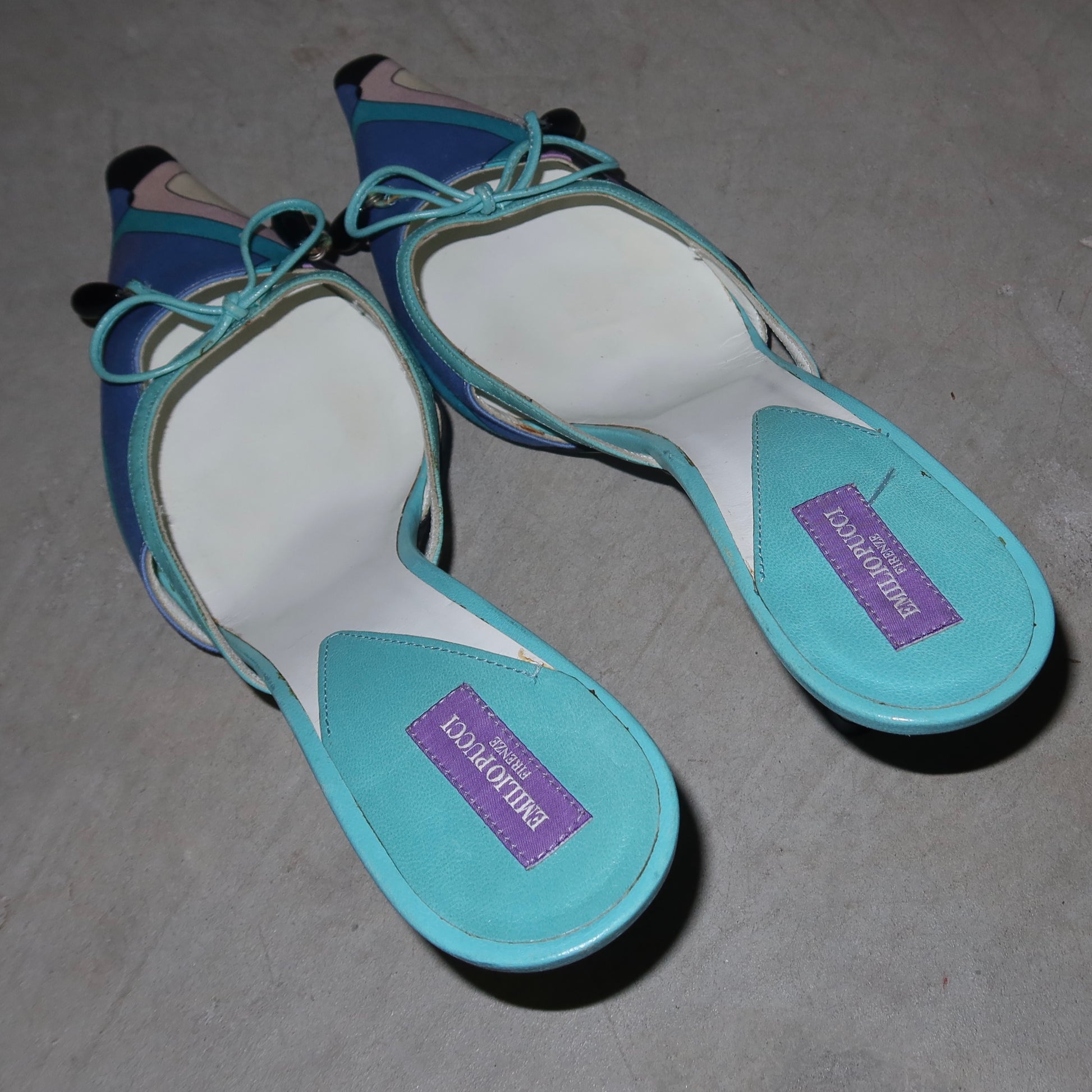 Gorgeous little cut out kitten heels by Emilio Pucci. Iconic blue Pucci print design with black beads in the ends of the bow detail. Pointed toe mules.