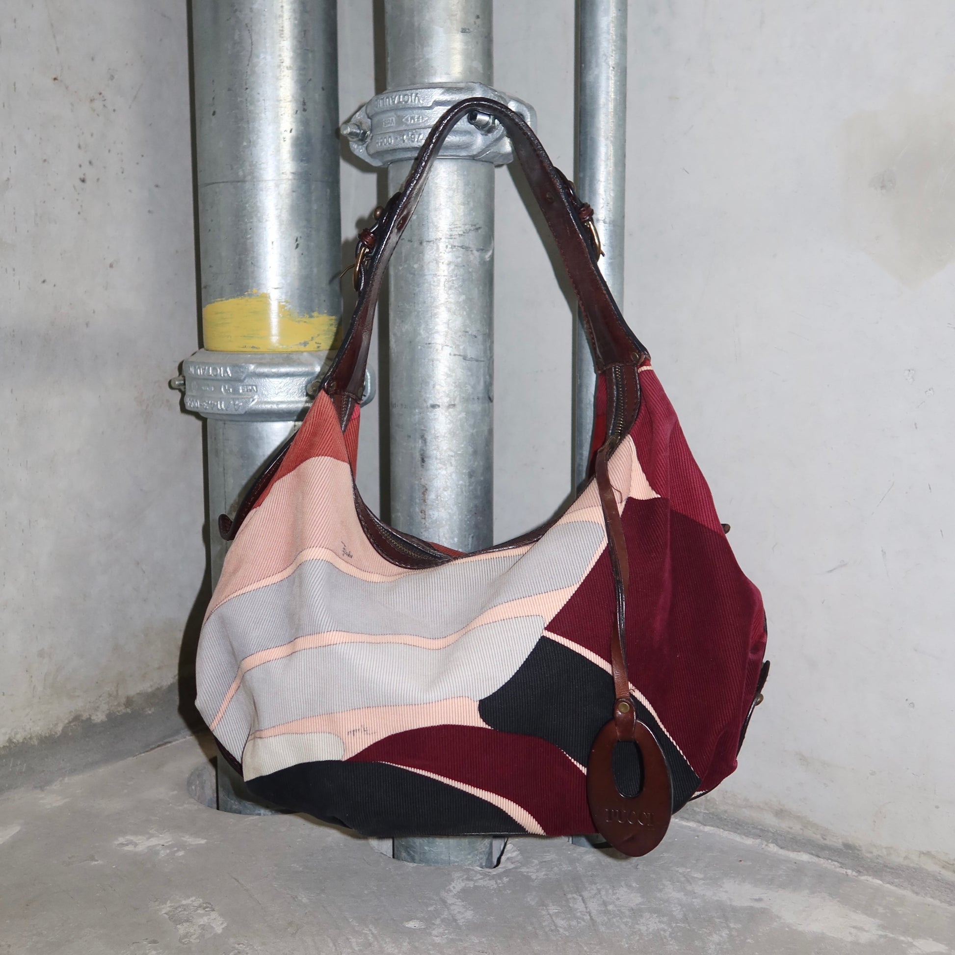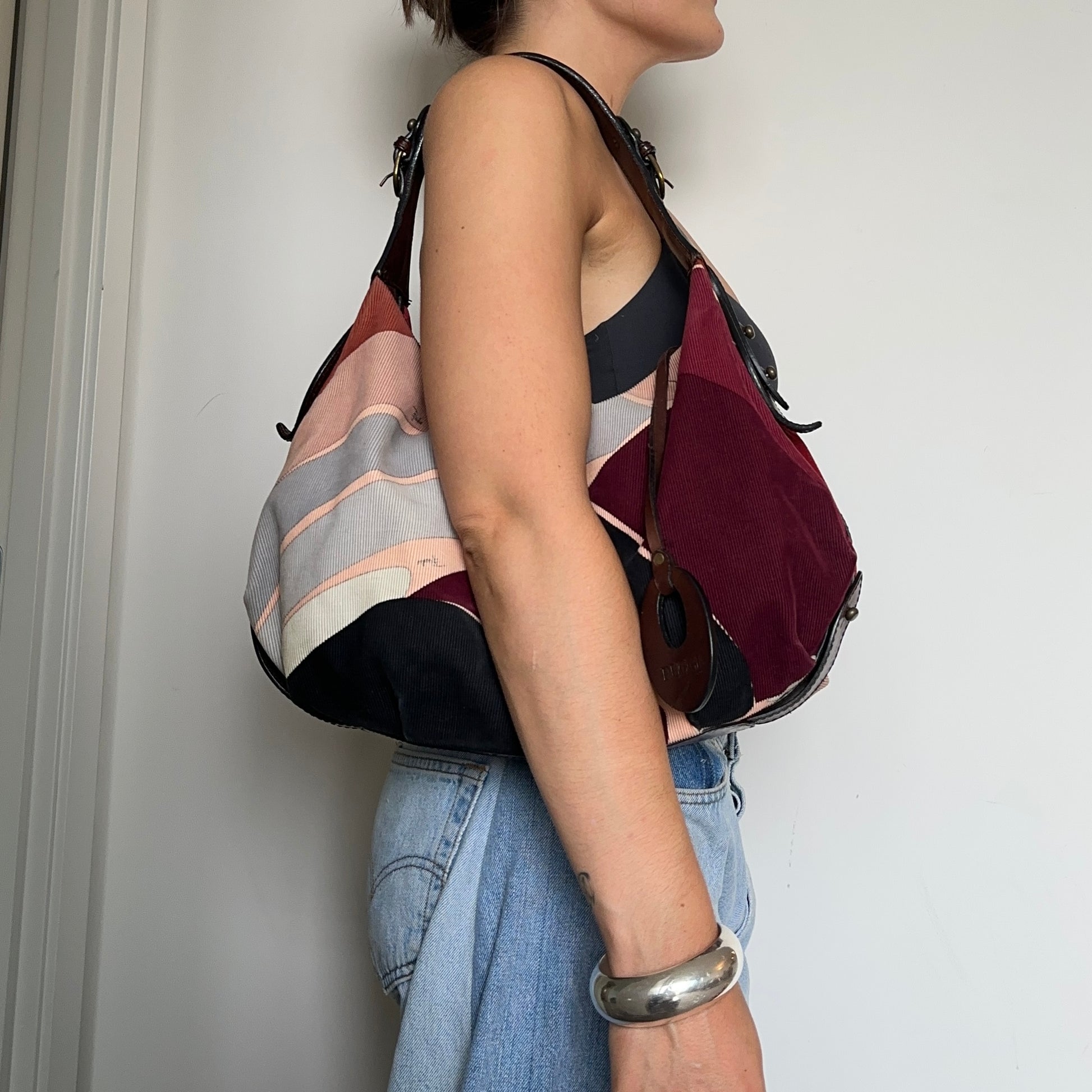 Beautiful large Emilio Pucci corduroy and leather hobo style shoulder bag. The perfect shape and sized bag!