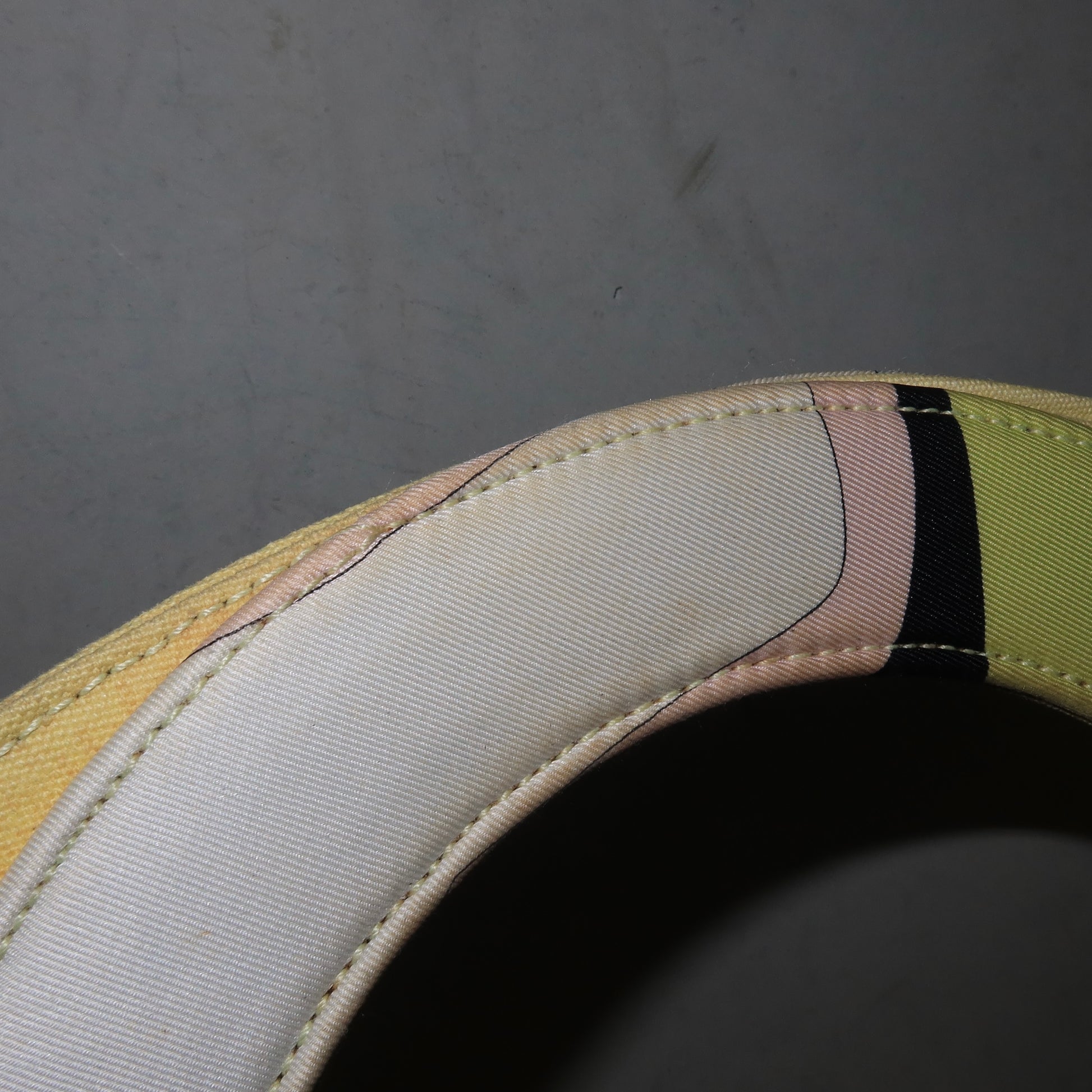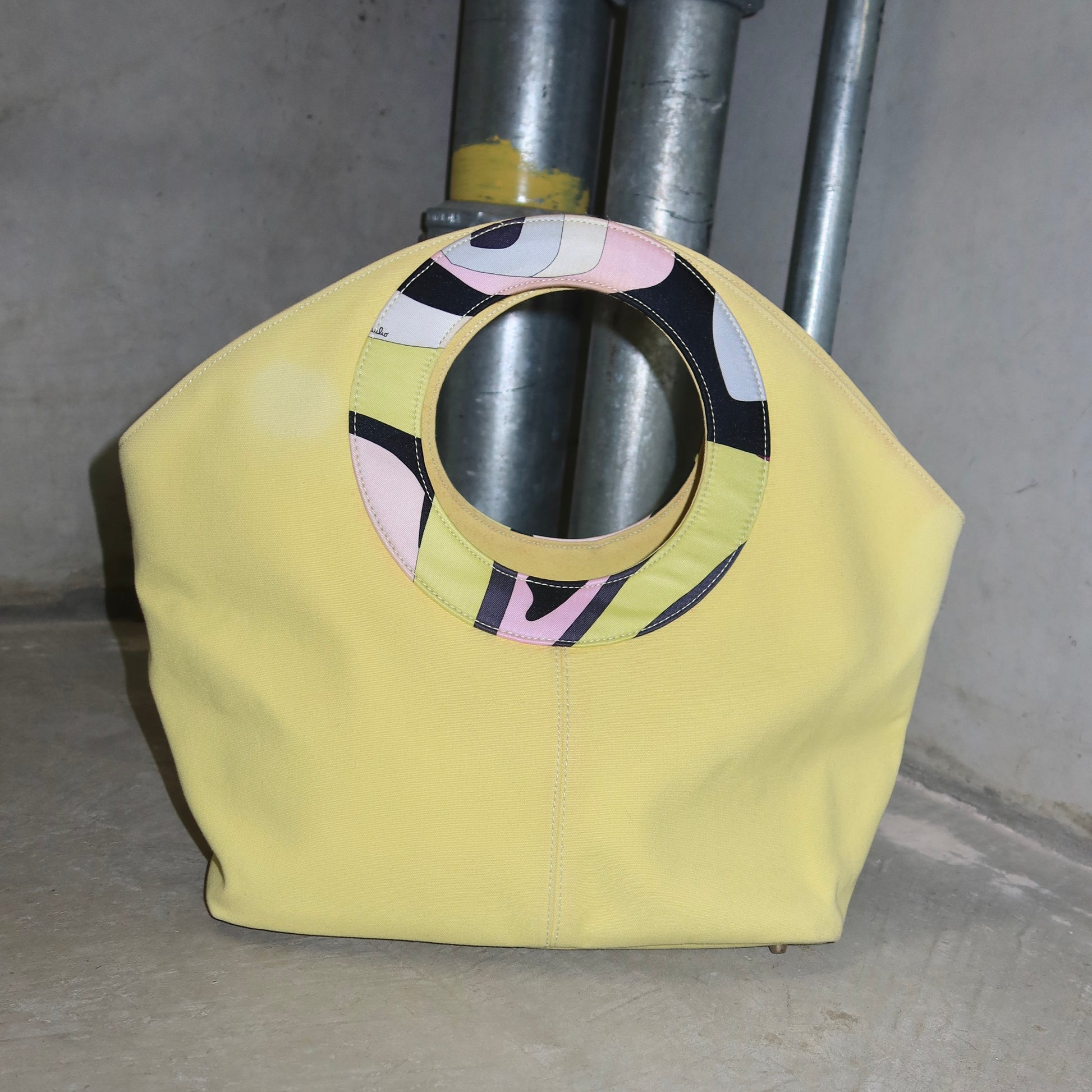 Beautiful large Emilio Pucci handbag in yellow canvas with iconic print accents round the handle and at the inner base. A rare find!
