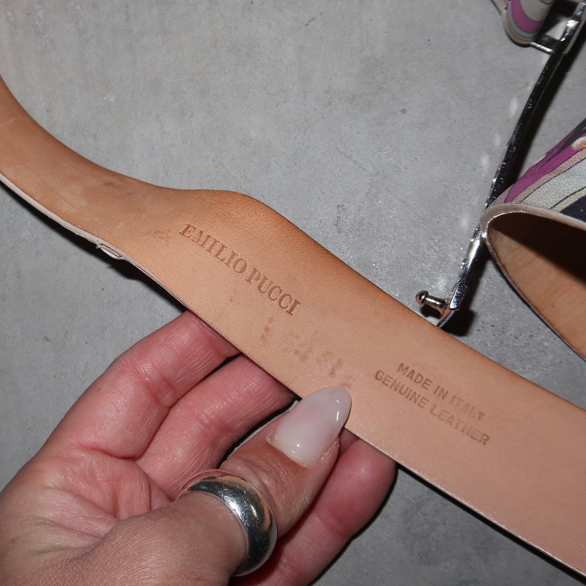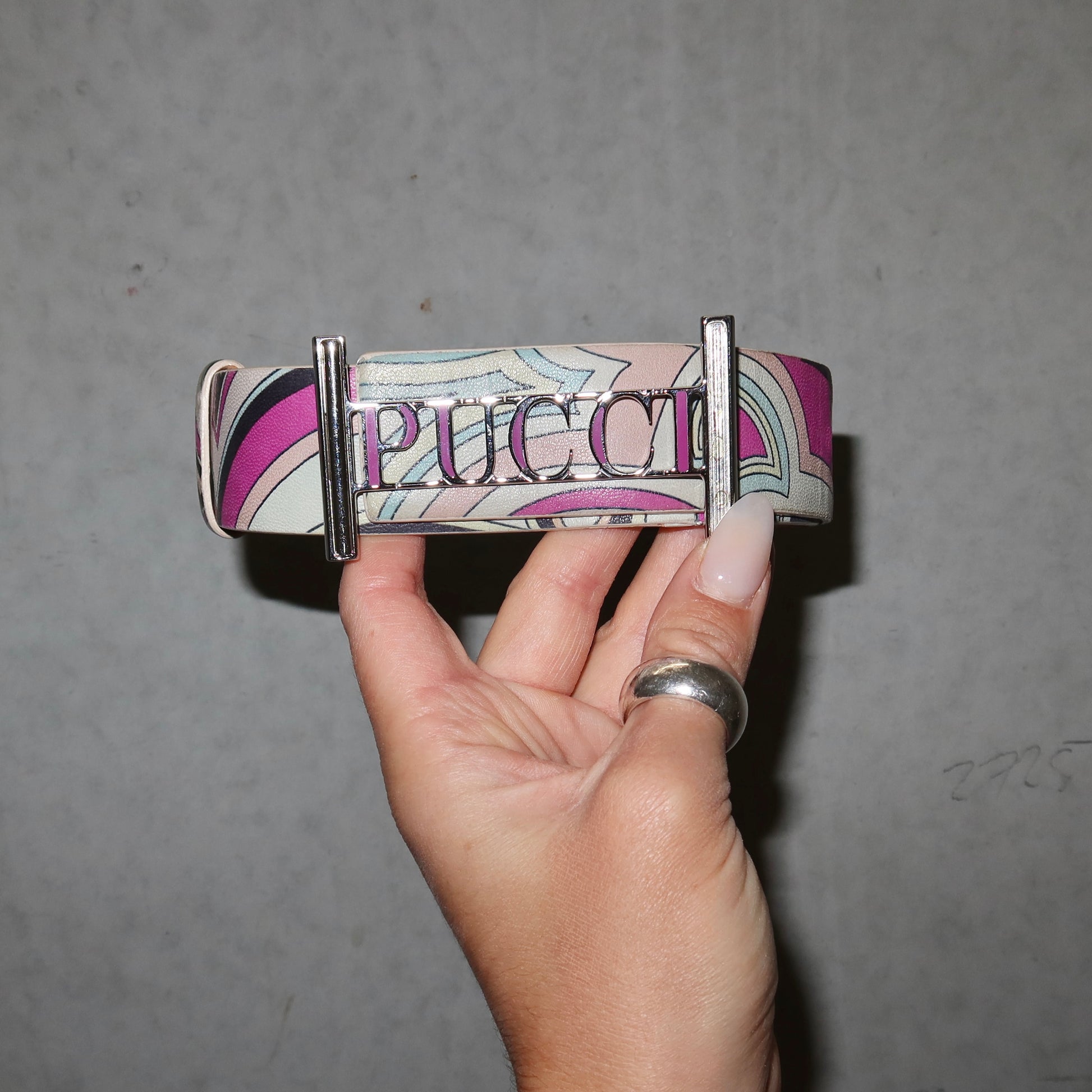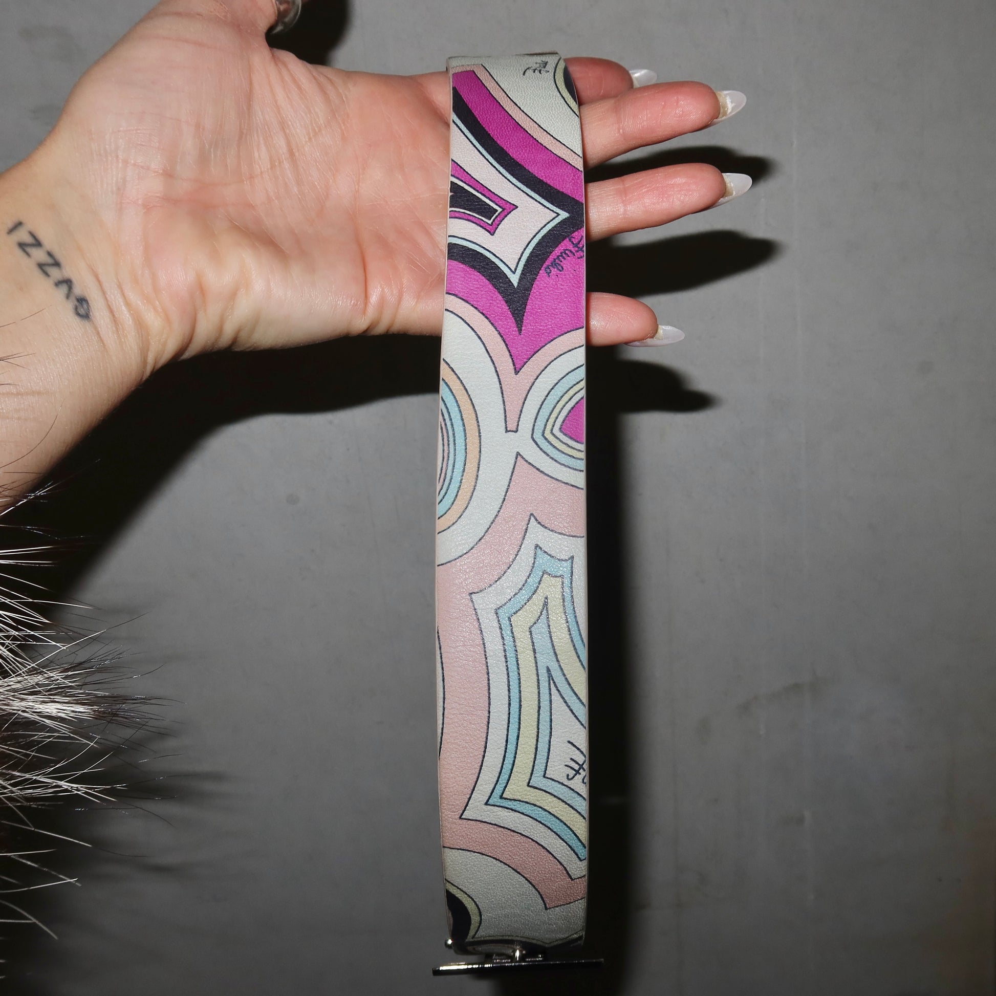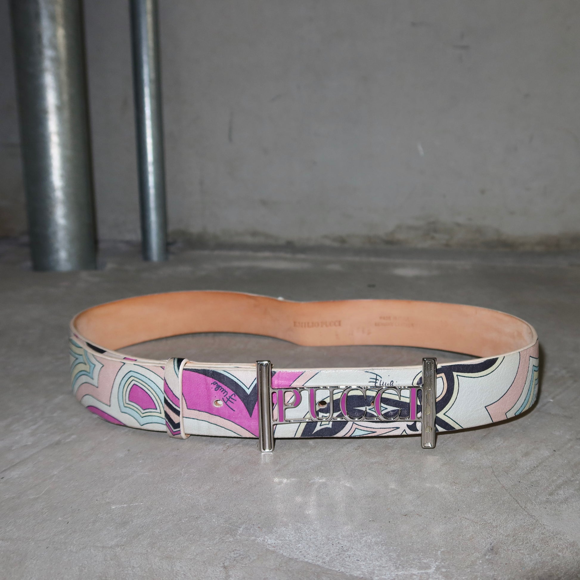 Emilio Pucci printed leather belt with PUCCI spell out buckle.