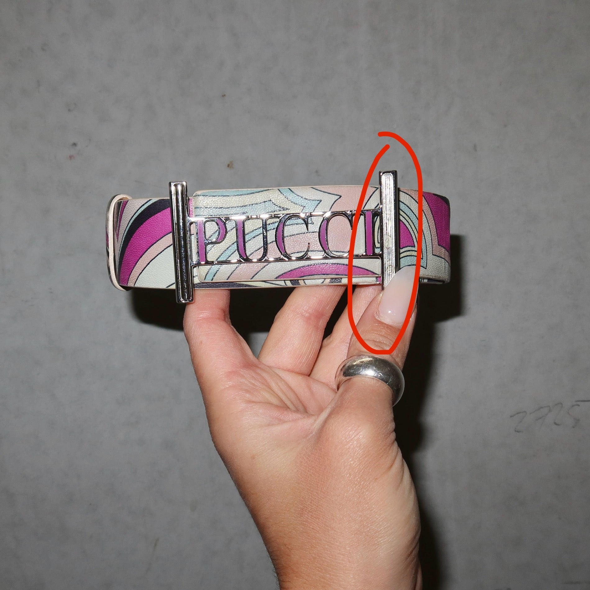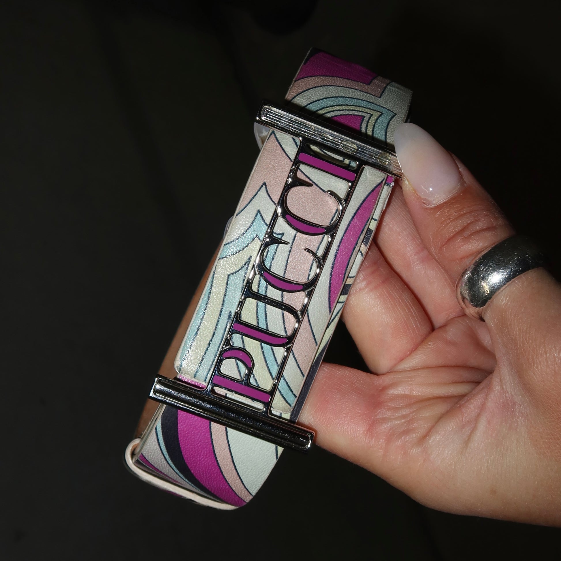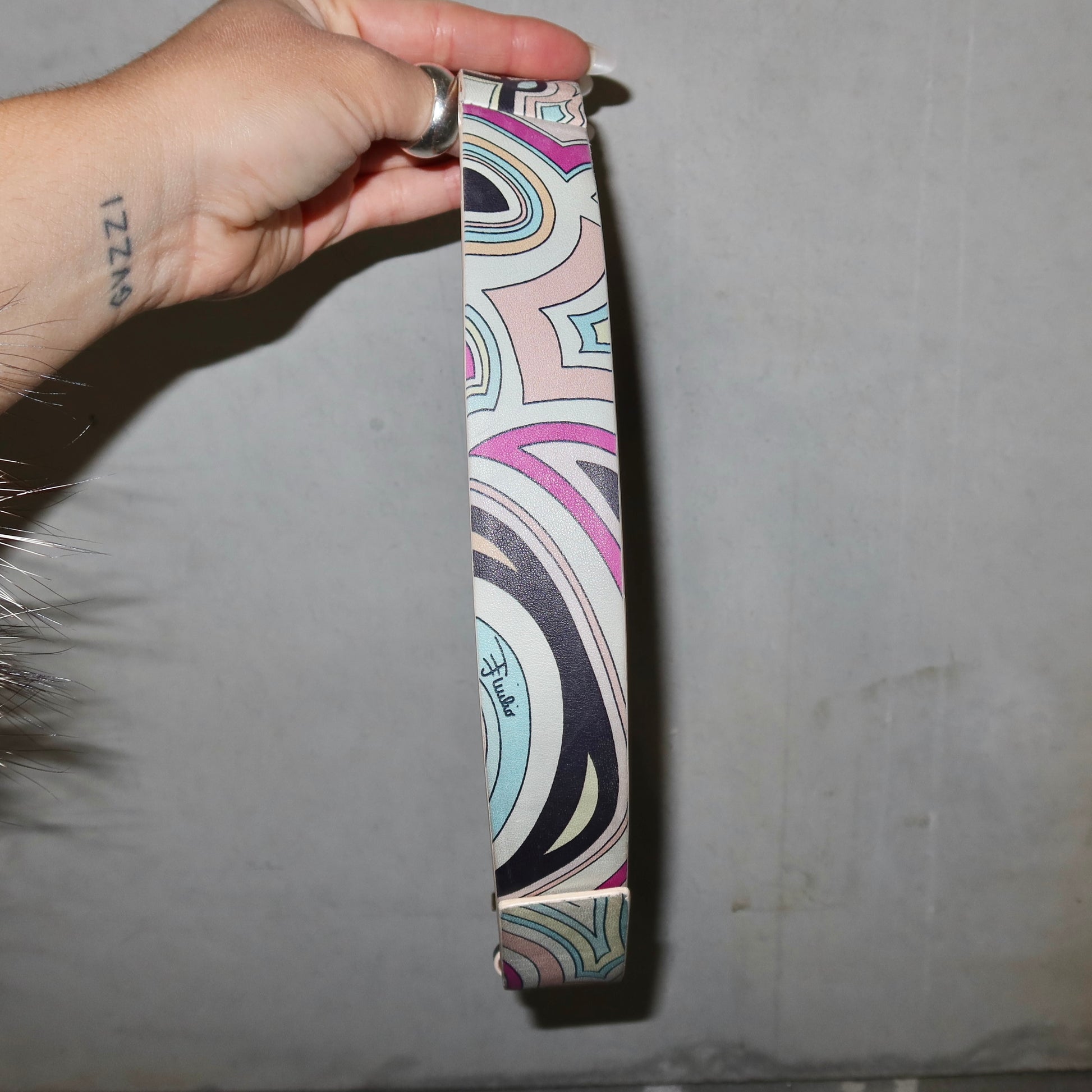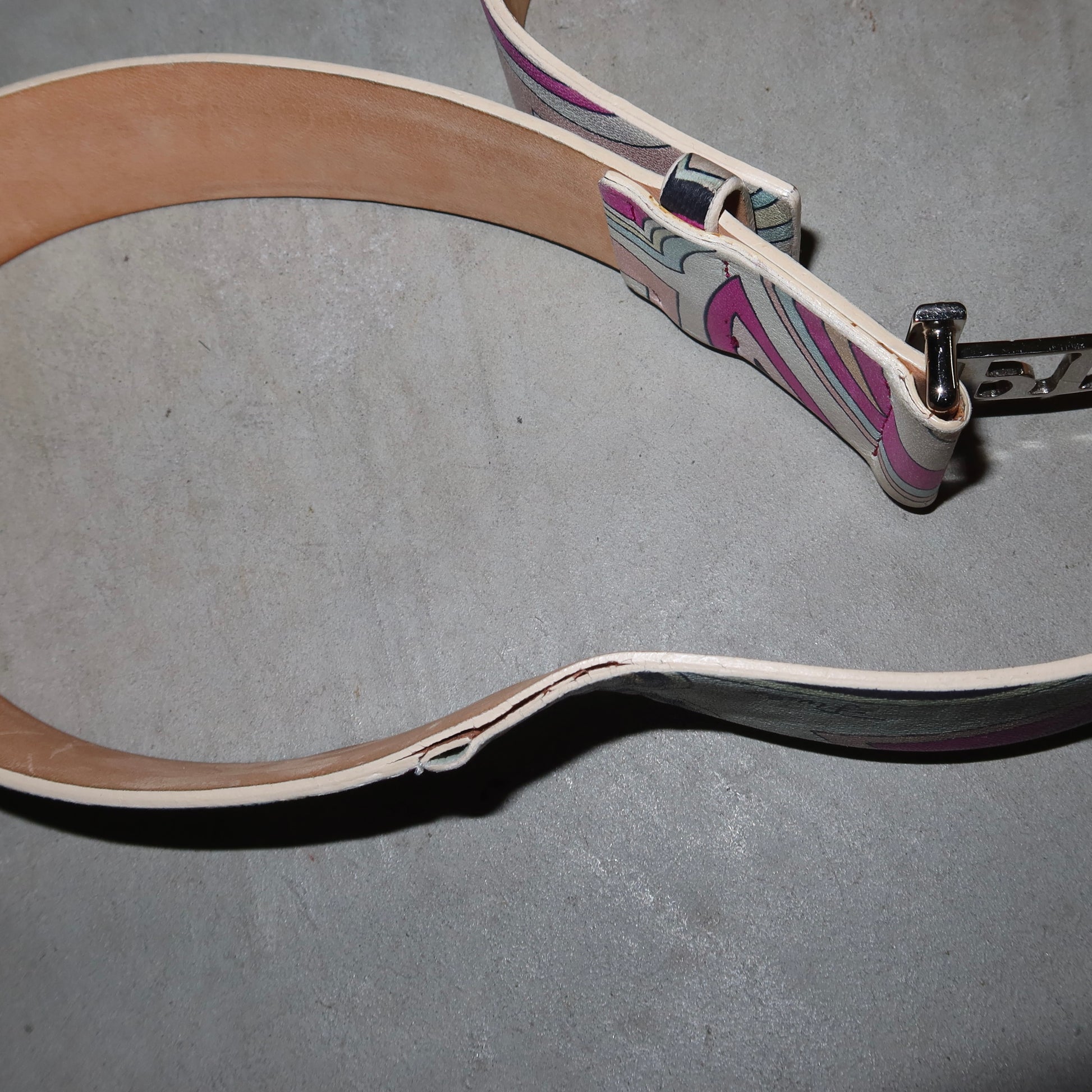 Emilio Pucci printed leather belt with PUCCI spell out buckle.