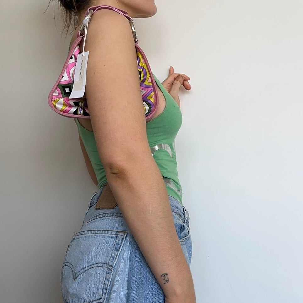 The cutest little Emilio Pucci bag. Satin body with pink suede border and silver hardware on the handles.