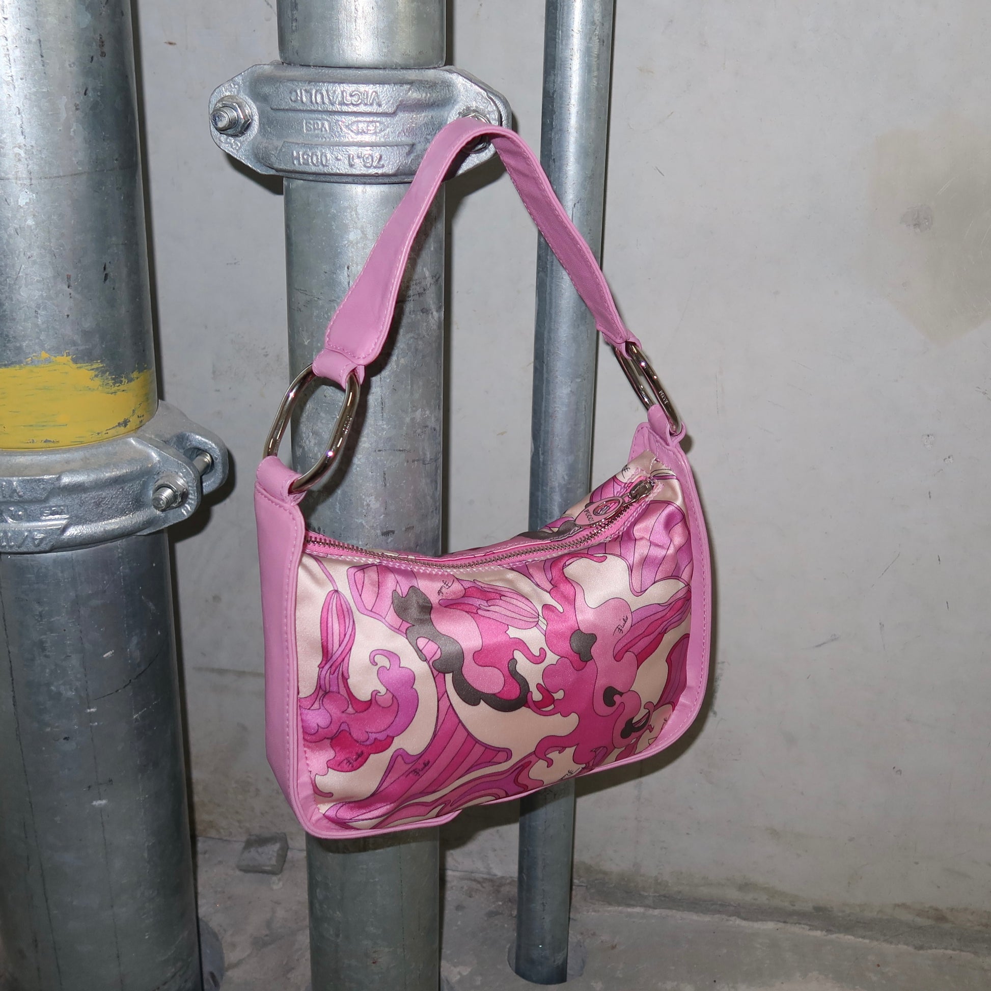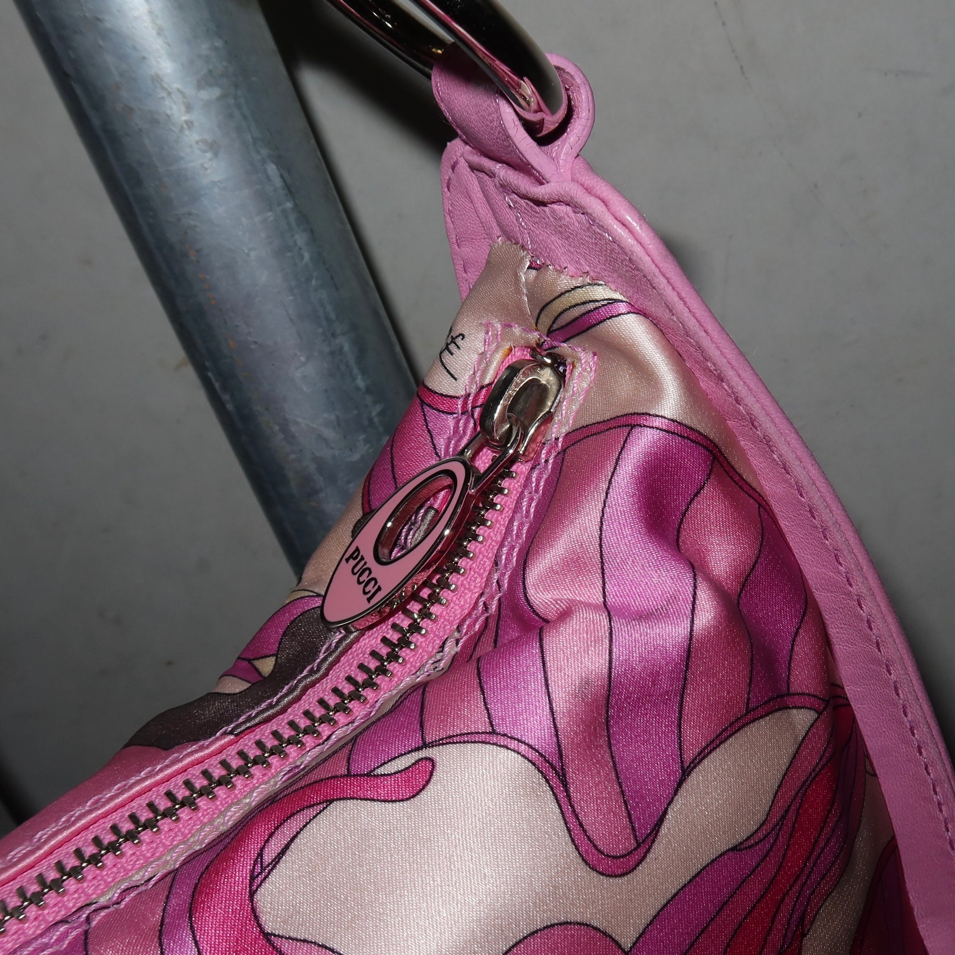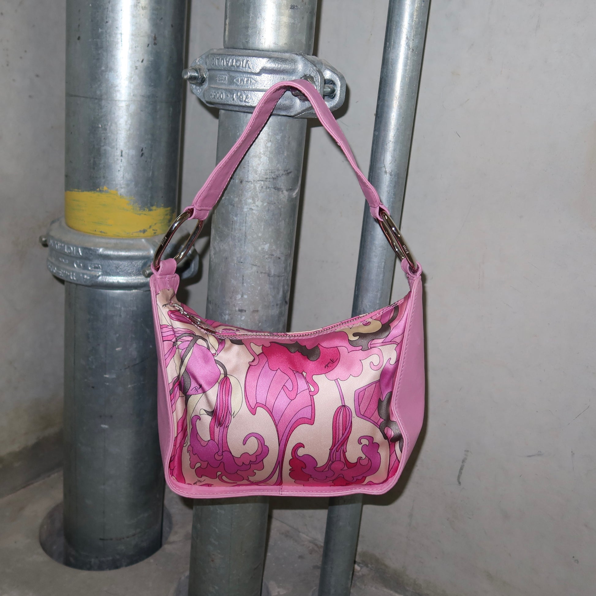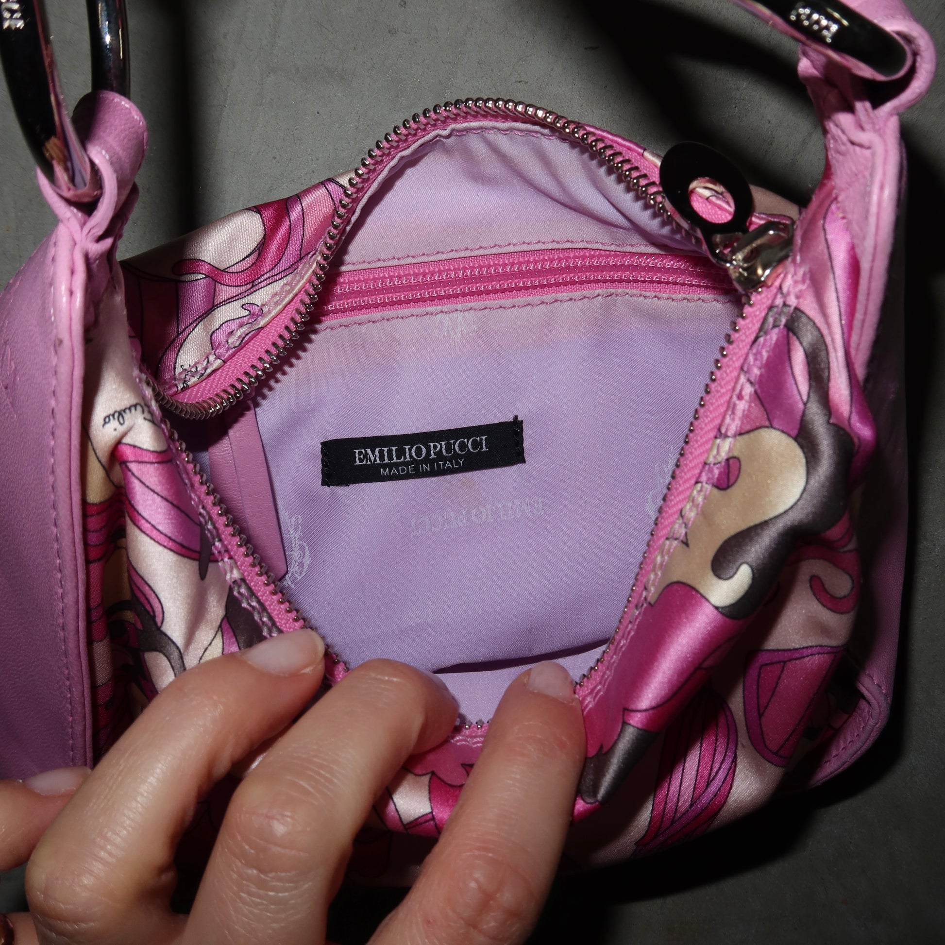 The cutest pink satin Emilio Pucci mini shoulder bag with pink leather rim and silver hardware.
