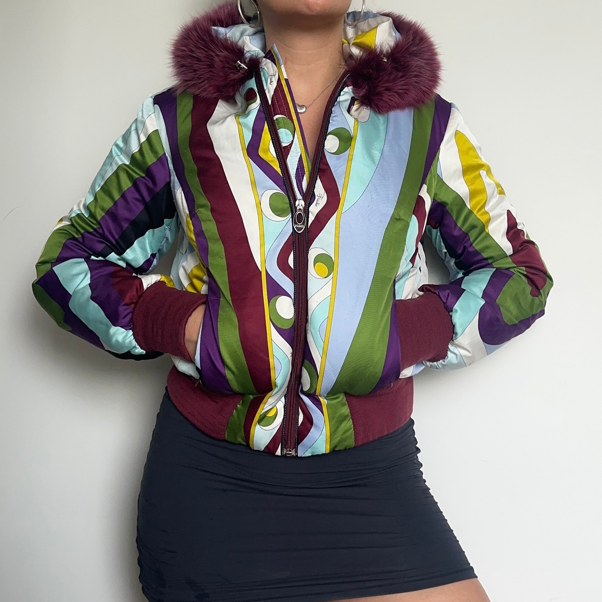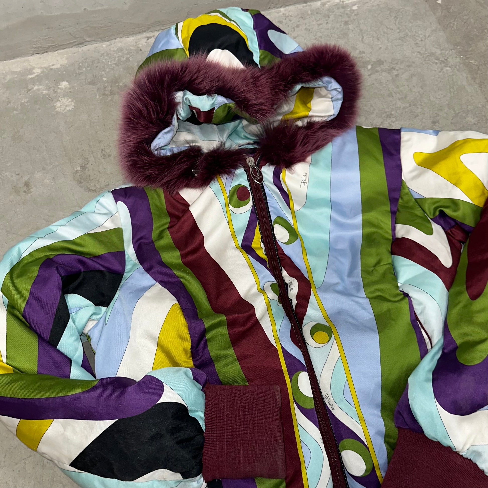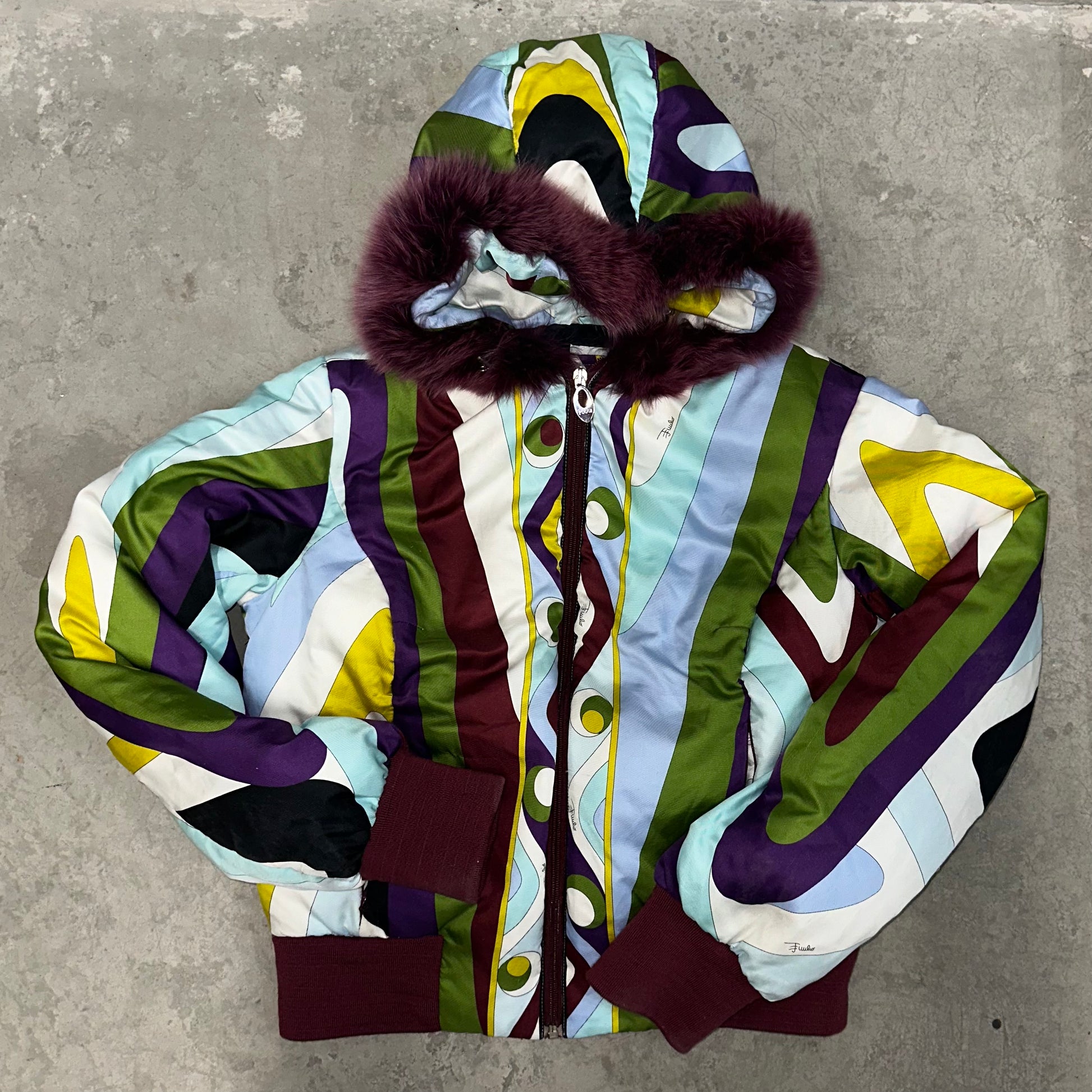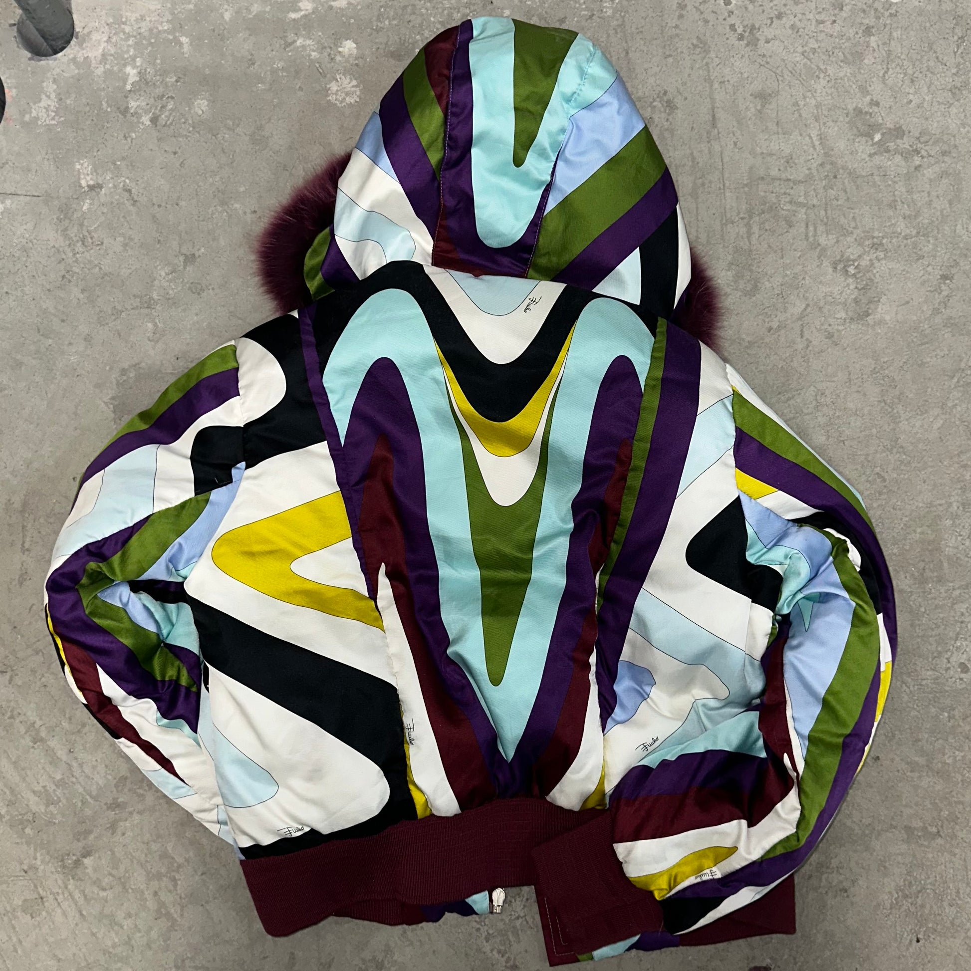 Iconic Emilio Pucci puffer bomber jacket in their iconic FW2004 print. Real fur lined hood (not removable). A custom cropped version can be seen on Kelly Roland in the Lose My Breath music video.