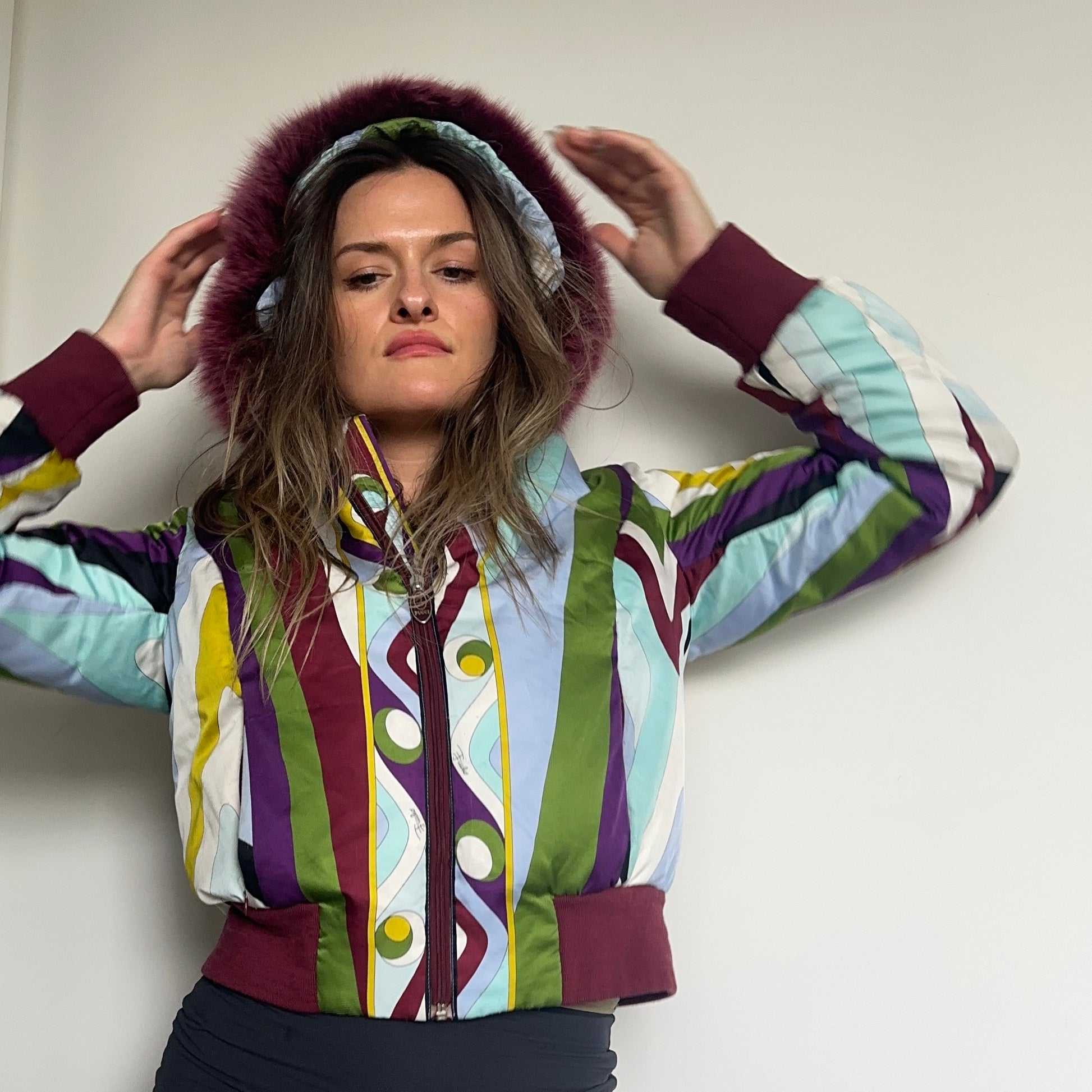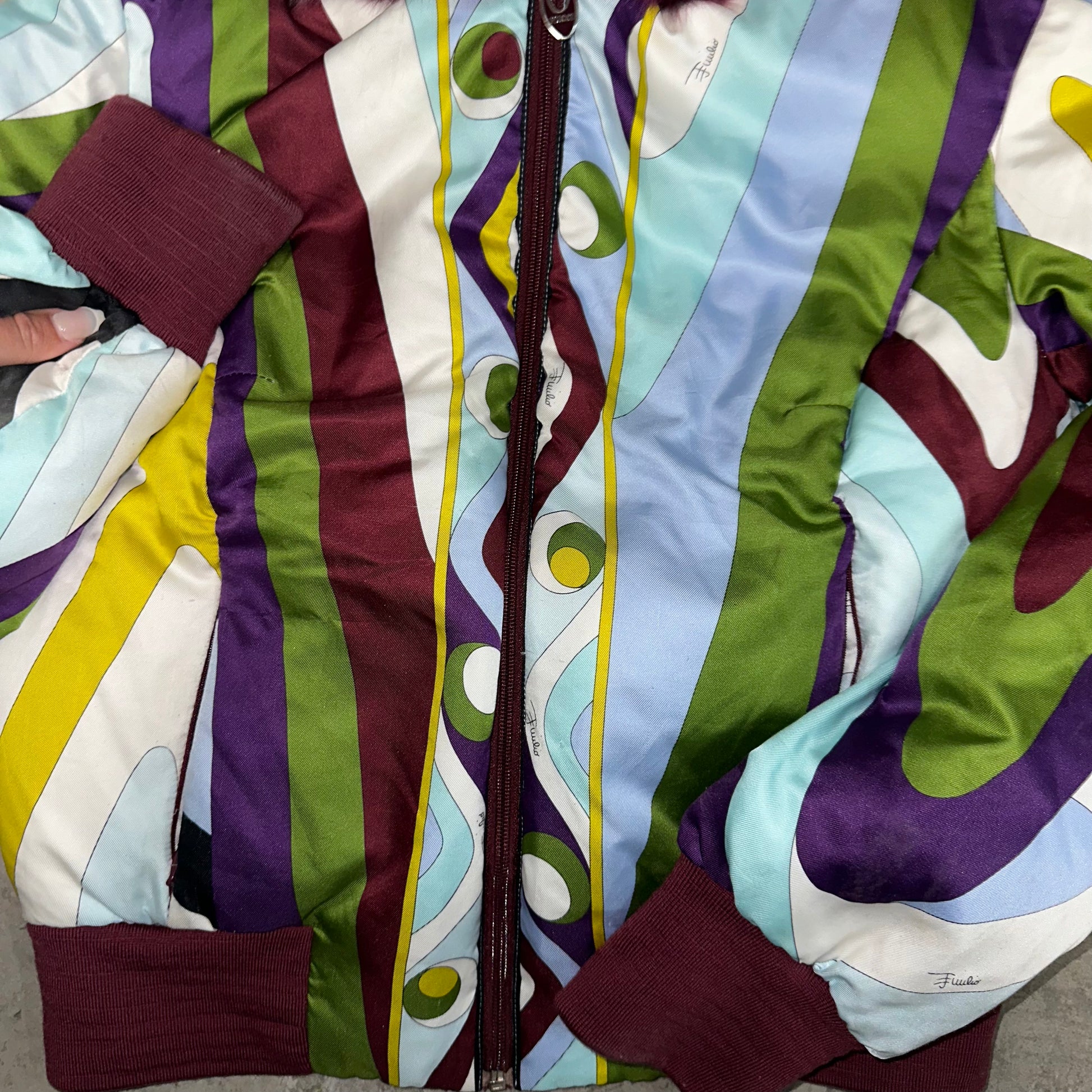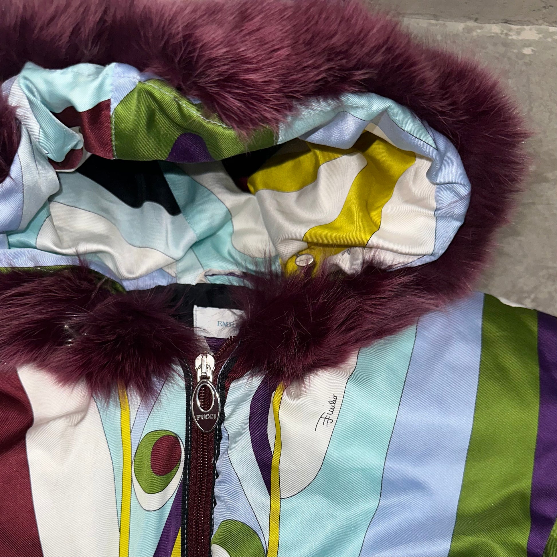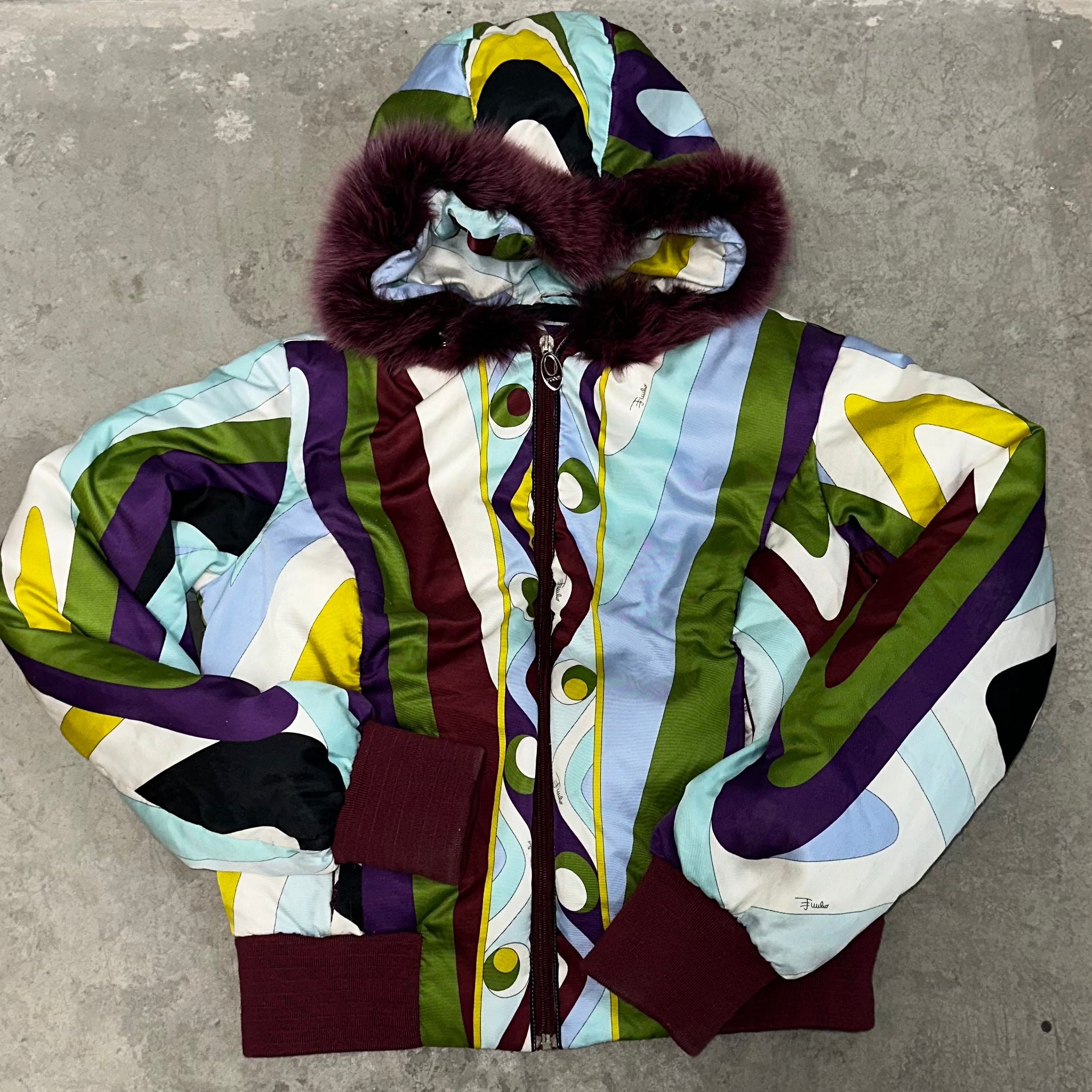 Iconic Emilio Pucci puffer bomber jacket in their iconic FW2004 print. Real fur lined hood (not removable). A custom cropped version can be seen on Kelly Roland in the Lose My Breath music video.