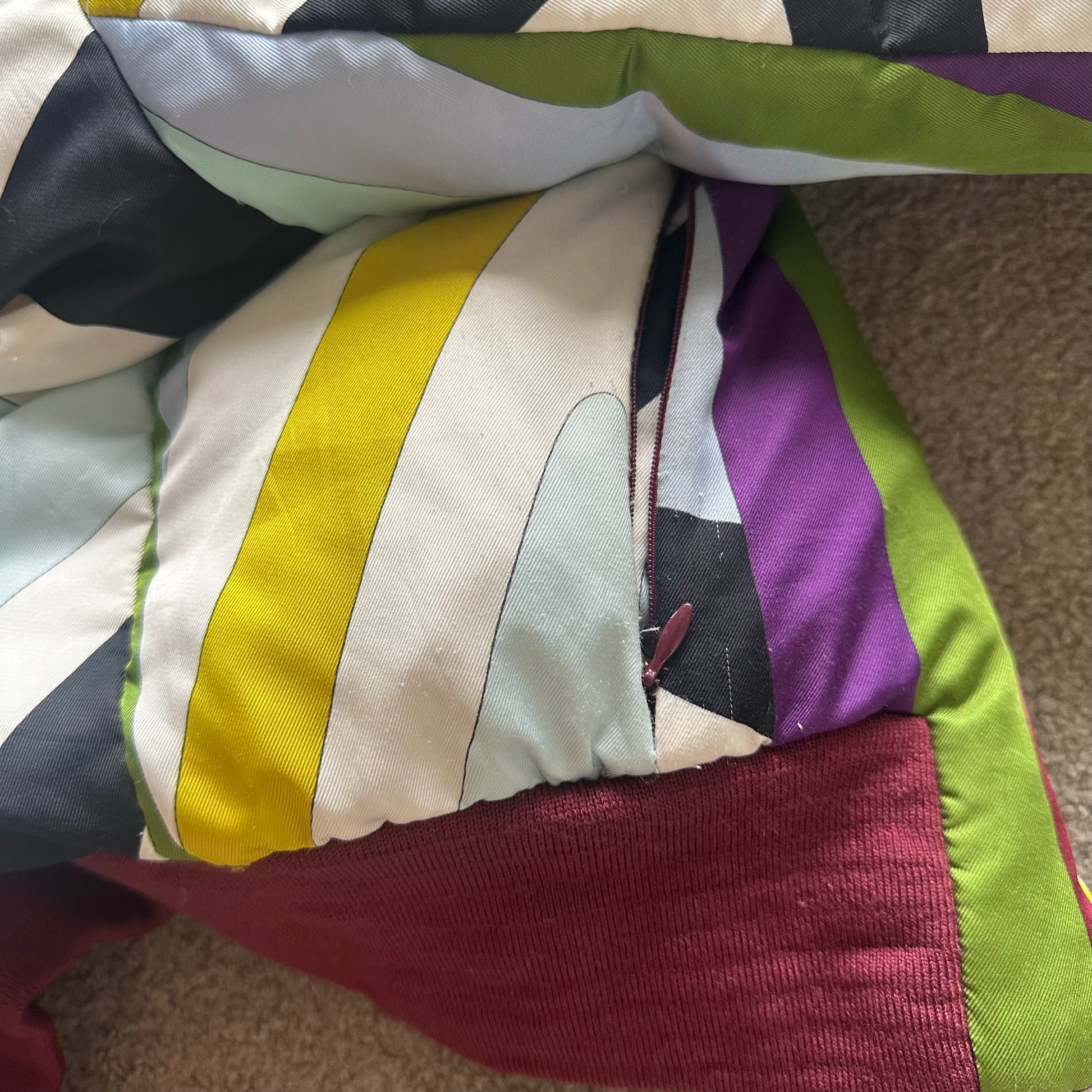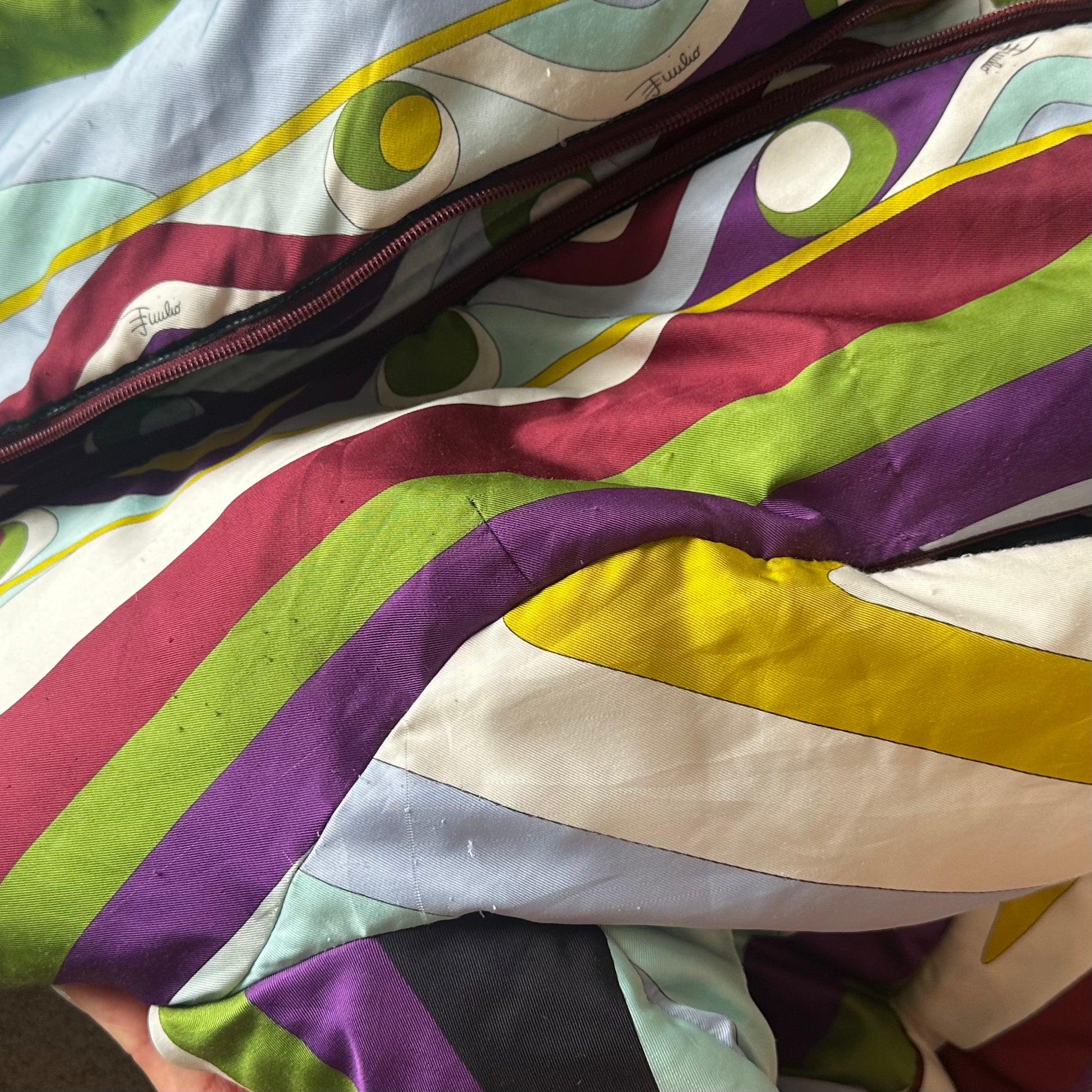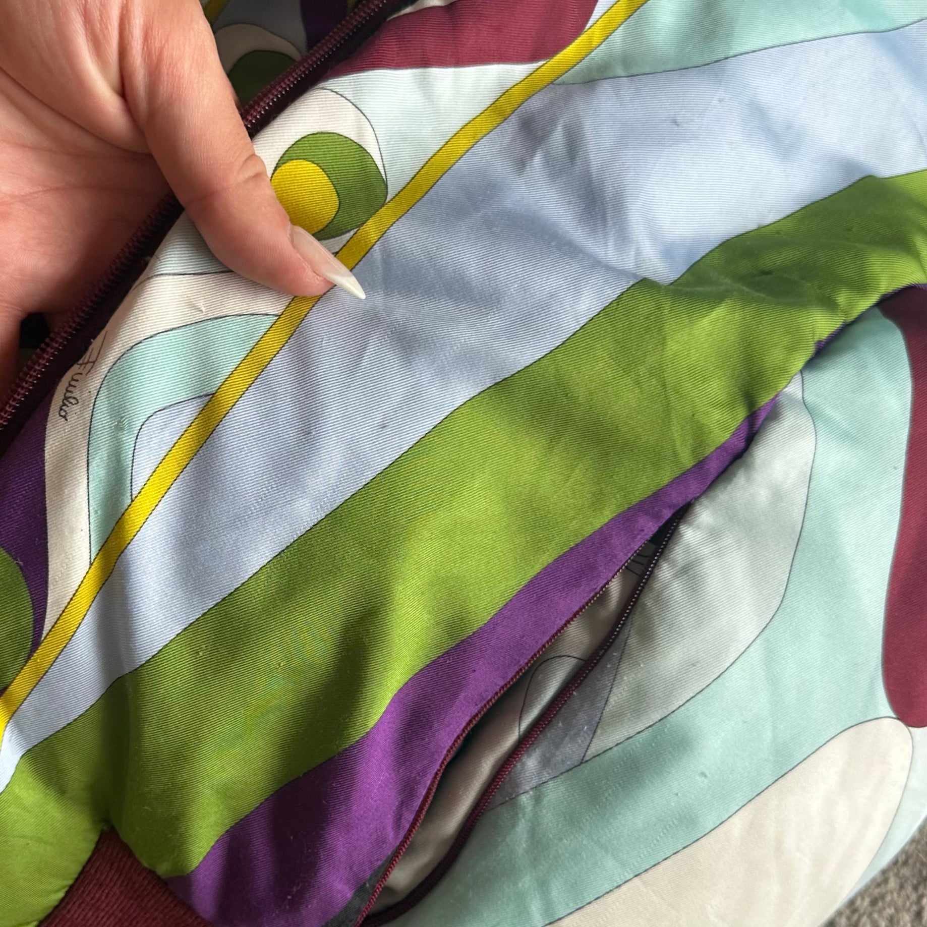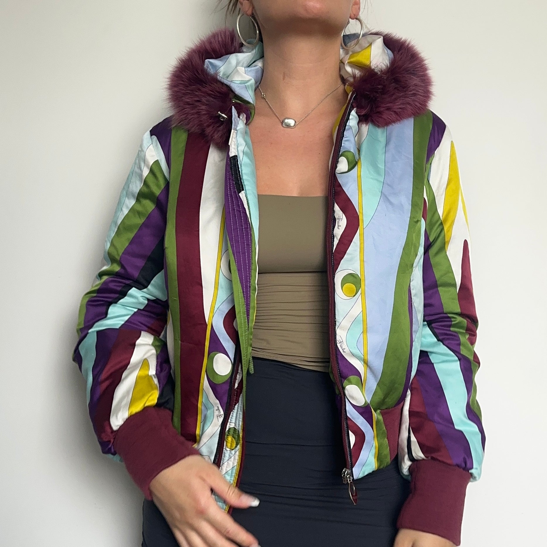 Iconic Emilio Pucci puffer bomber jacket in their iconic FW2004 print. Real fur lined hood (not removable). A custom cropped version can be seen on Kelly Roland in the Lose My Breath music video.