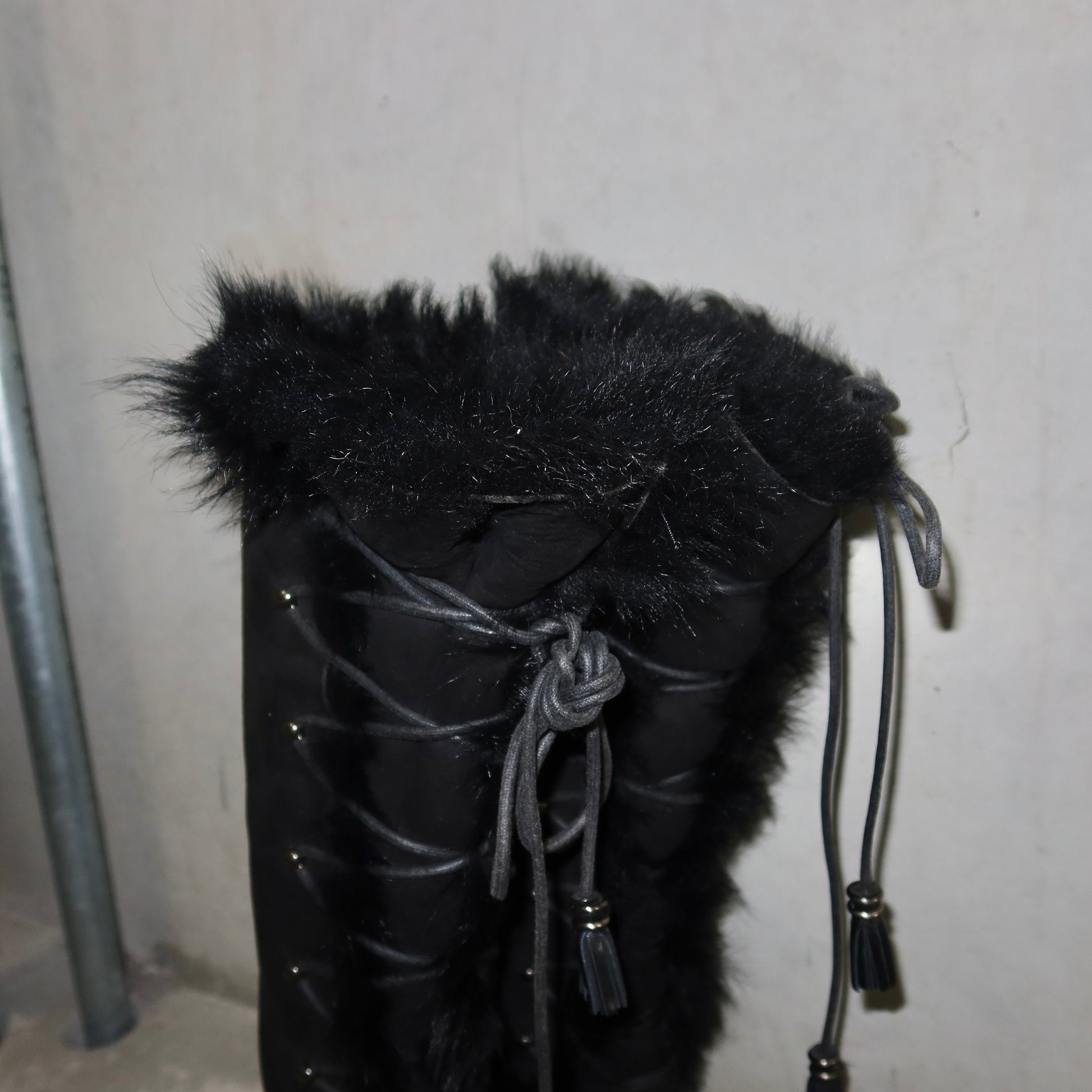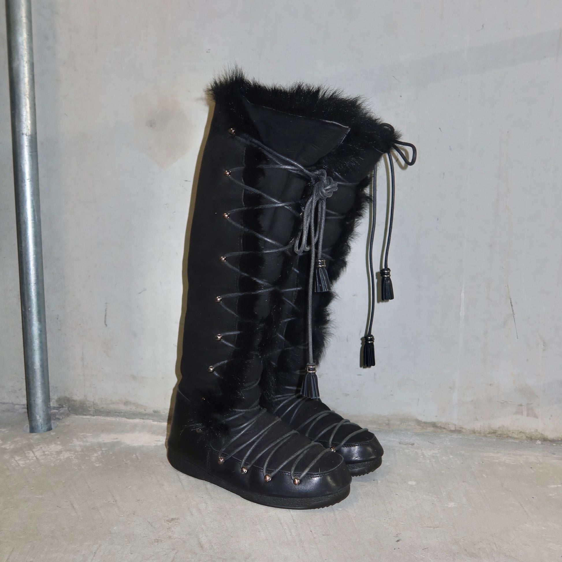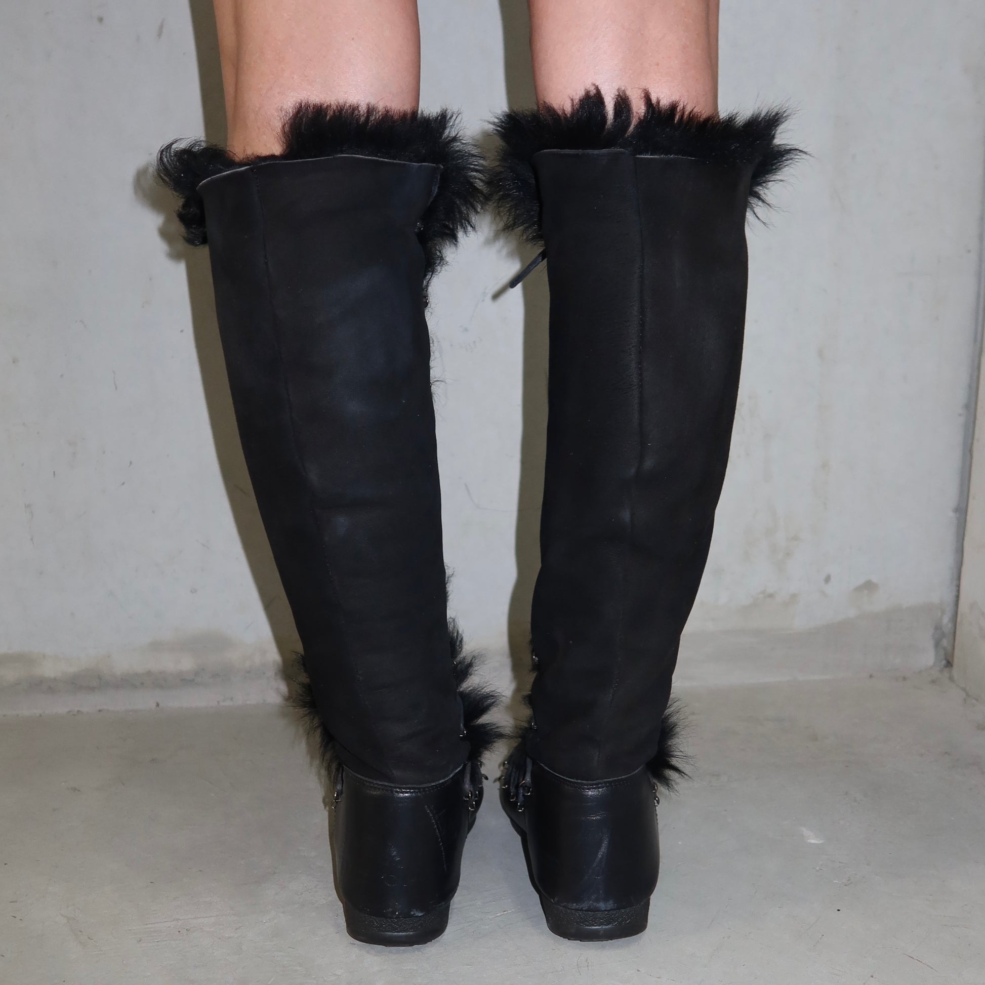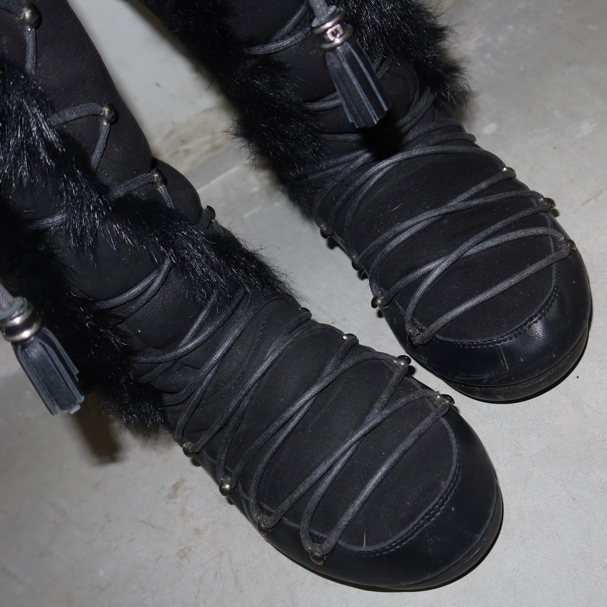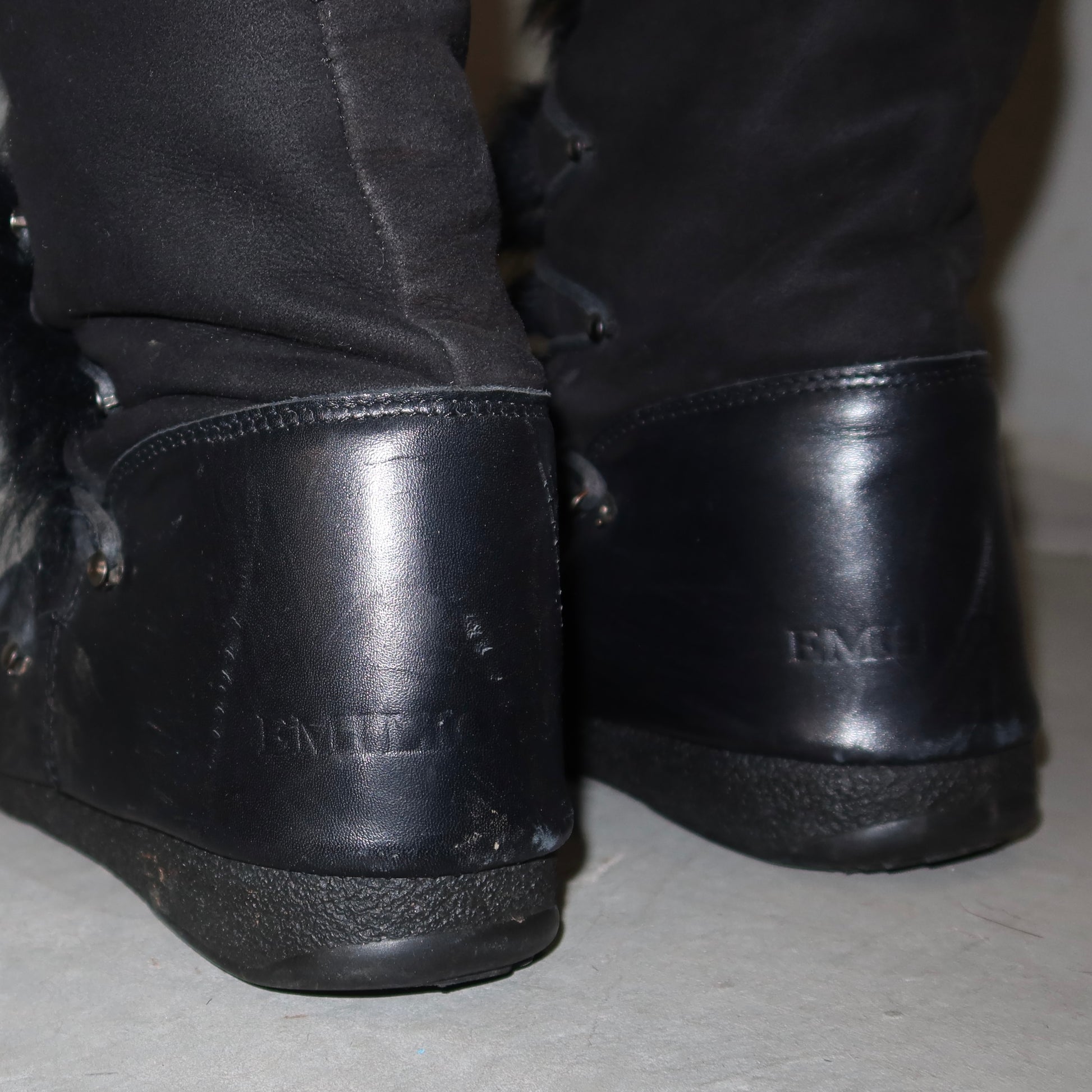 Gorgeous black knee high suede lace up moon boots by Emilio Pucci, with full shearling lining. Leather laces. Wedge heel inside. Subtle EMILIO PUCCI embossing on the back heels.