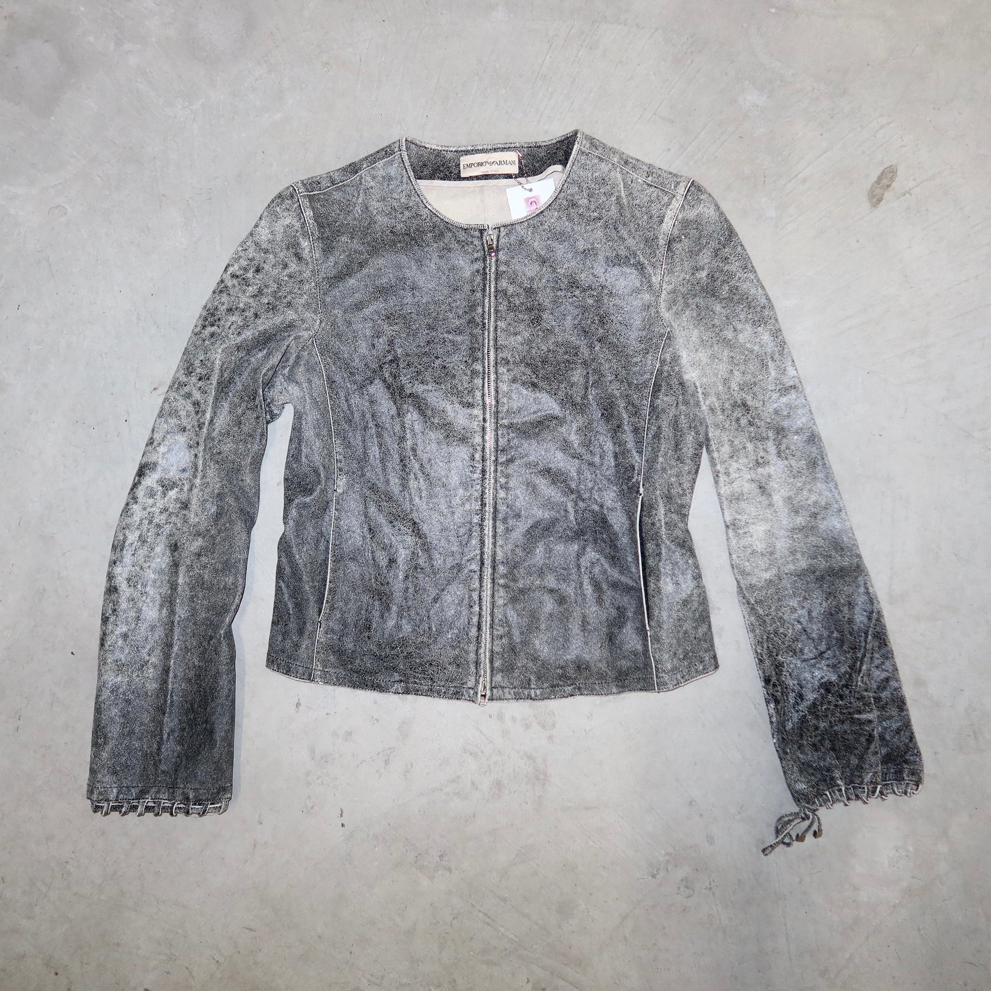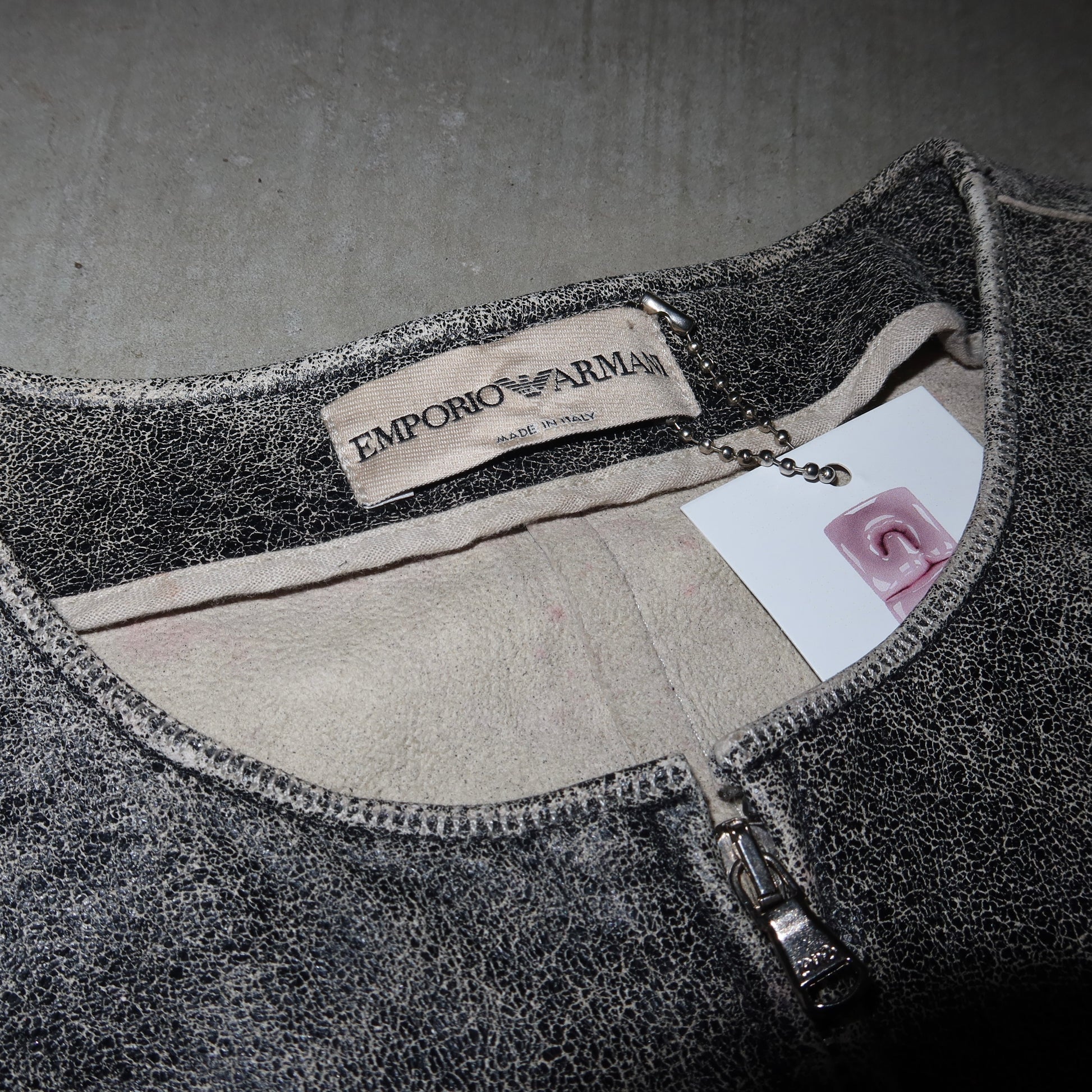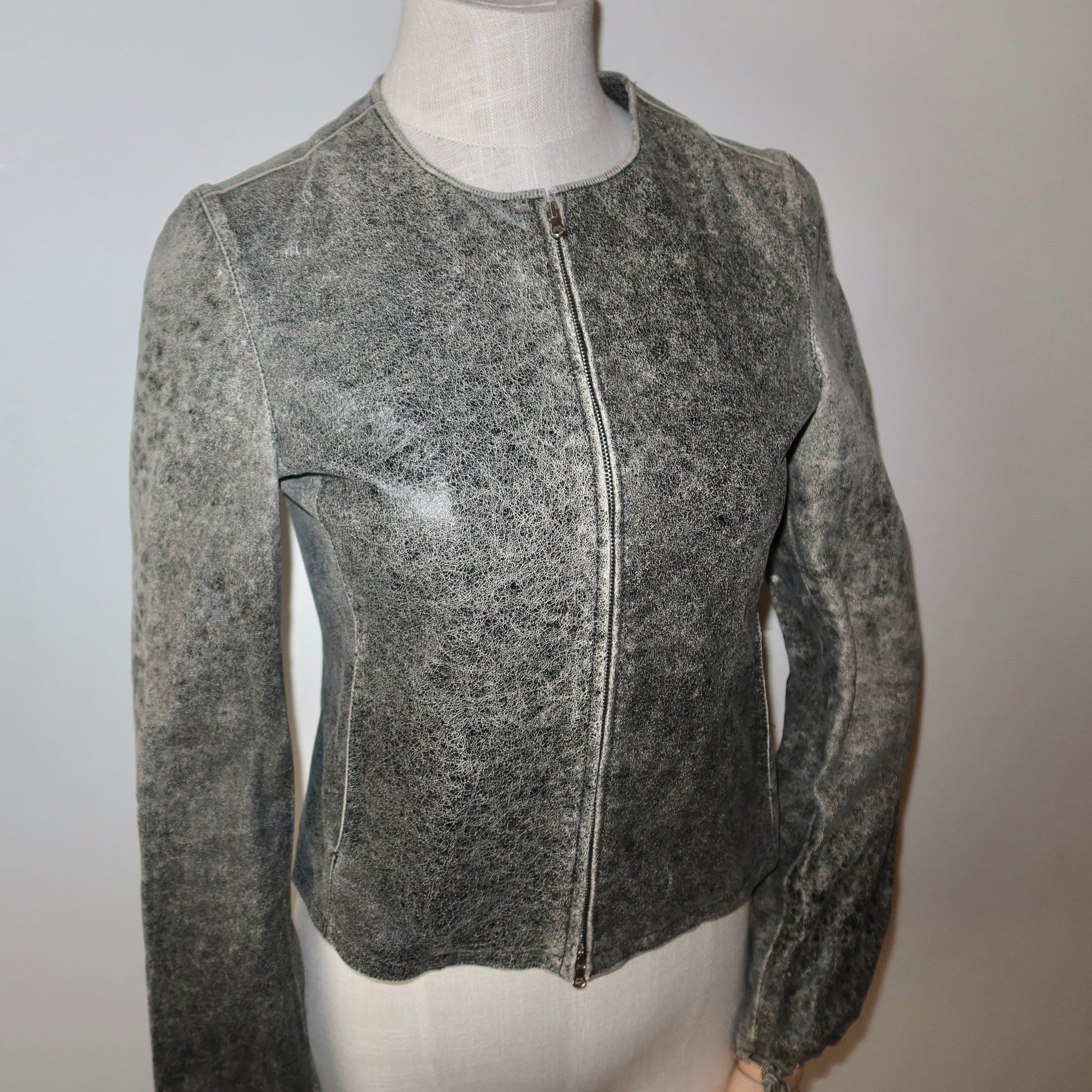 The most beautiful grey leather Emporio Armani leather jacket with the cutest sleeve details. The silhouette of this jacket is extremely flattering. The leather is very thin and lightweight with an aged look to it. Suede lining!