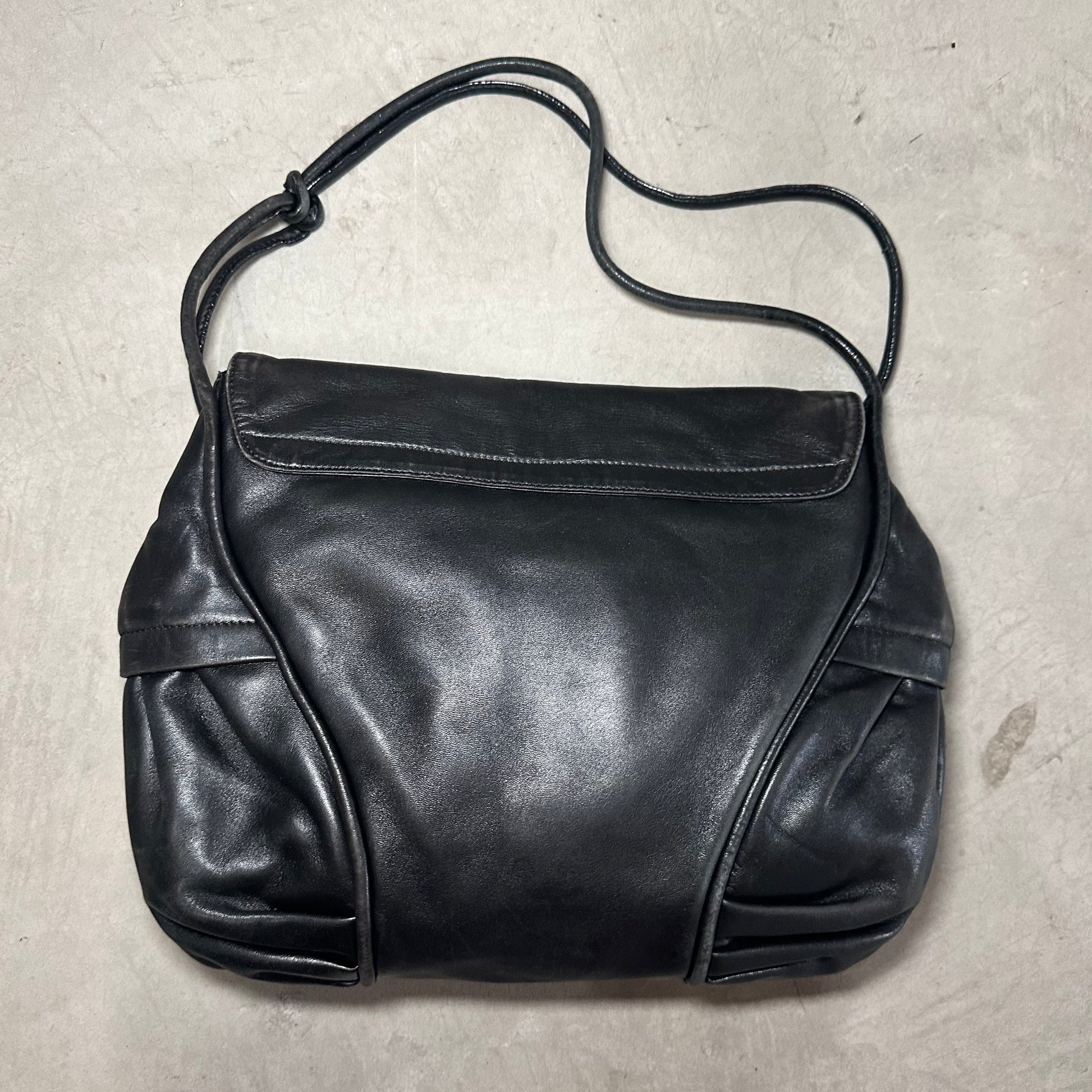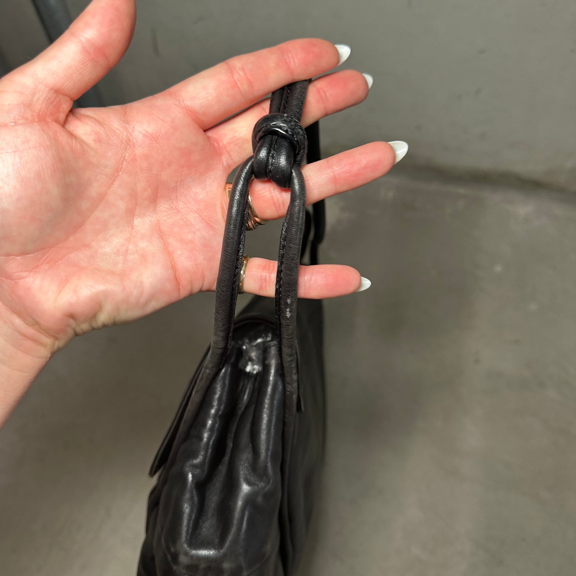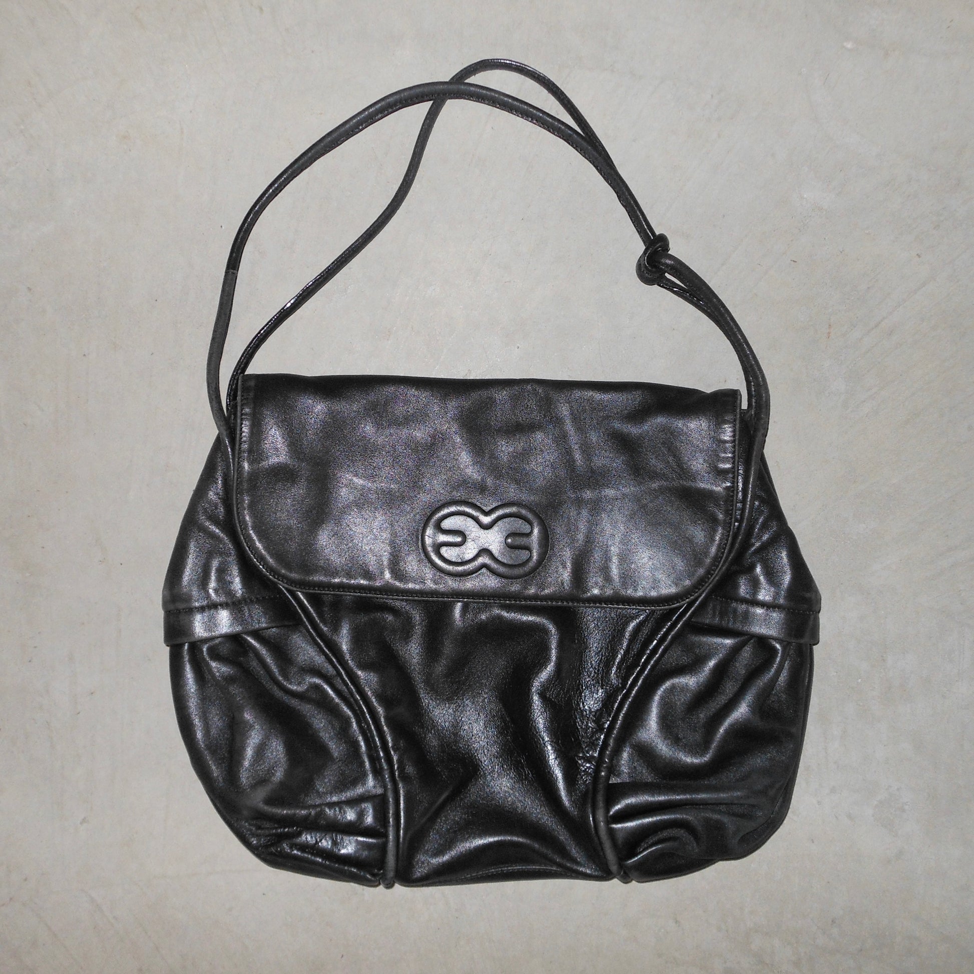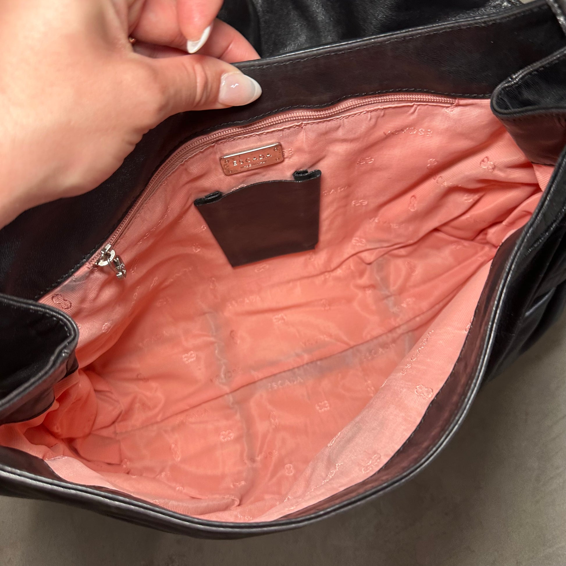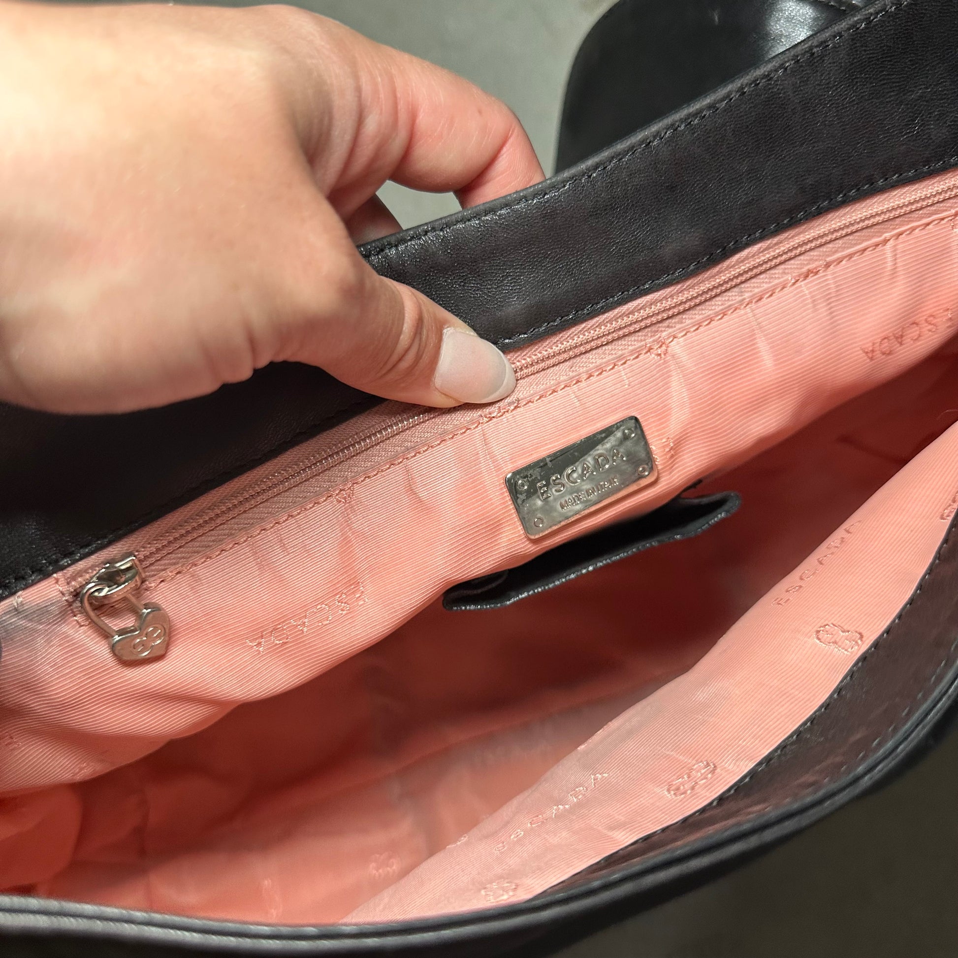 Gorgeously chic Escada leather bag with branded flap closure. Cute knotted handle detail.