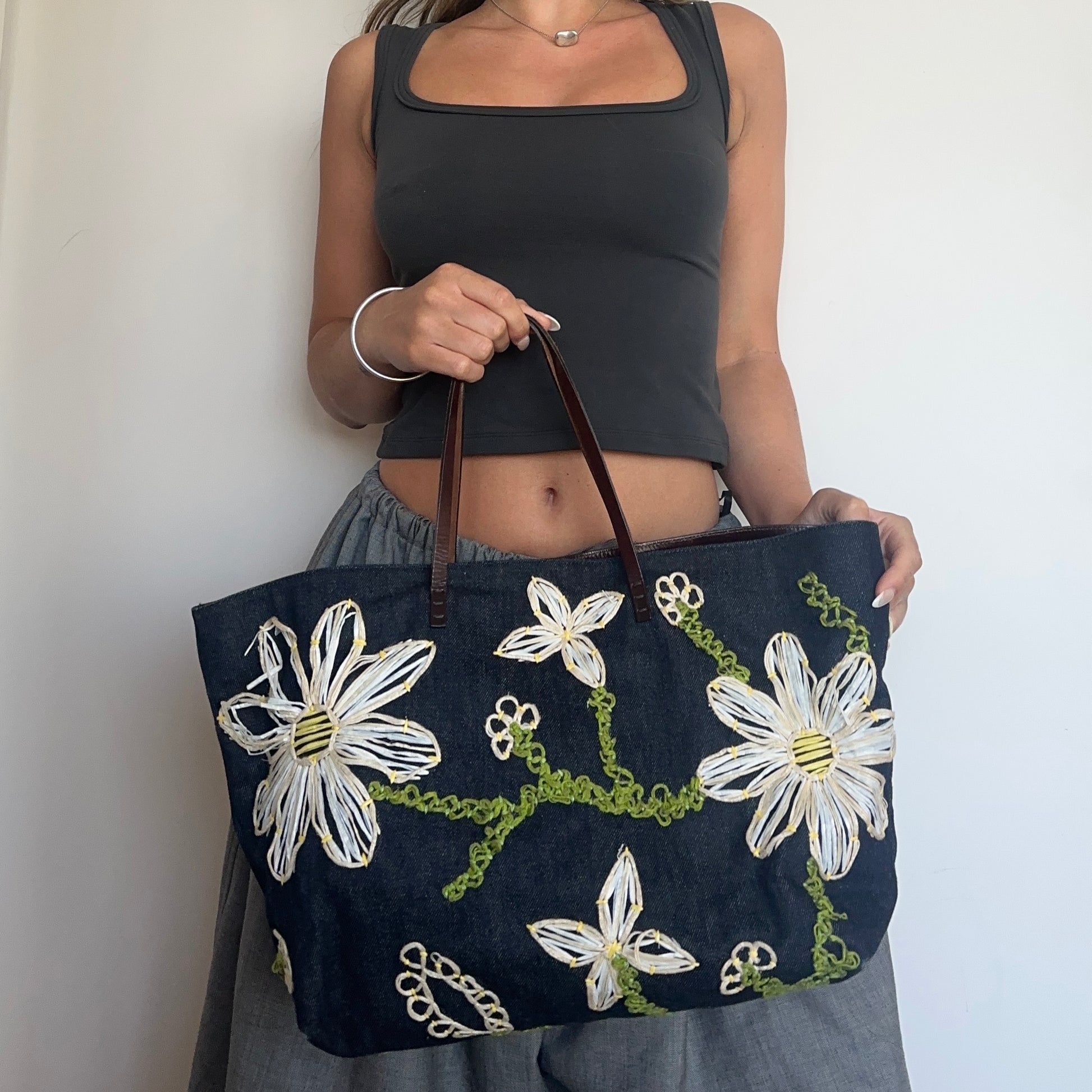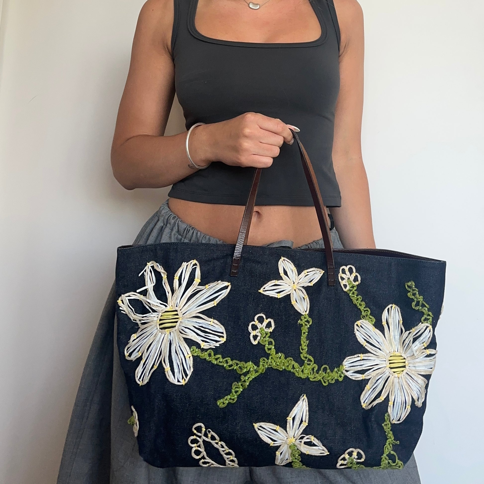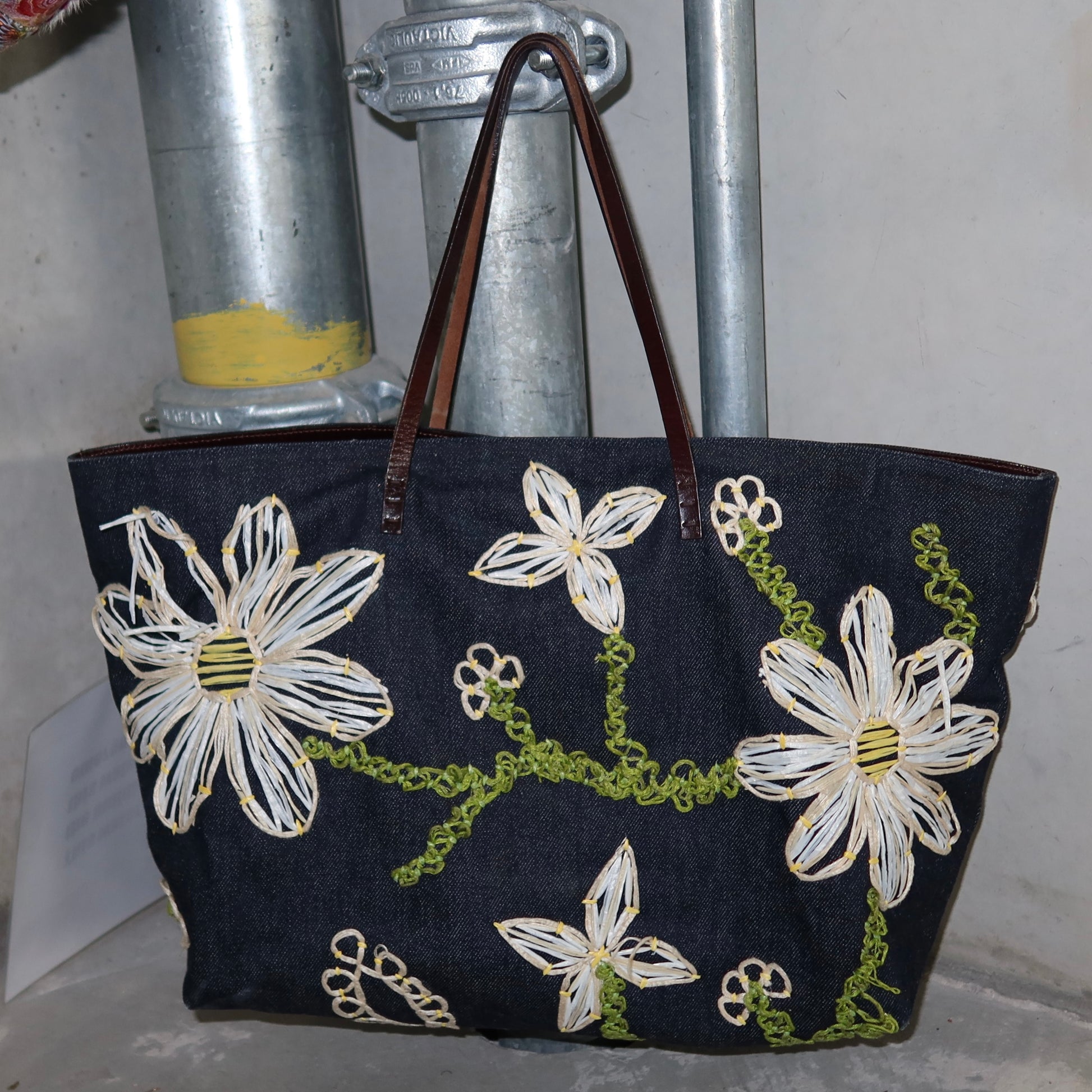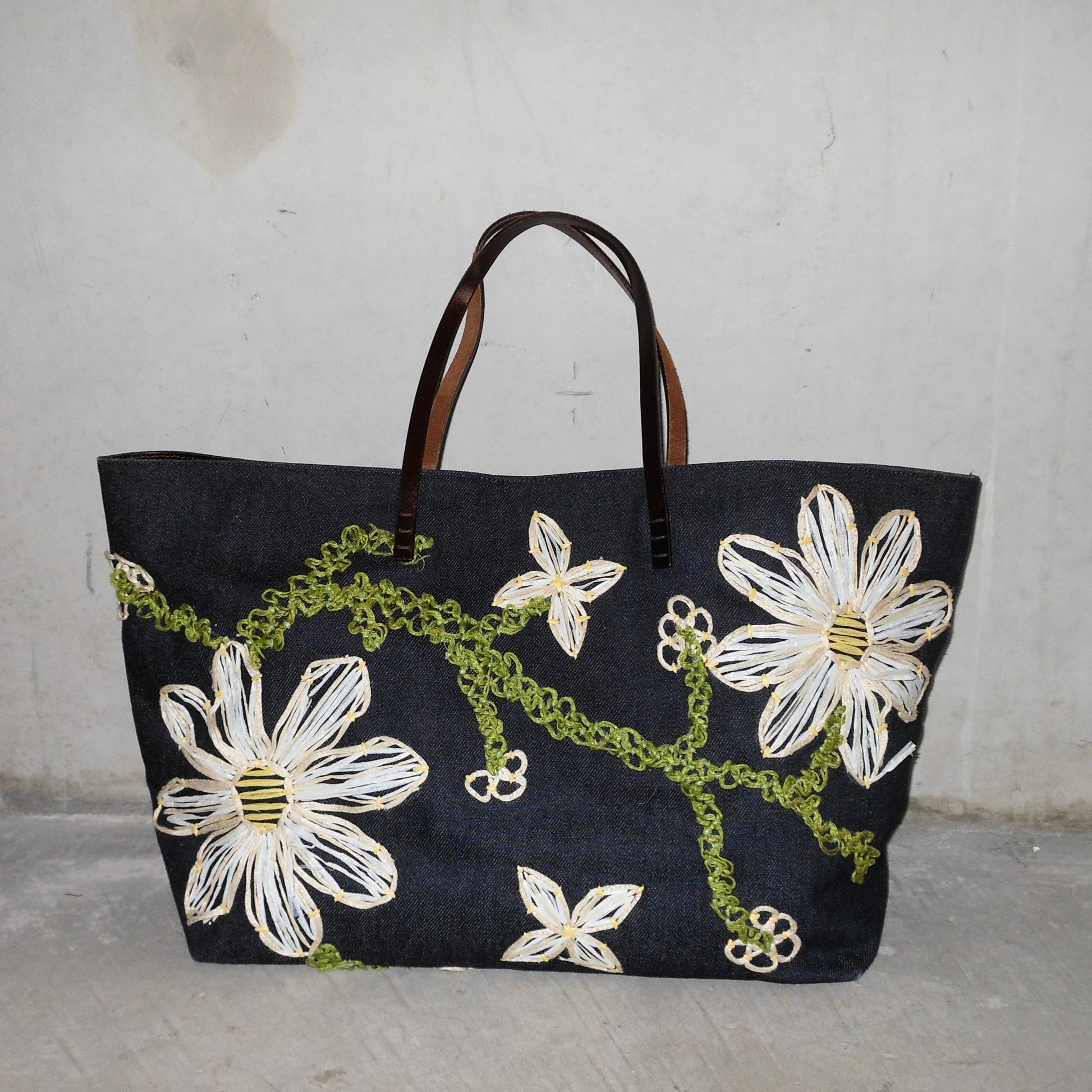 Amazing dark denim tote with floral embroidery and dark brown leather handles from Karl Lagerfeld's reign with the brand. Green satin lining.