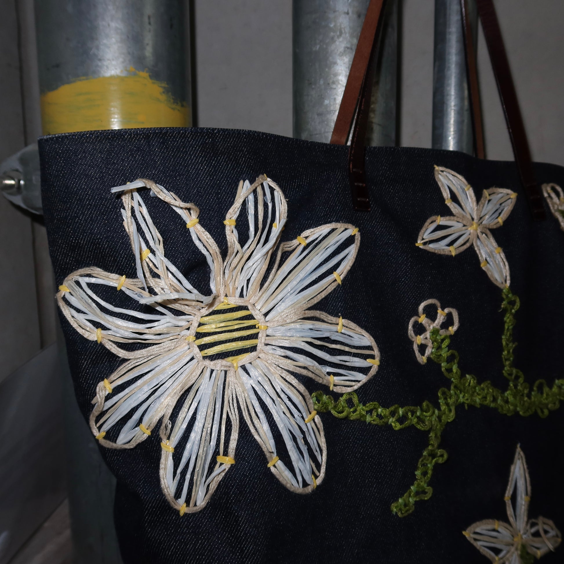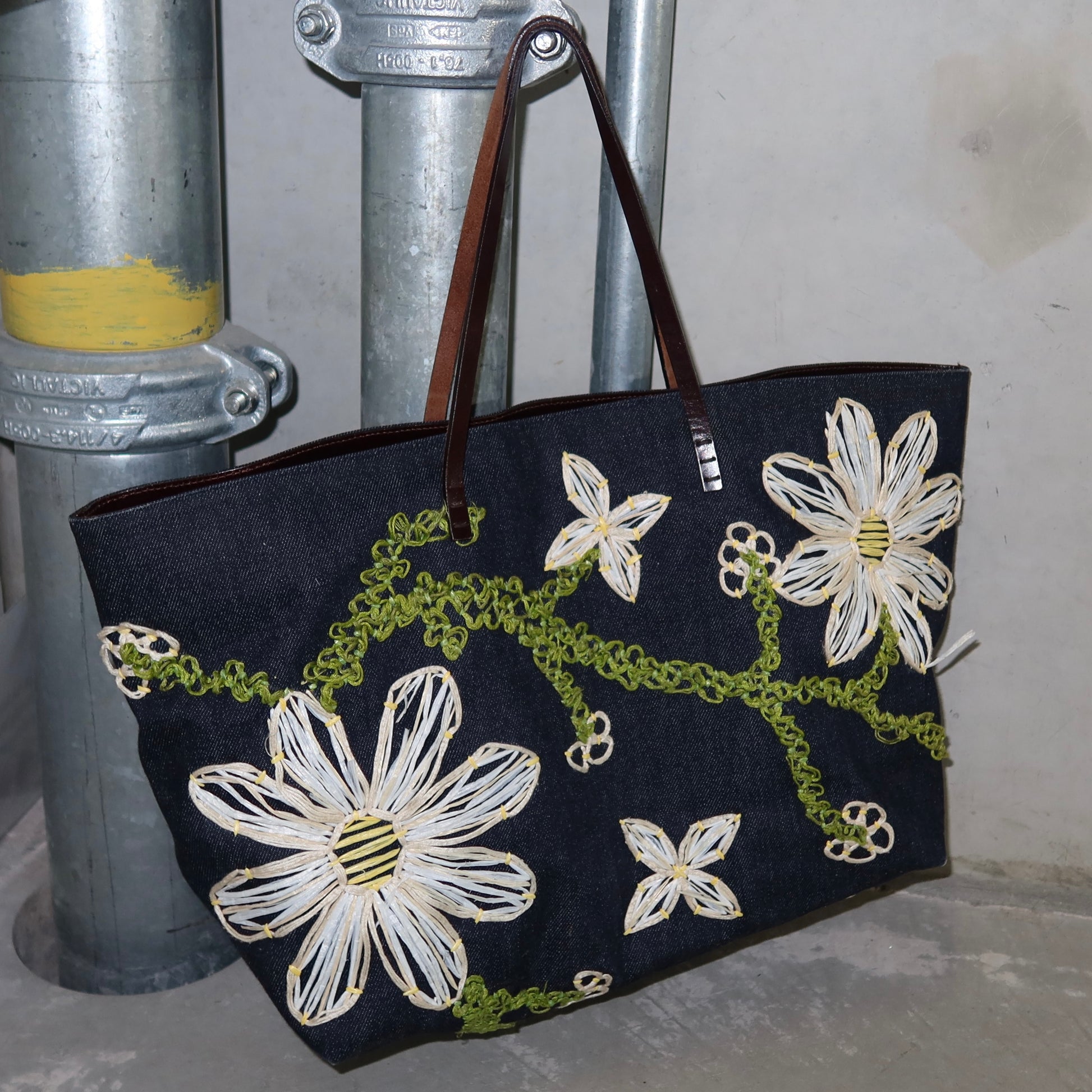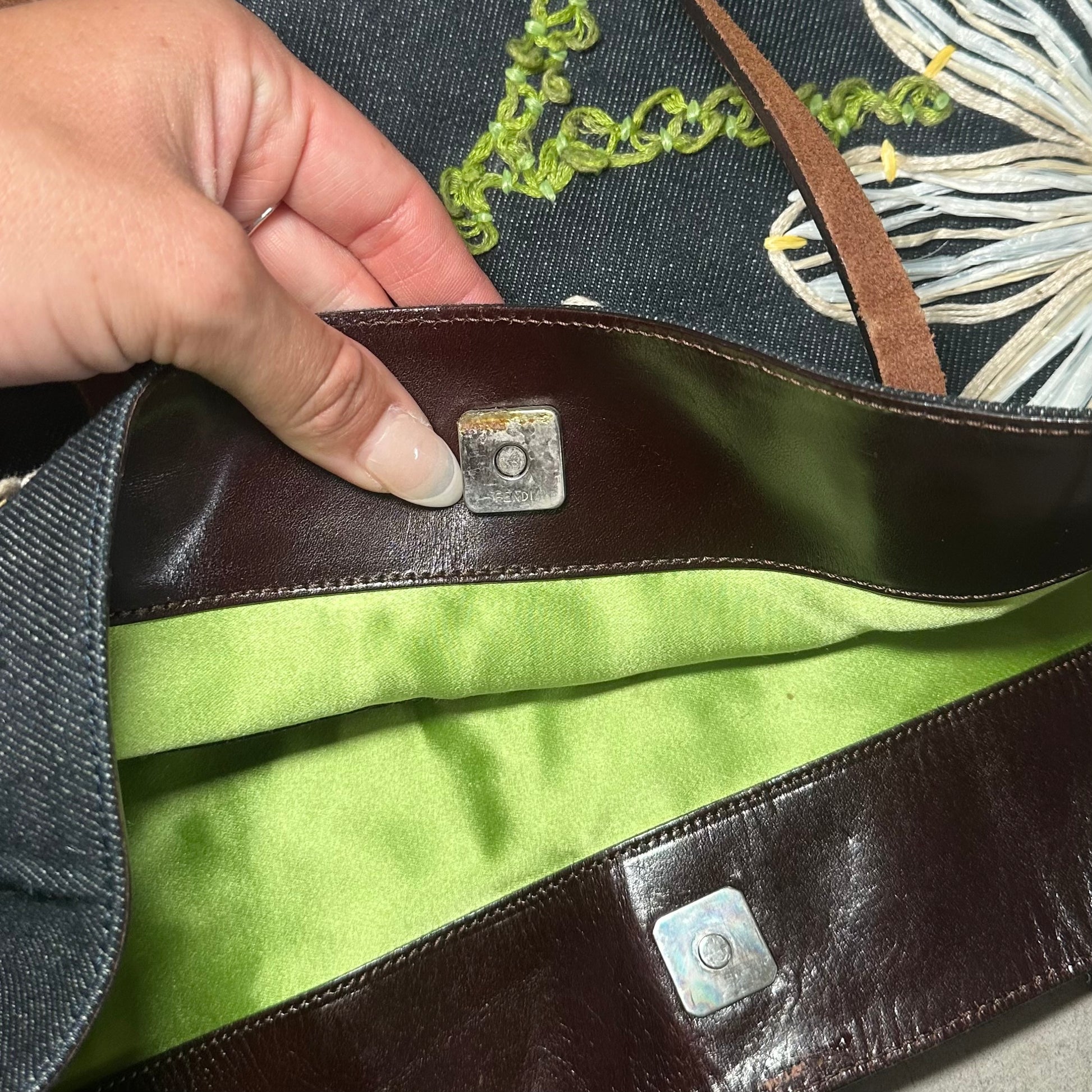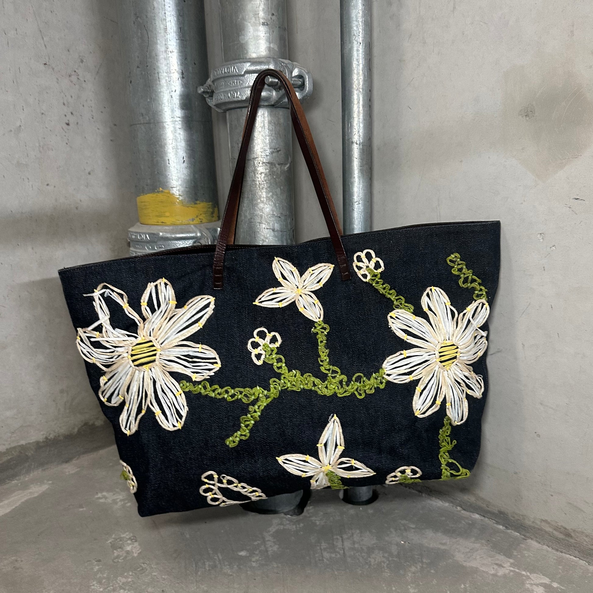Amazing dark denim tote with floral embroidery and dark brown leather handles from Karl Lagerfeld's reign with the brand. Green satin lining.