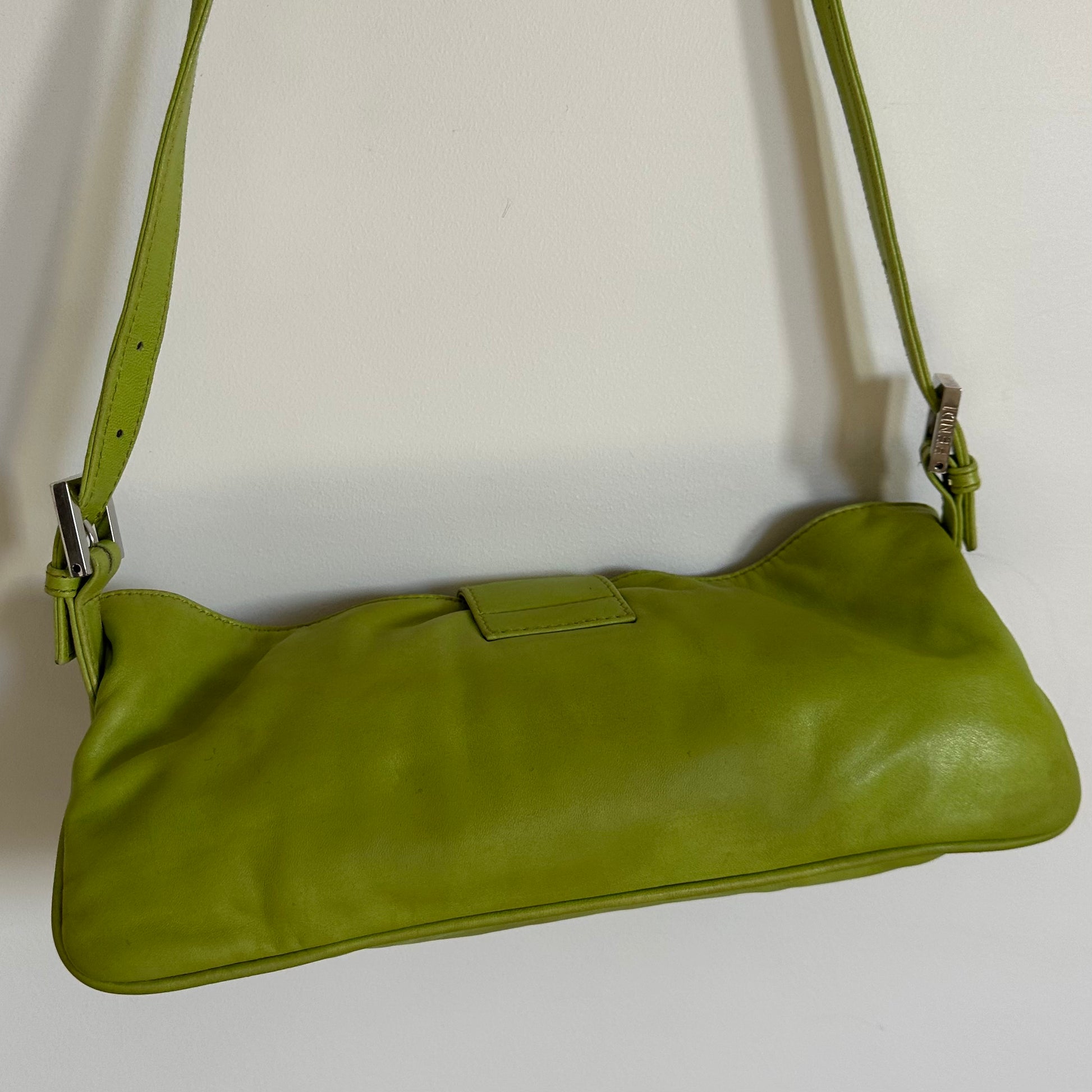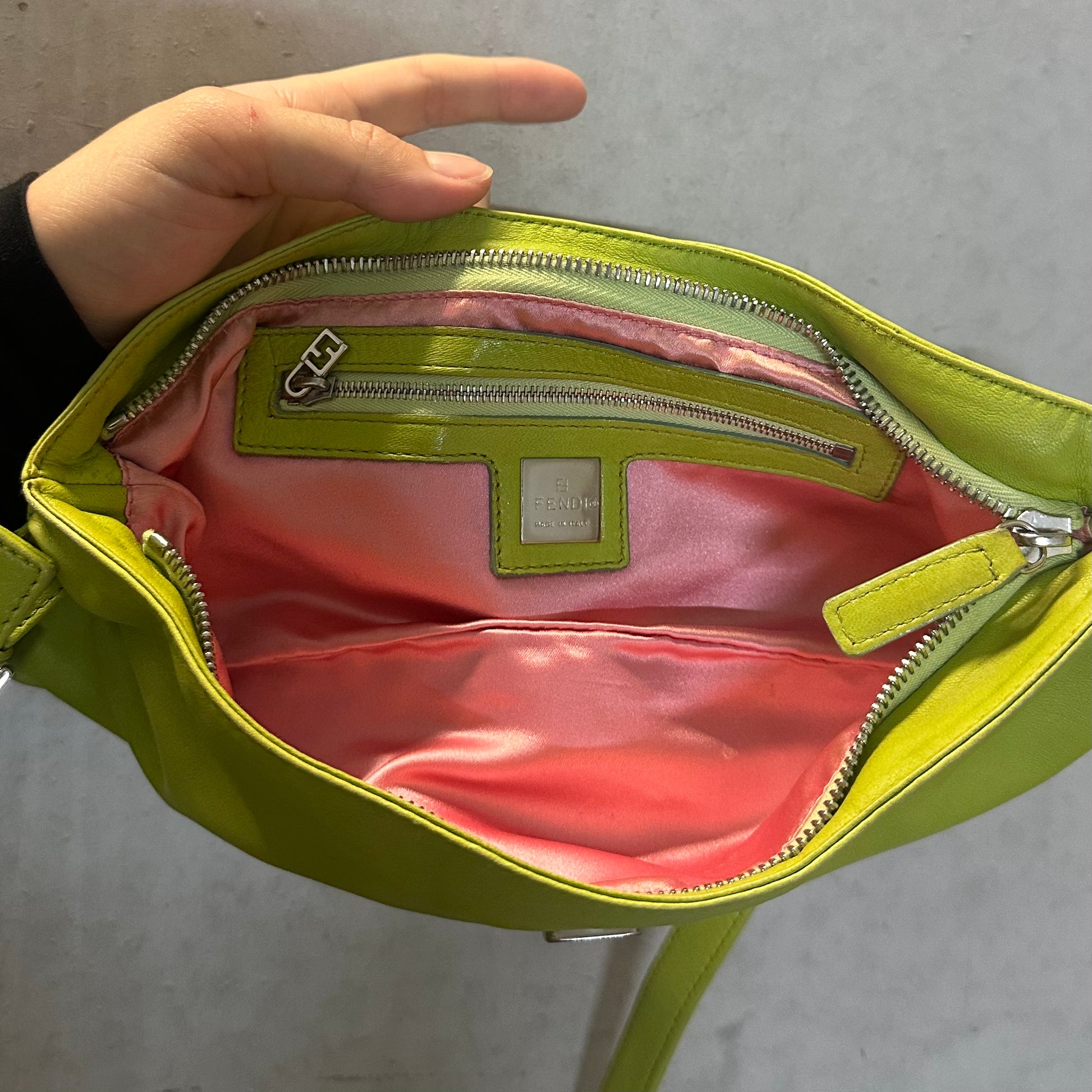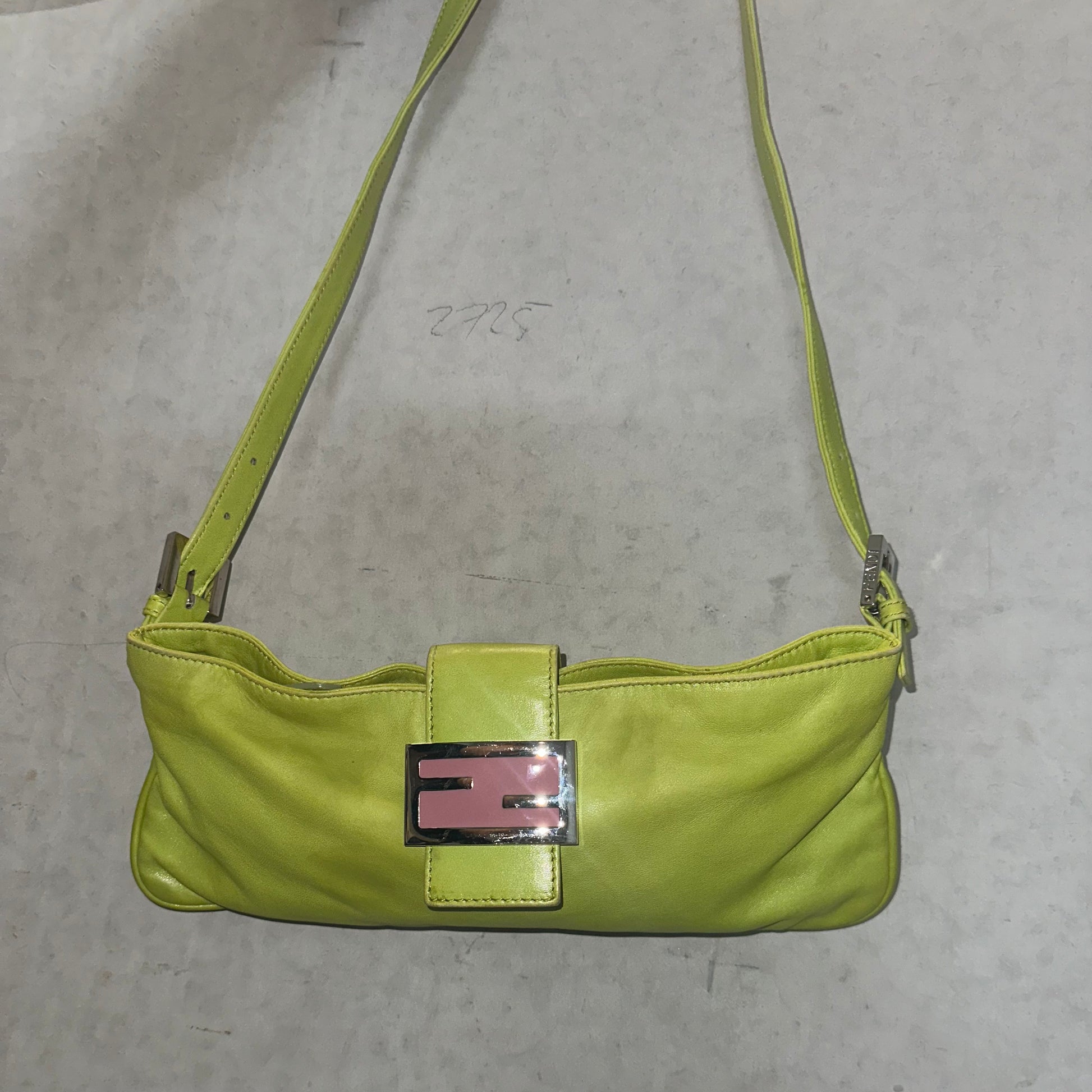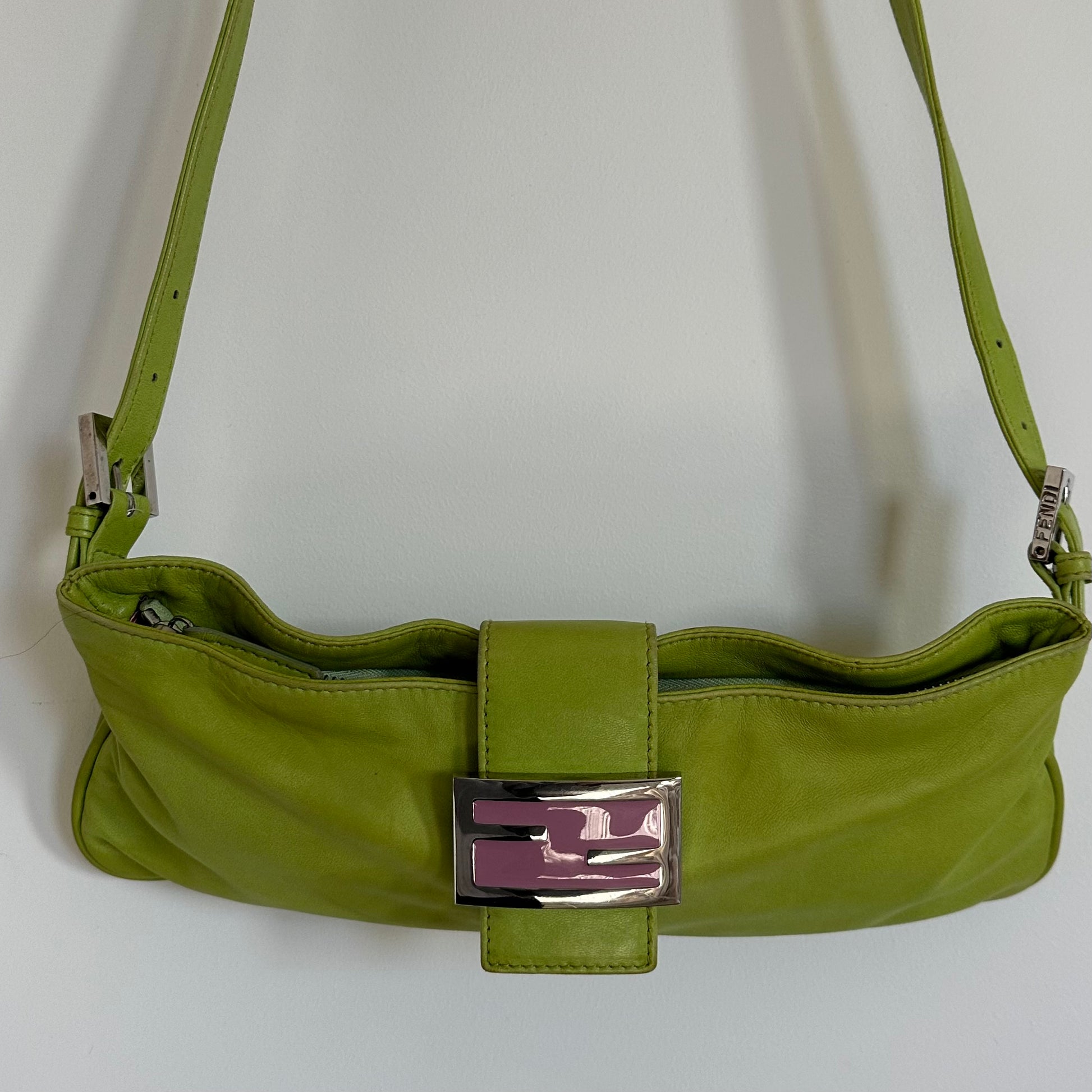 Gorgeous green leather crossbody Fendi baguette. Baby pink contrast on the hardware and in the satin lining.