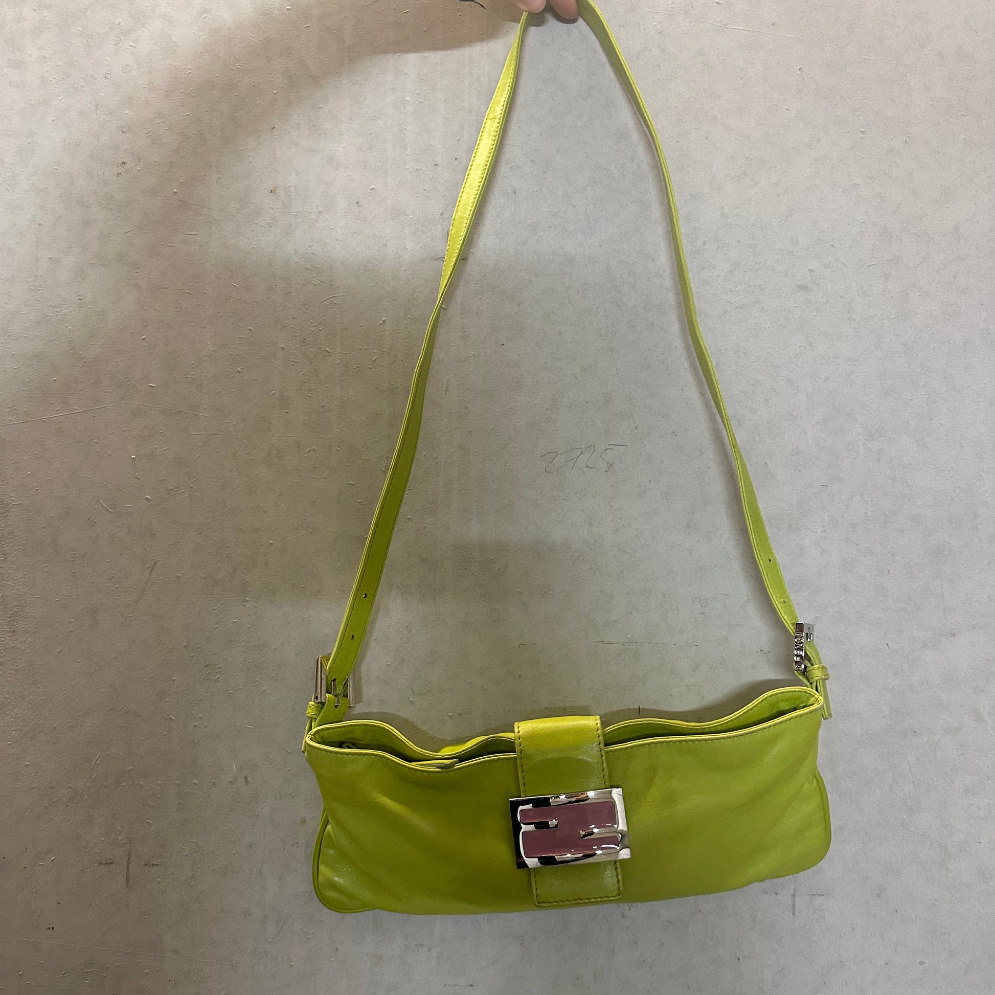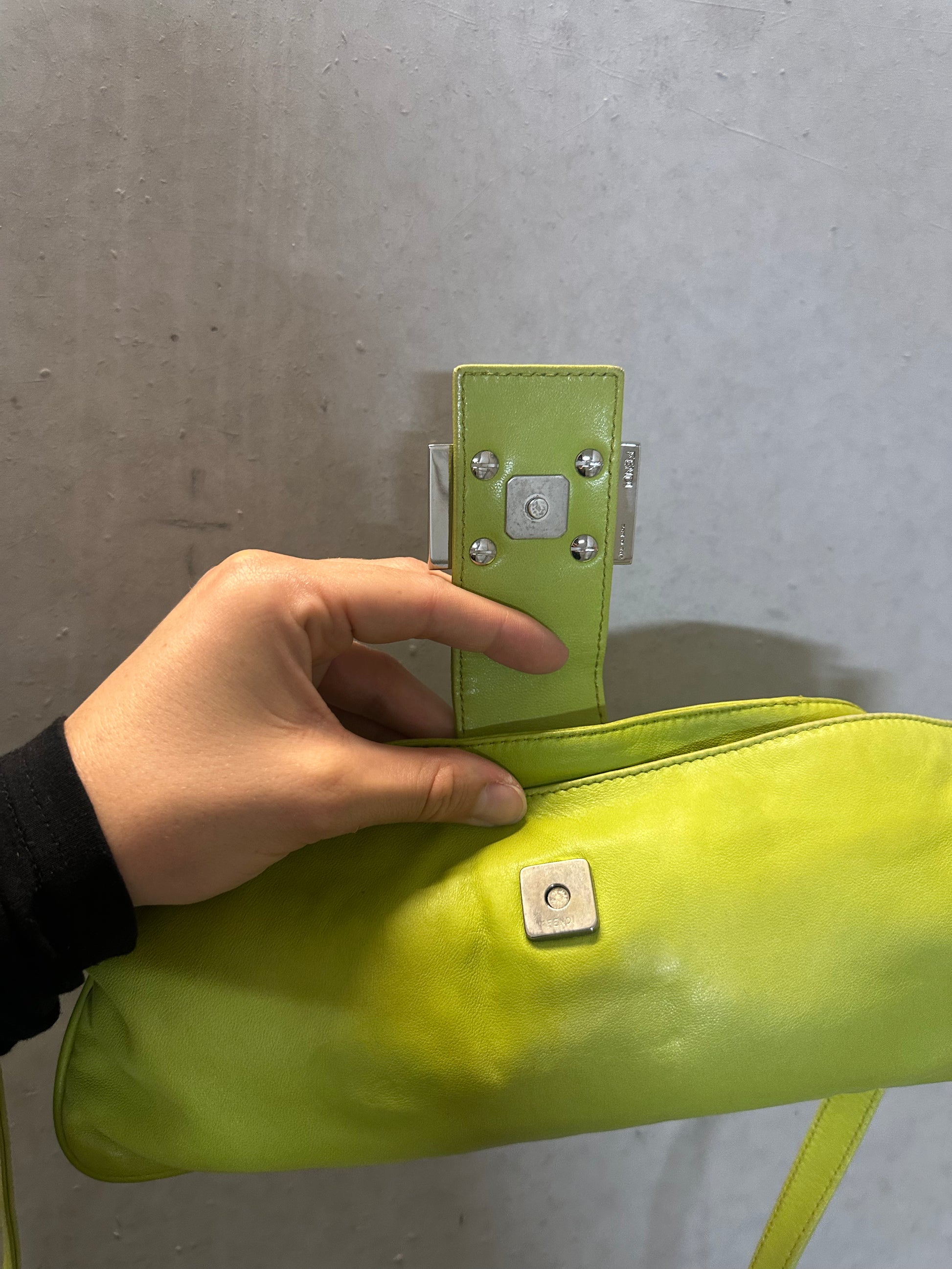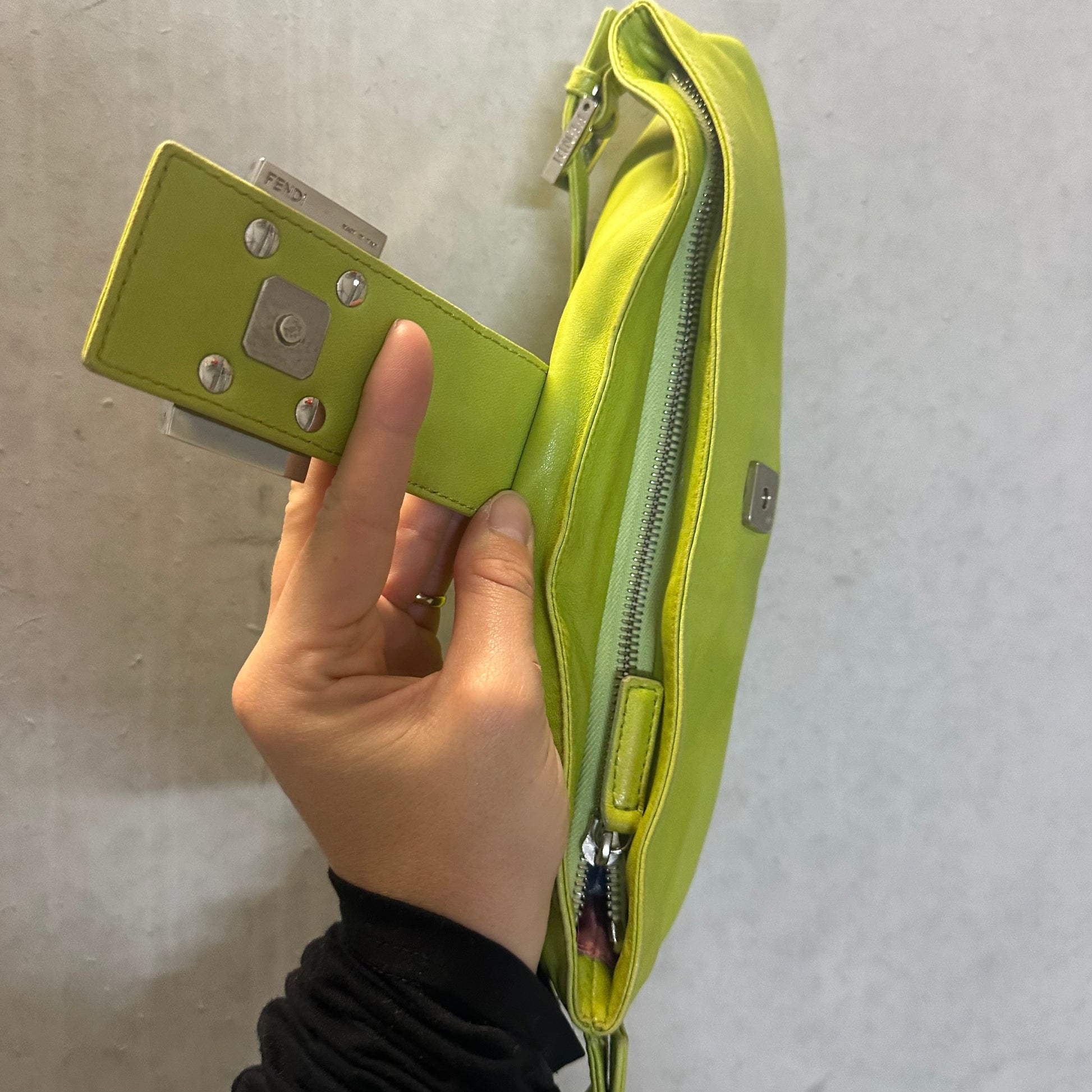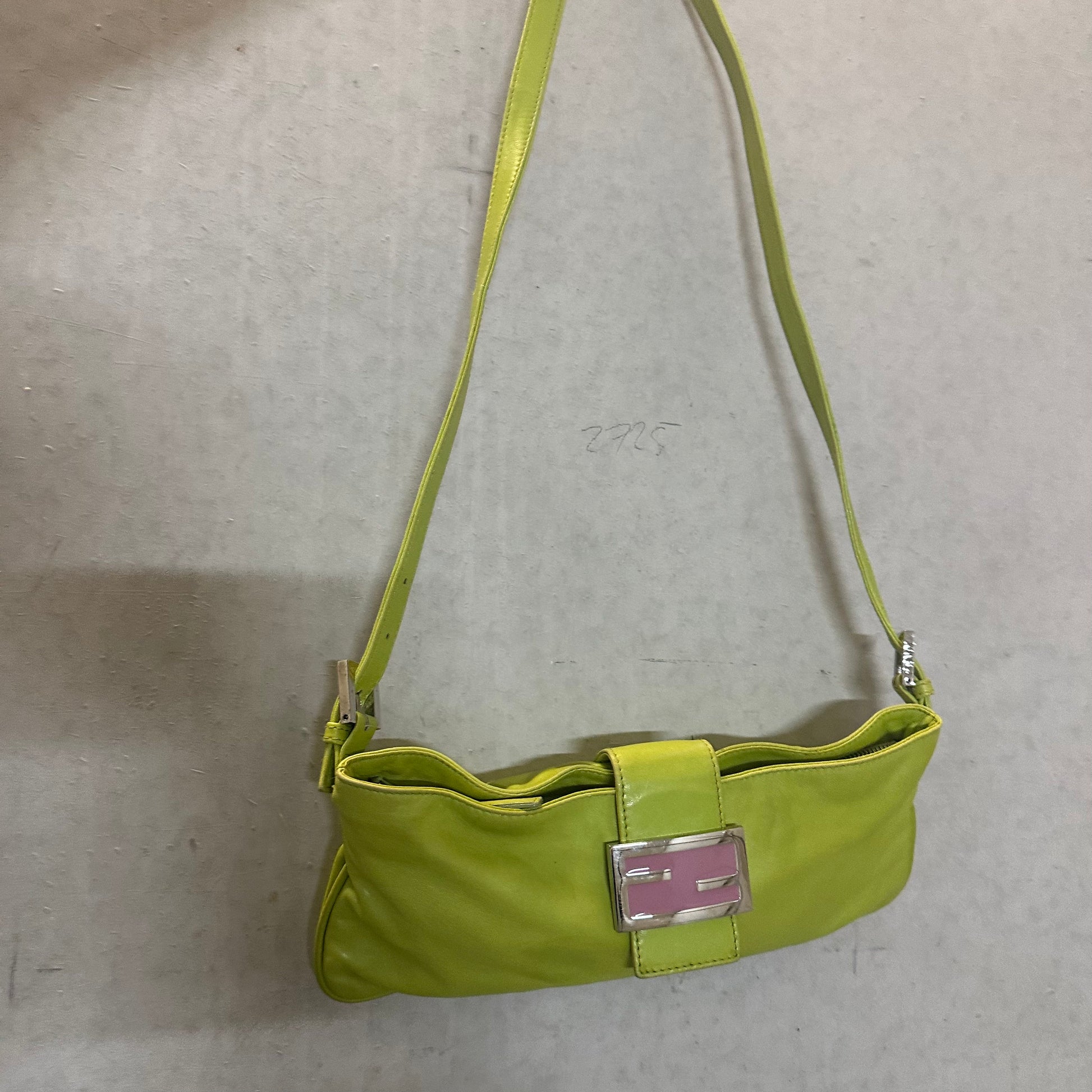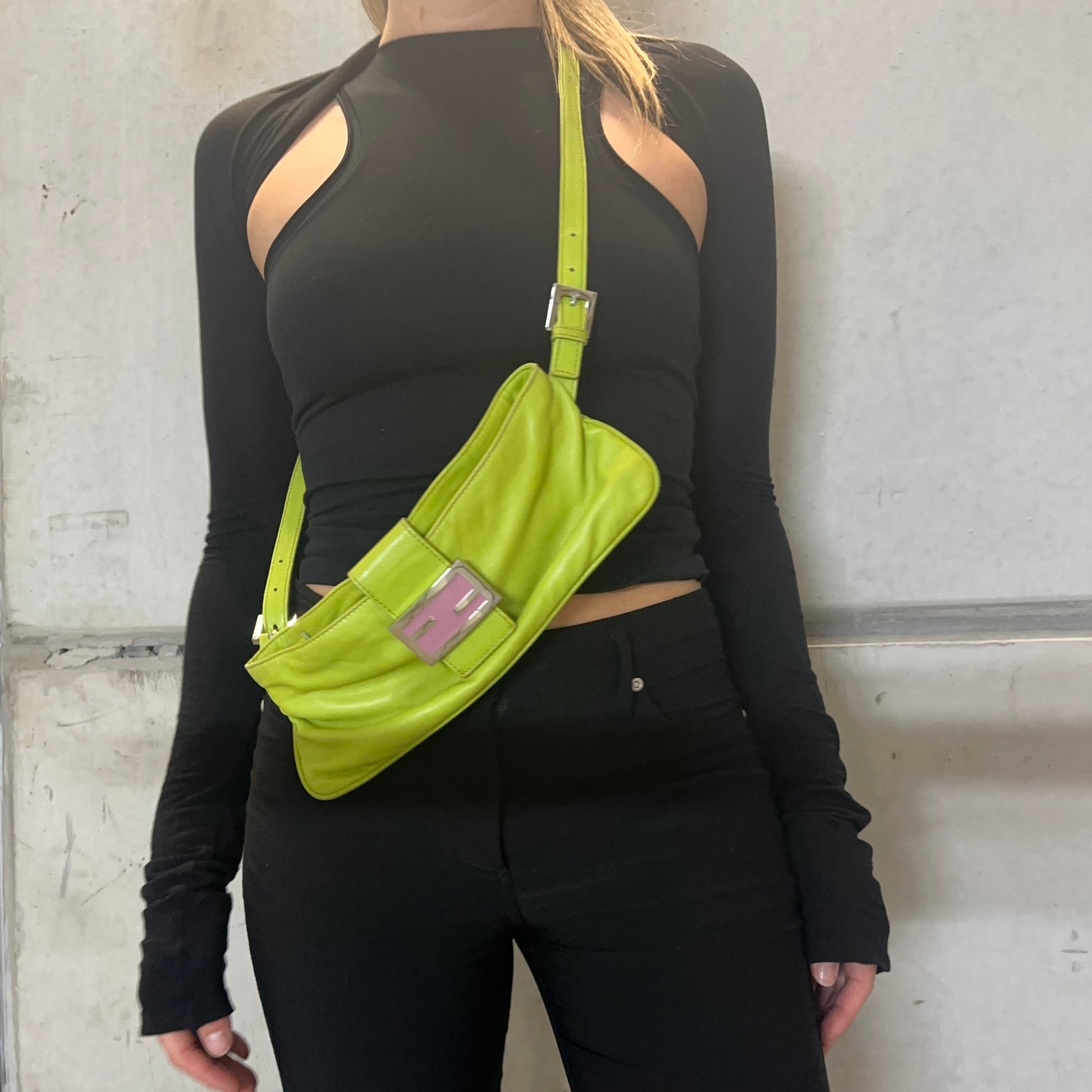 Gorgeous green leather crossbody Fendi baguette. Baby pink contrast on the hardware and in the satin lining.