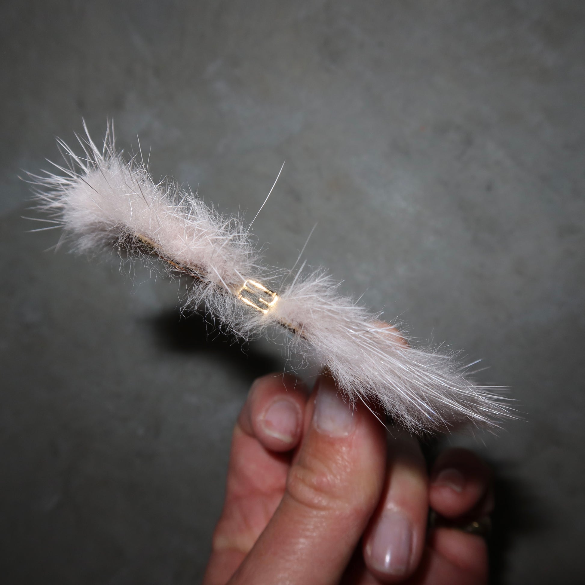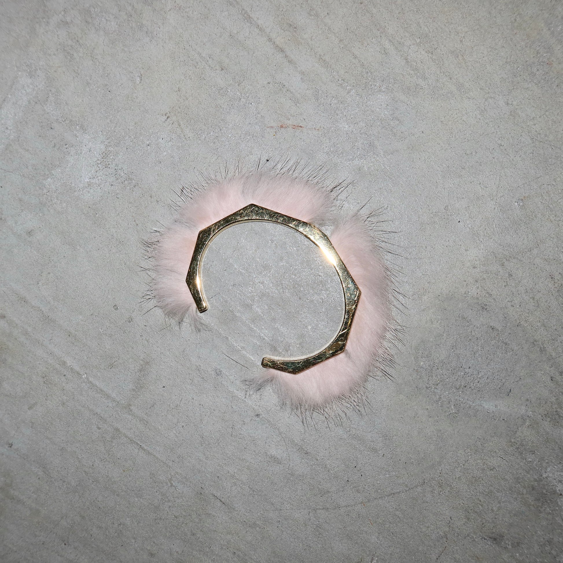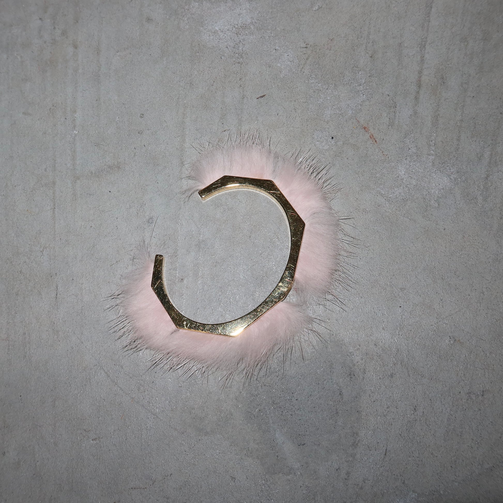 Gorgeous little gold tone cuff by Fendi with real baby pink fur accents. Features a teeny tiny cut out FF logo in the middle. Please note this is costume jewellery by Fendi and not real gold.