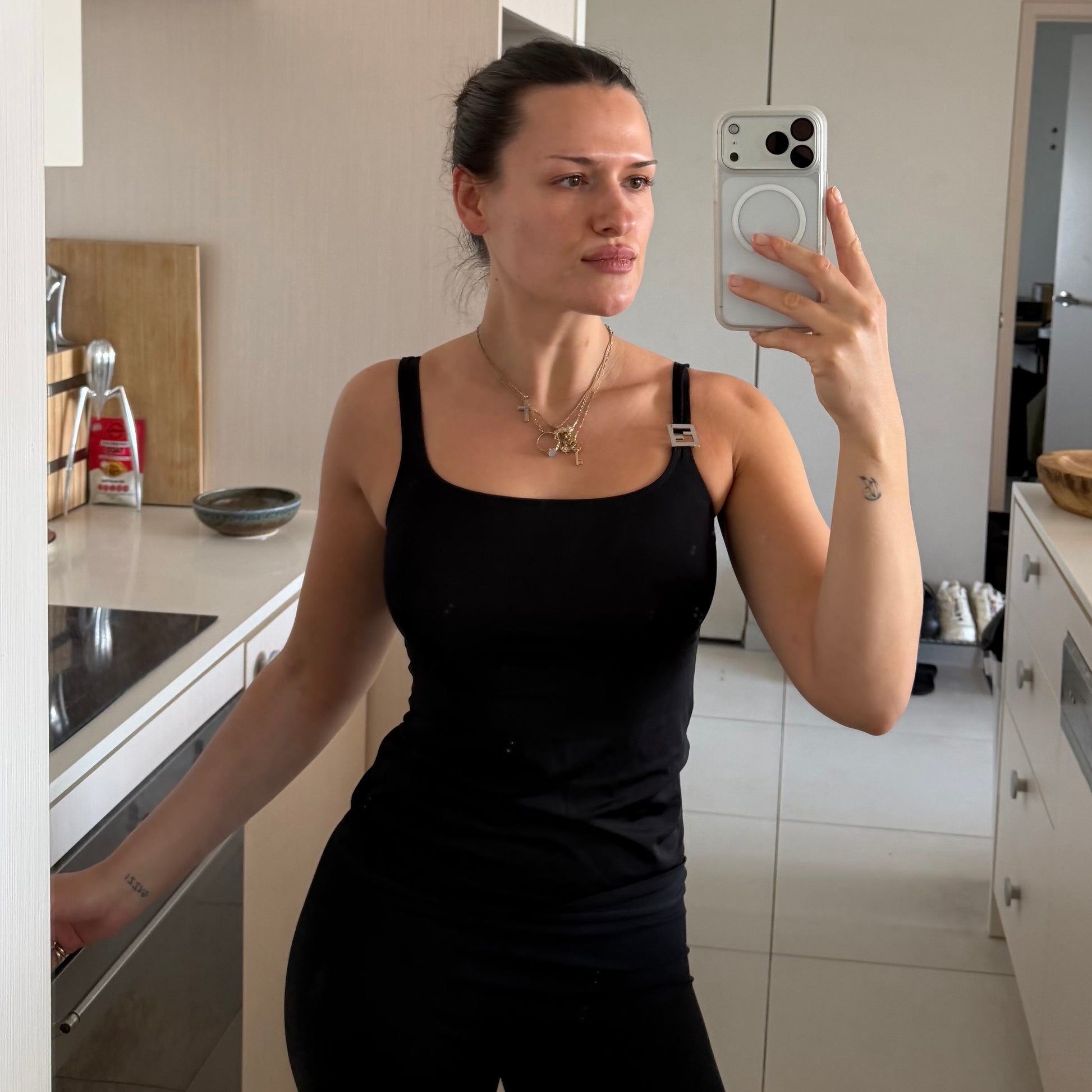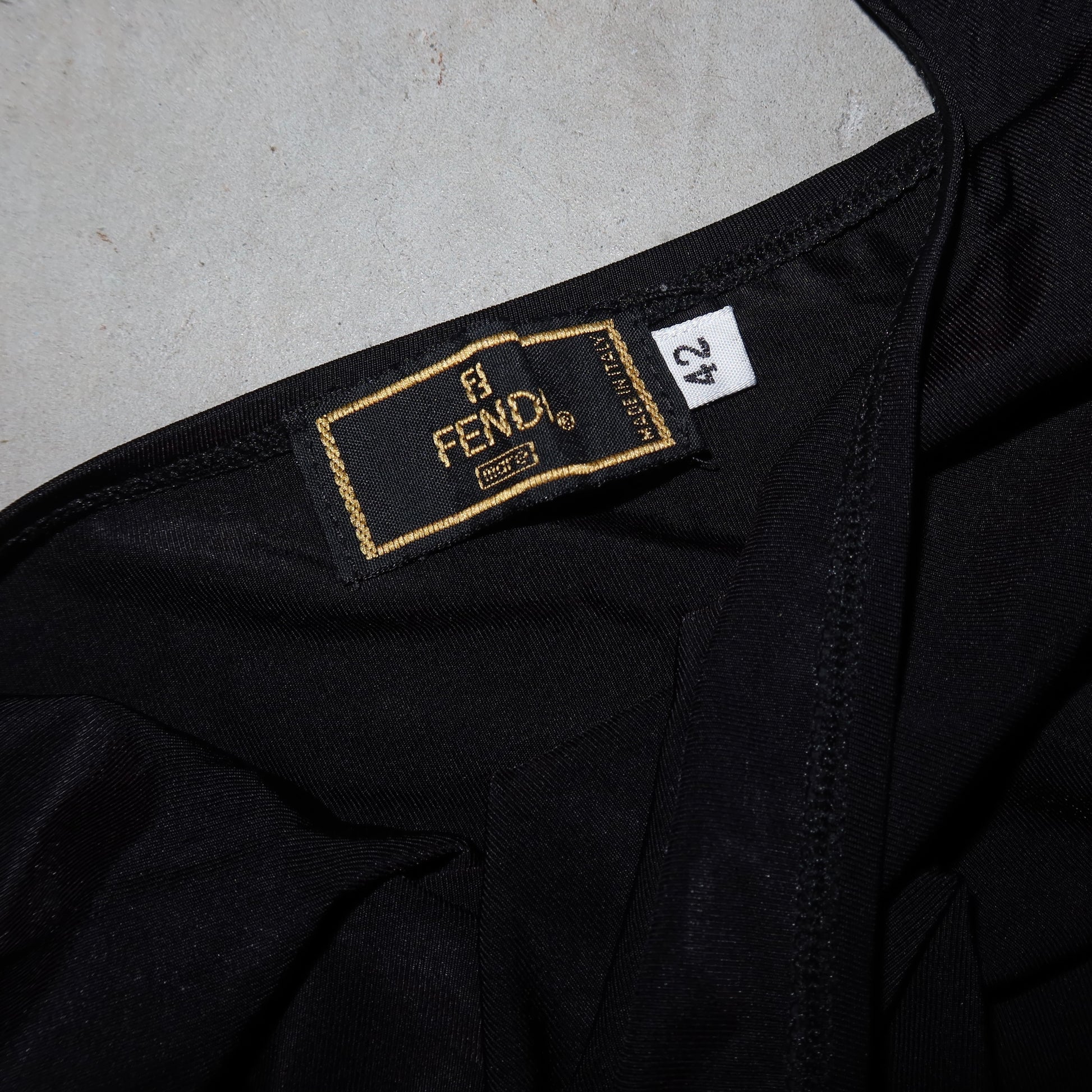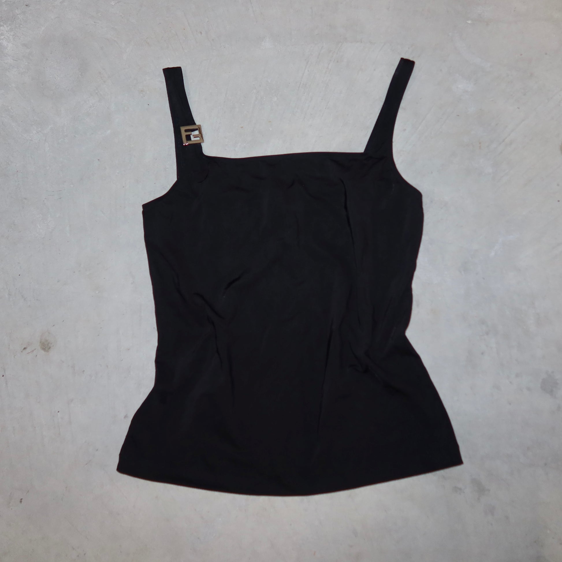 Iconic slinky black tank from Karl Lagerfeld's time at Fendi, famously worn by Bella Hadid. Silver FF logo detail on the strap. Flattering body-hugging fit.