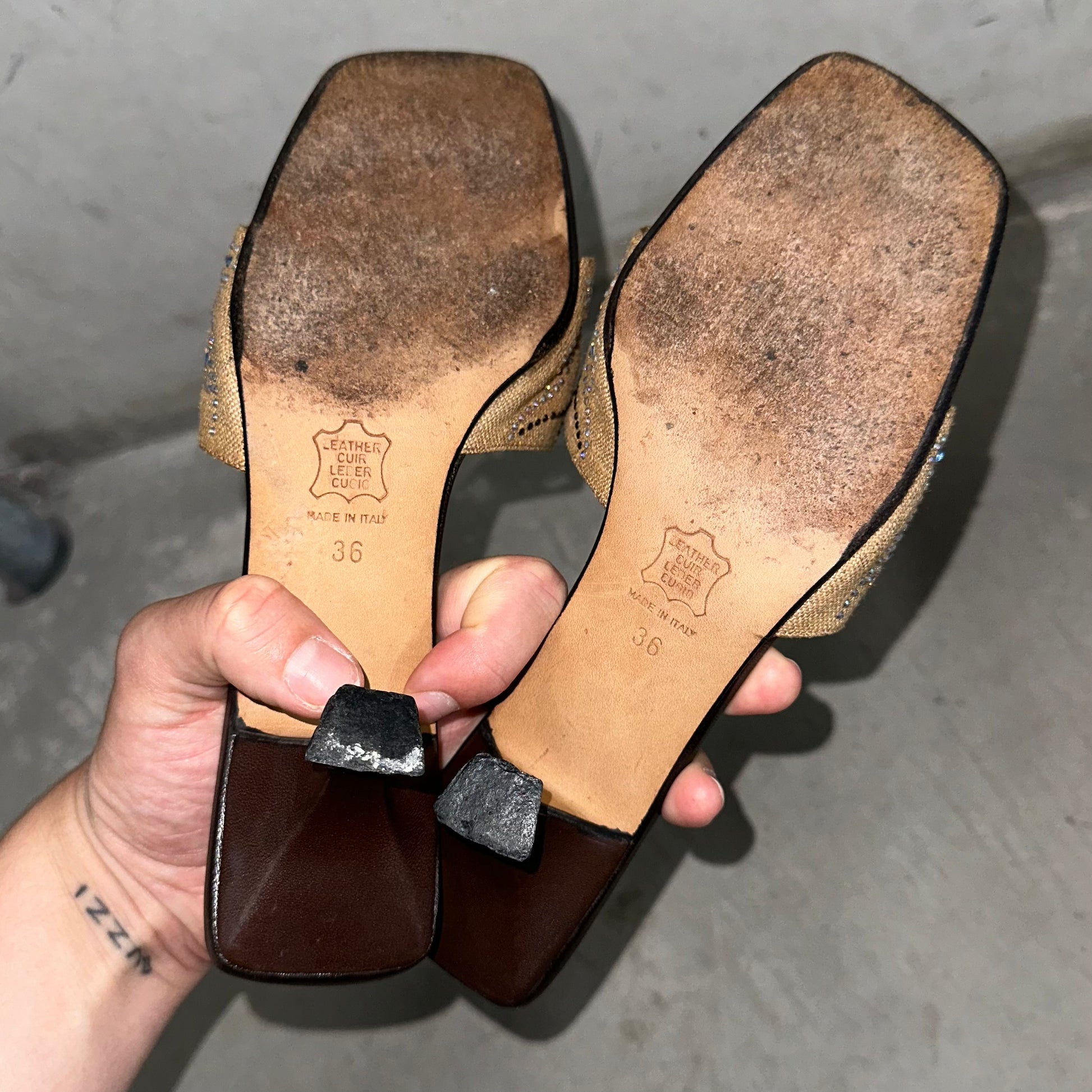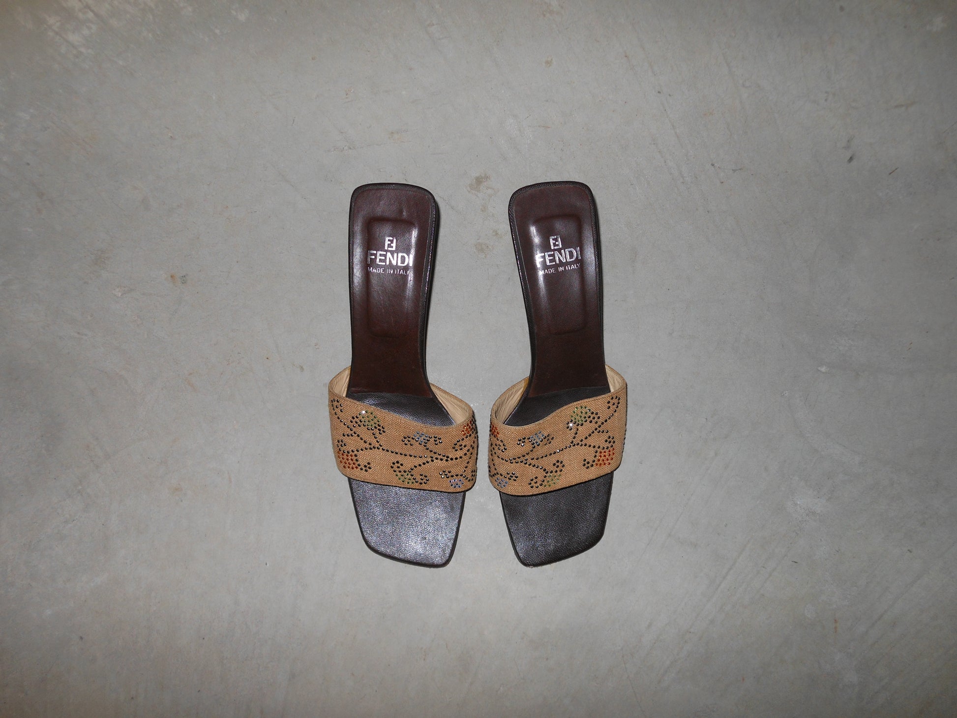 The sweetest vintage Fendi mule heels with rhinestone floral details.