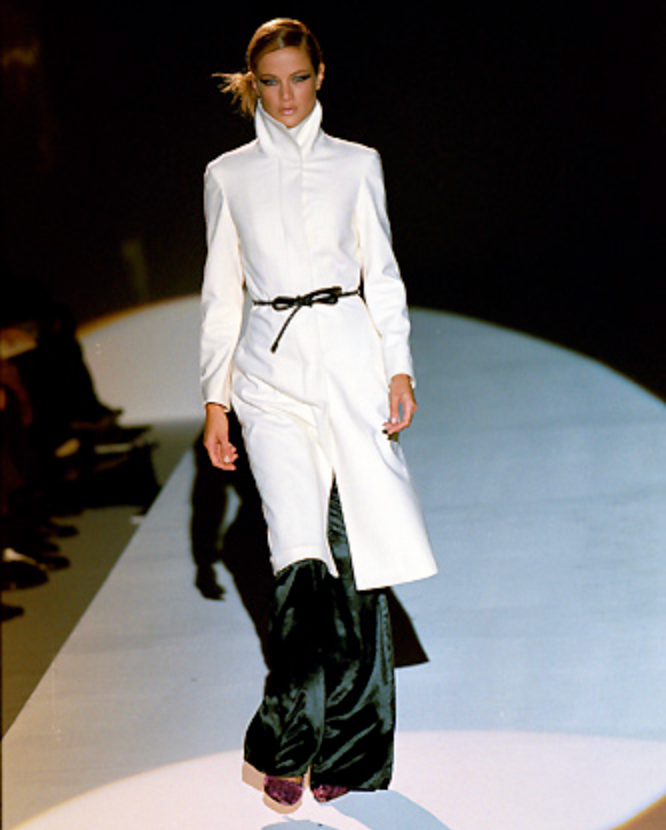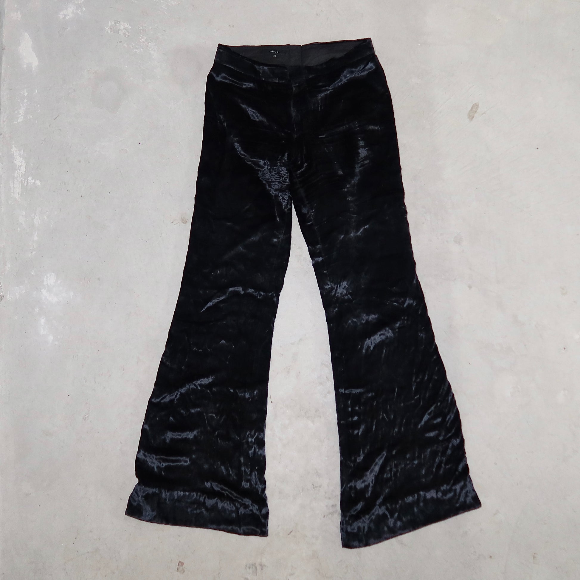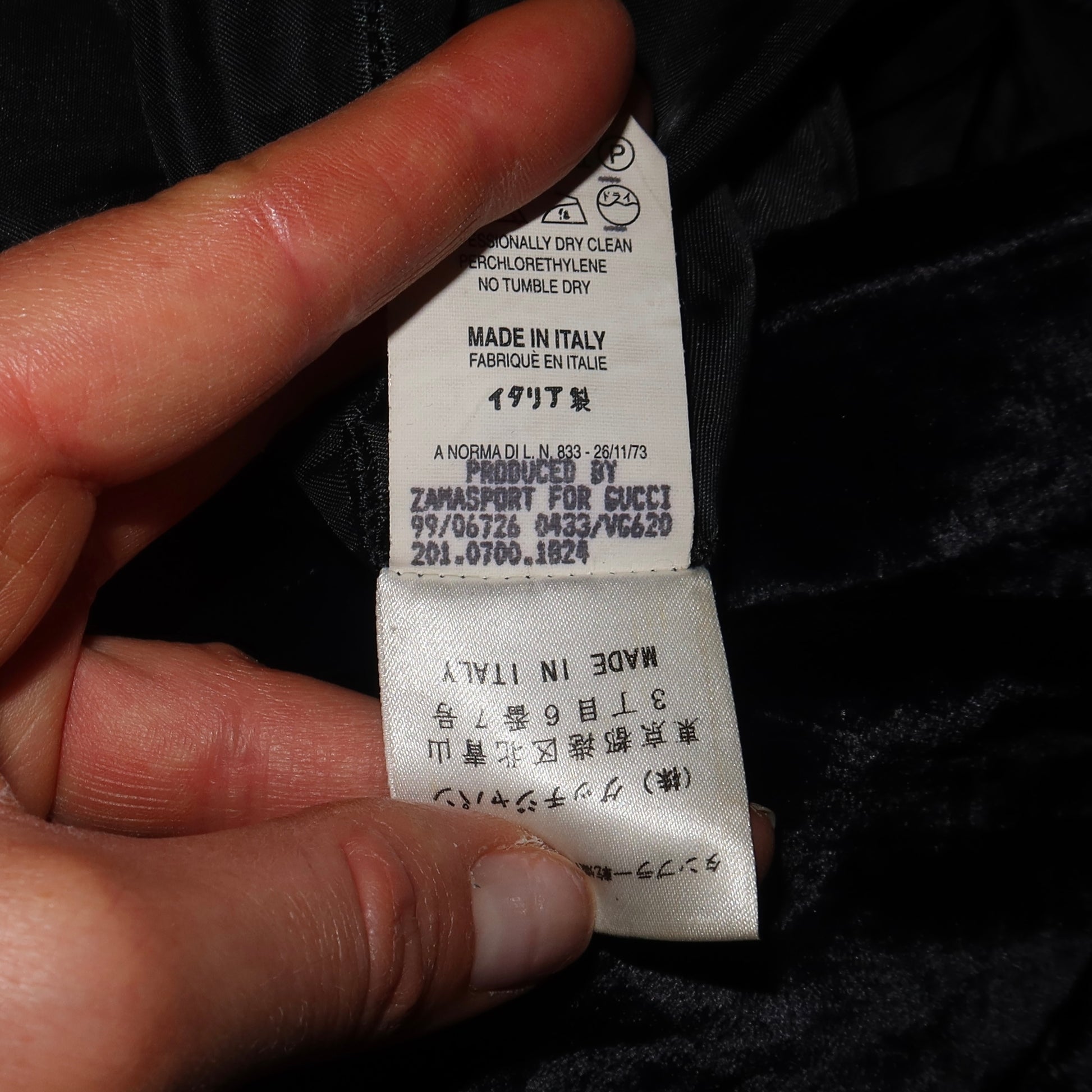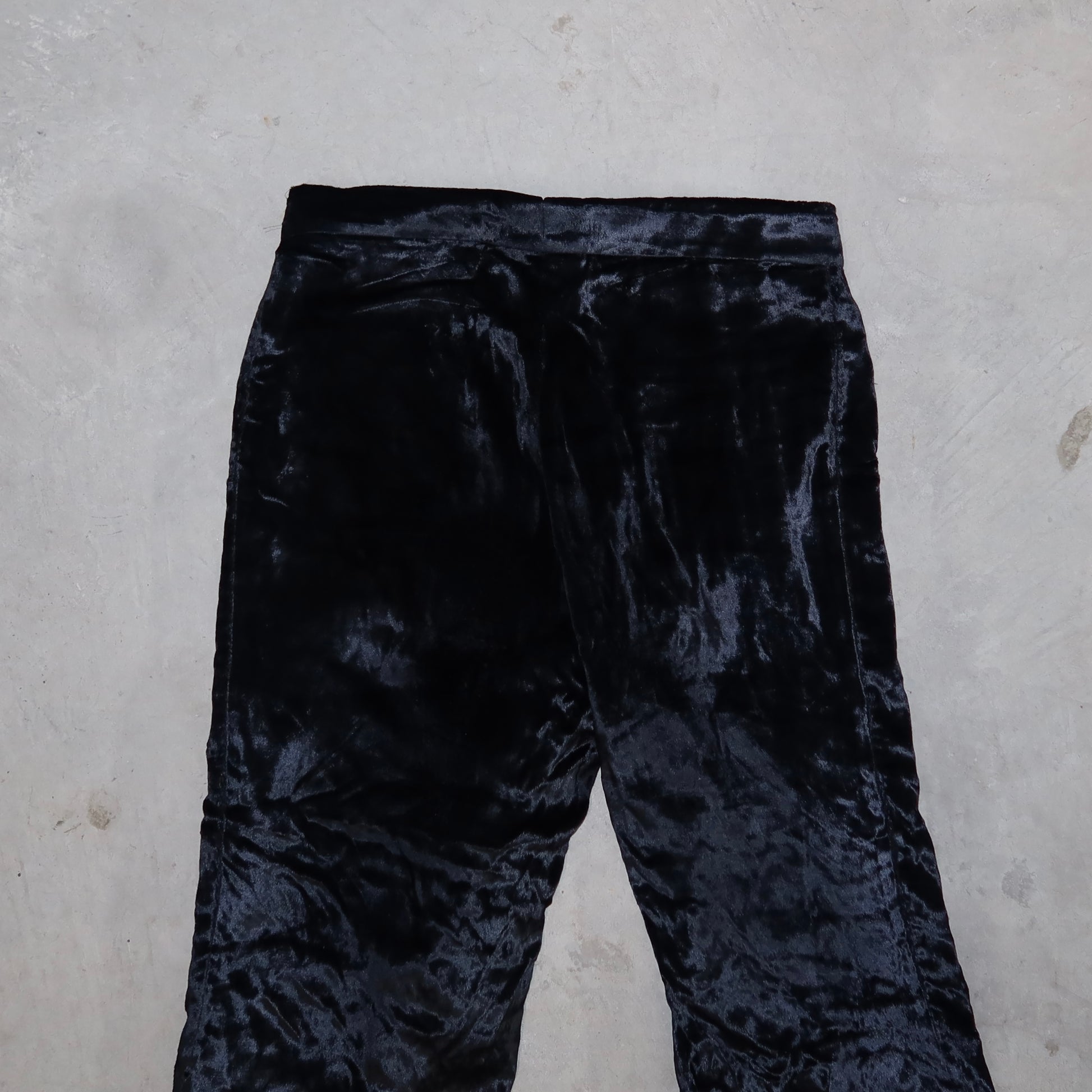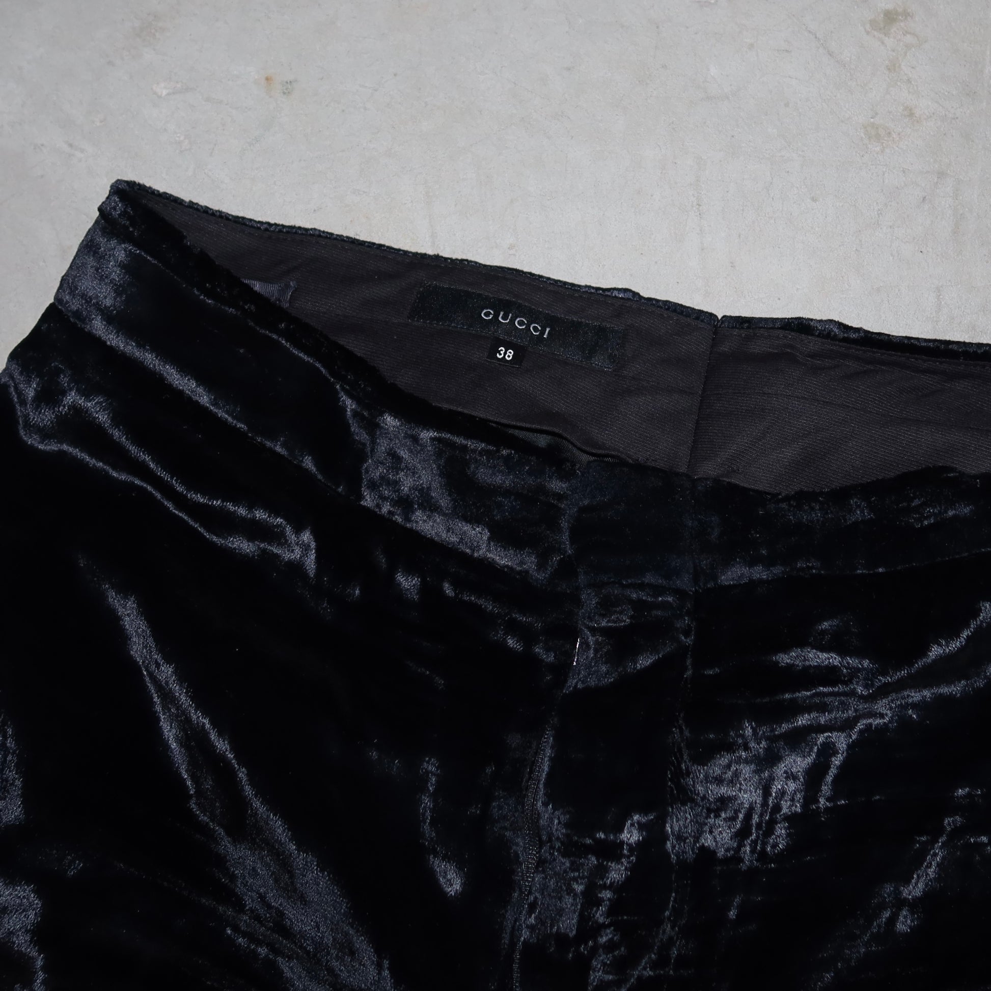 Beautiful crushed velvet black flares by Gucci. These come from one of Tom Ford's most iconic collections with the brand - AW1999. Pictured on the runway. These are the non-ruched version, seen in the look with the white jacket. Overall fit is just like the ruched bottom pair in the photographs - tight on the thigh and perfectly flared! We also have the bag from the same look.