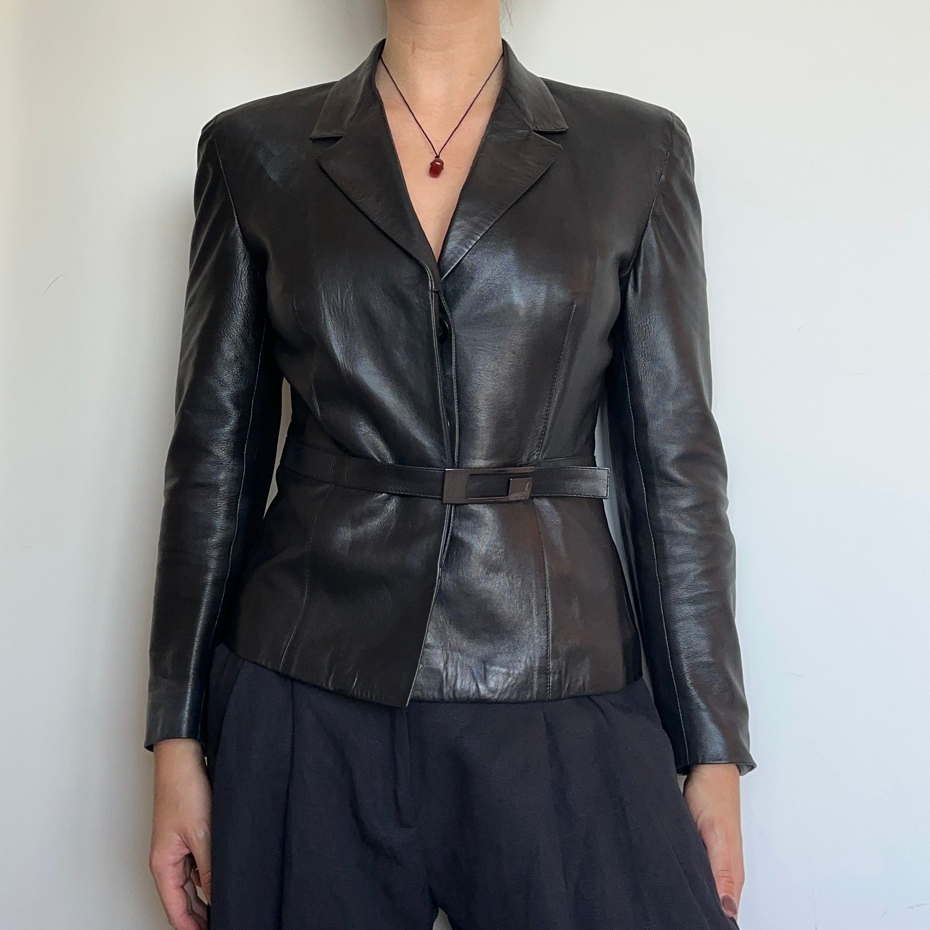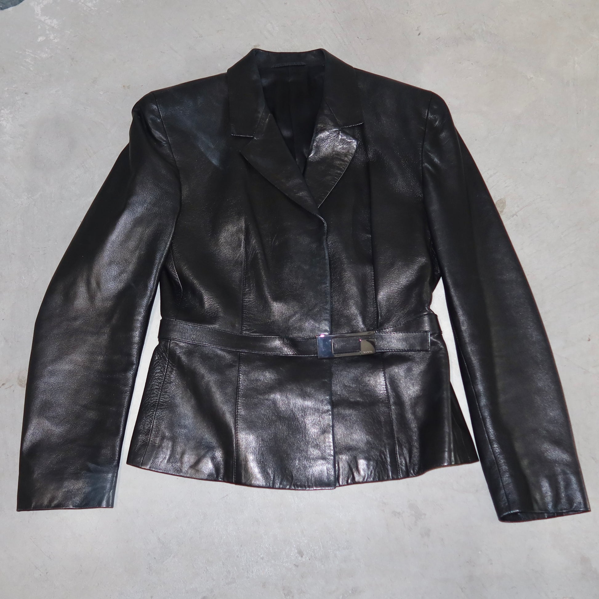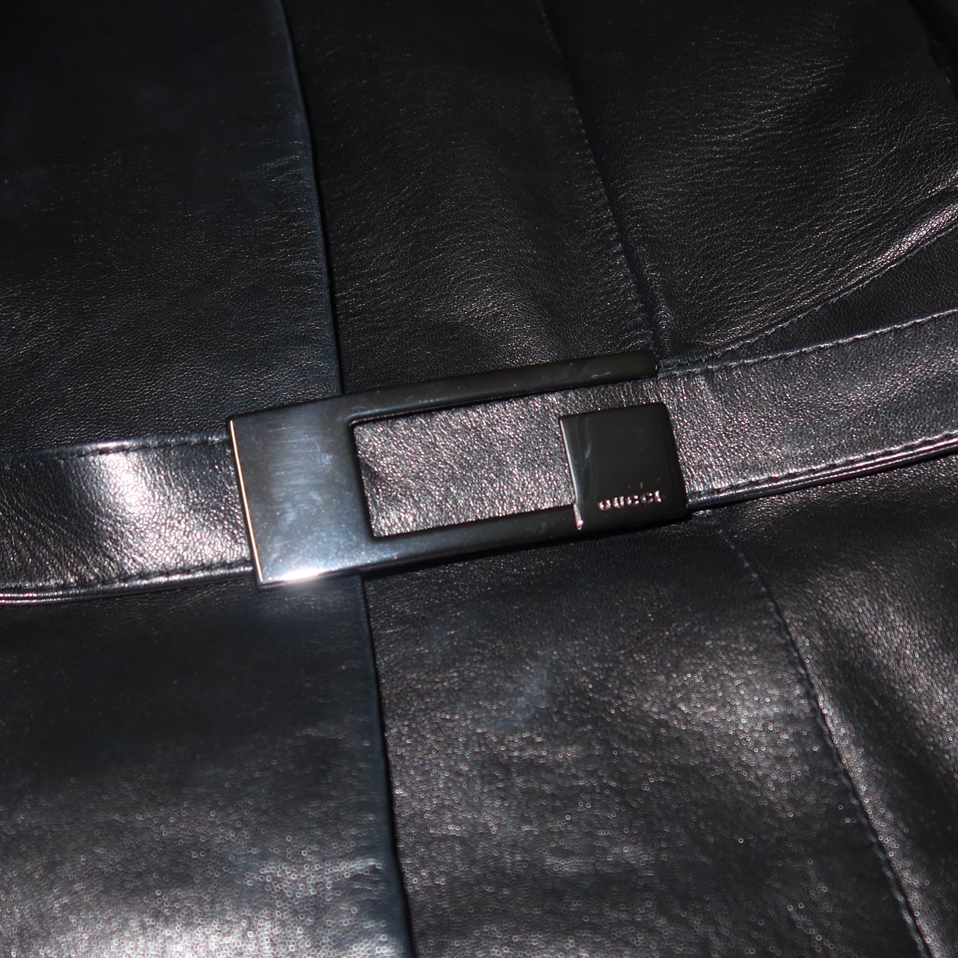 The most insane buttery soft leather blazer from Tom Ford's era at Gucci. Iconic gunmetal rectangular G buckle detail at the waist. Padded shoulders.
