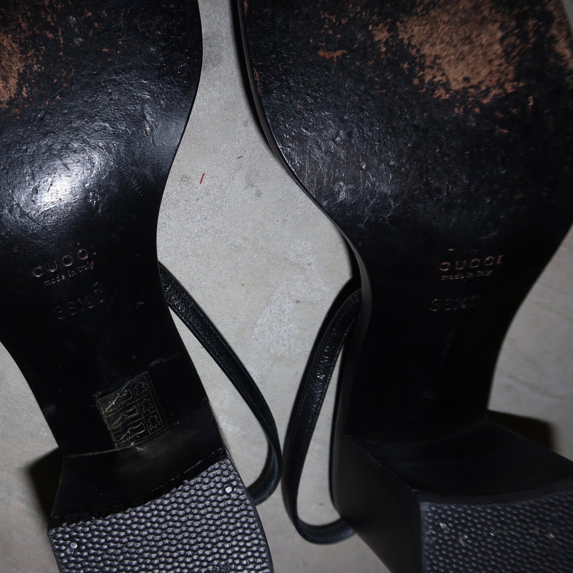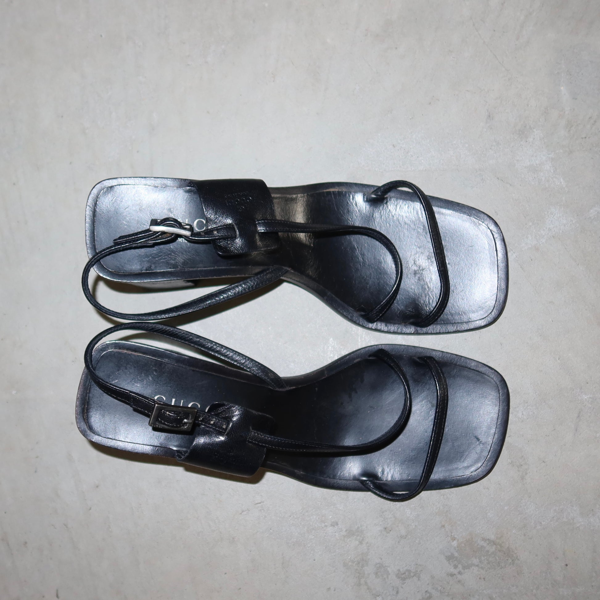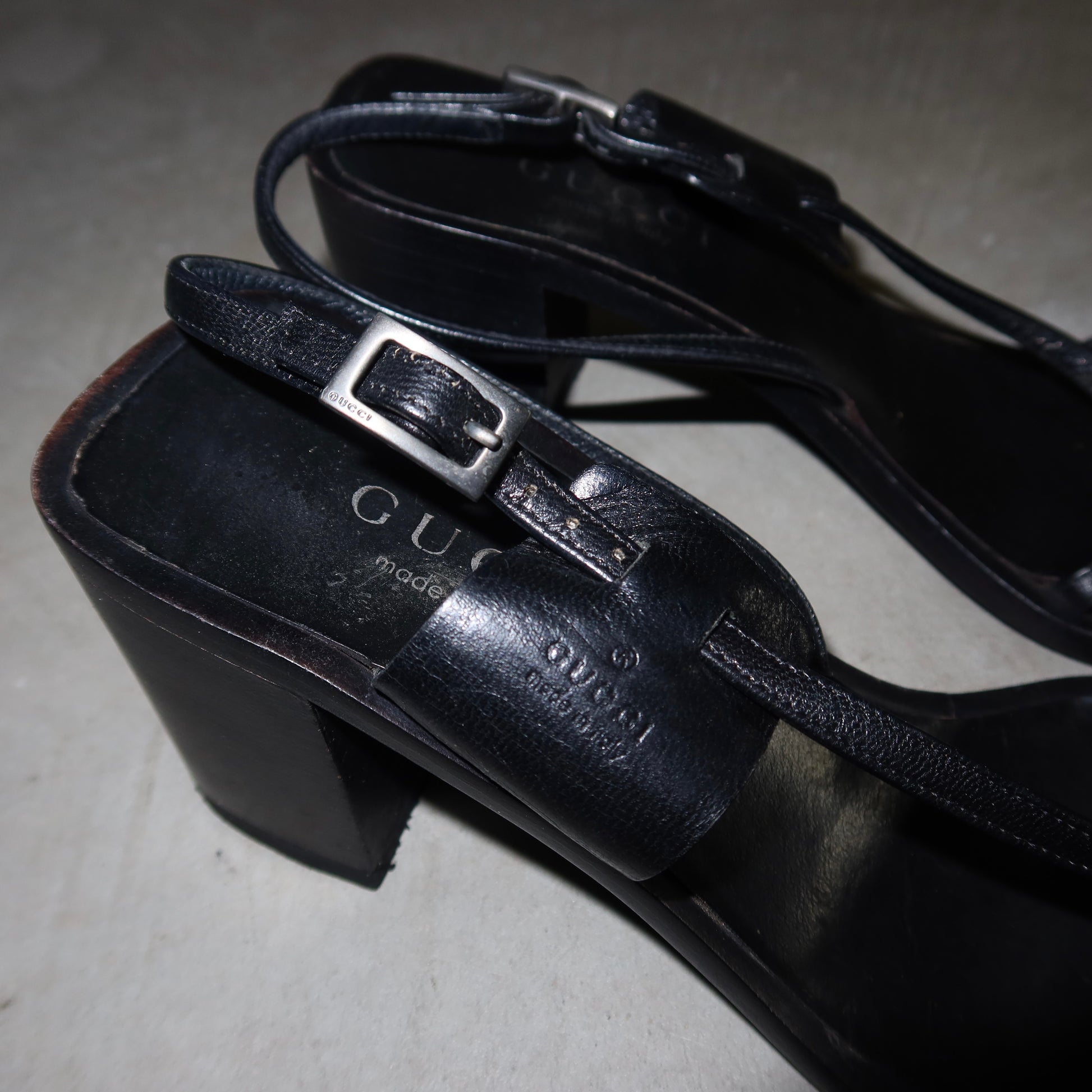 Gorgeous black leather chunky heels from Tom Ford’s reign at Gucci. Embossed logo strap and Gucci embossing on the iconic rectangular buckle - a true sign of Tom Ford era Gucci!