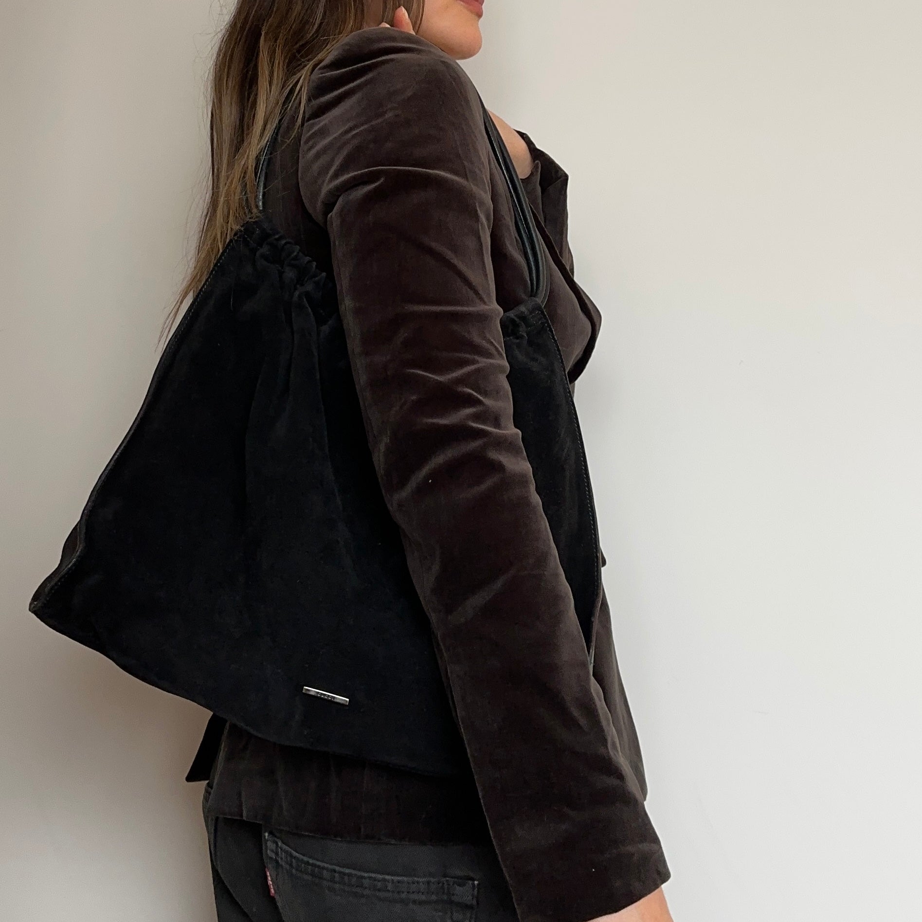 Gorgeous large suede bag from Tom Ford's era at Gucci. Circle shape leather handles.