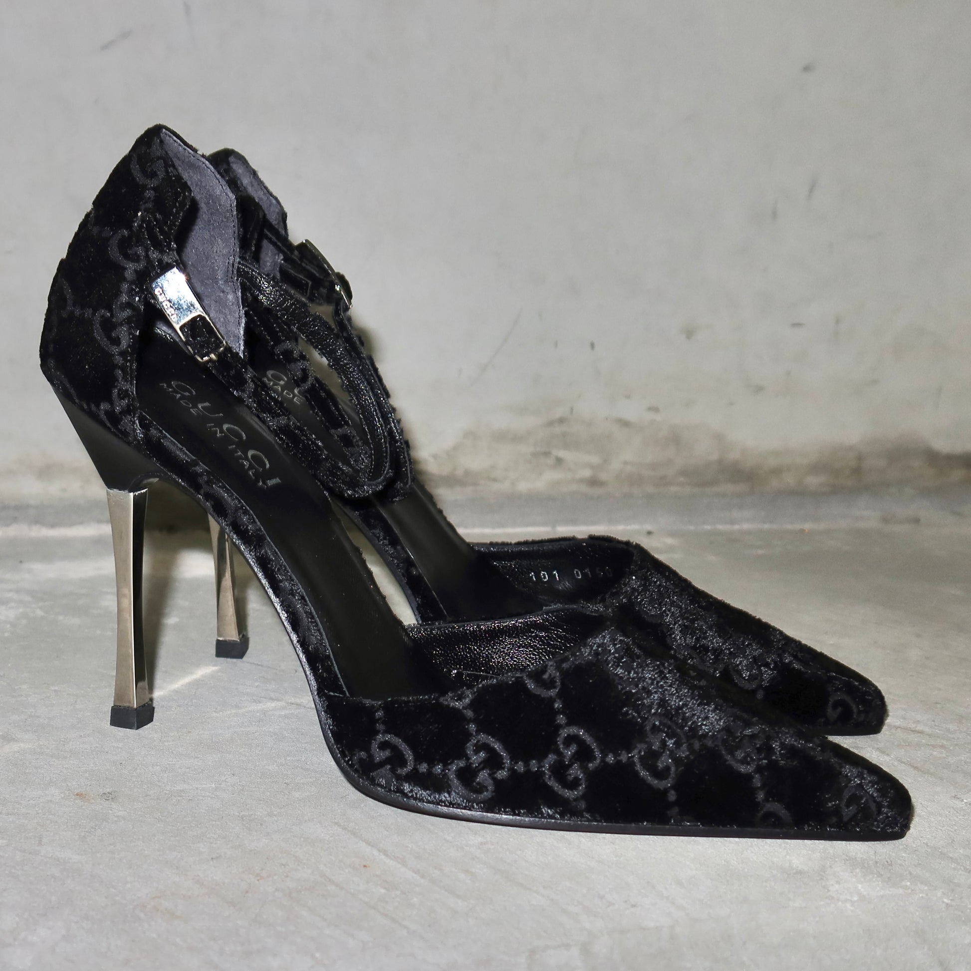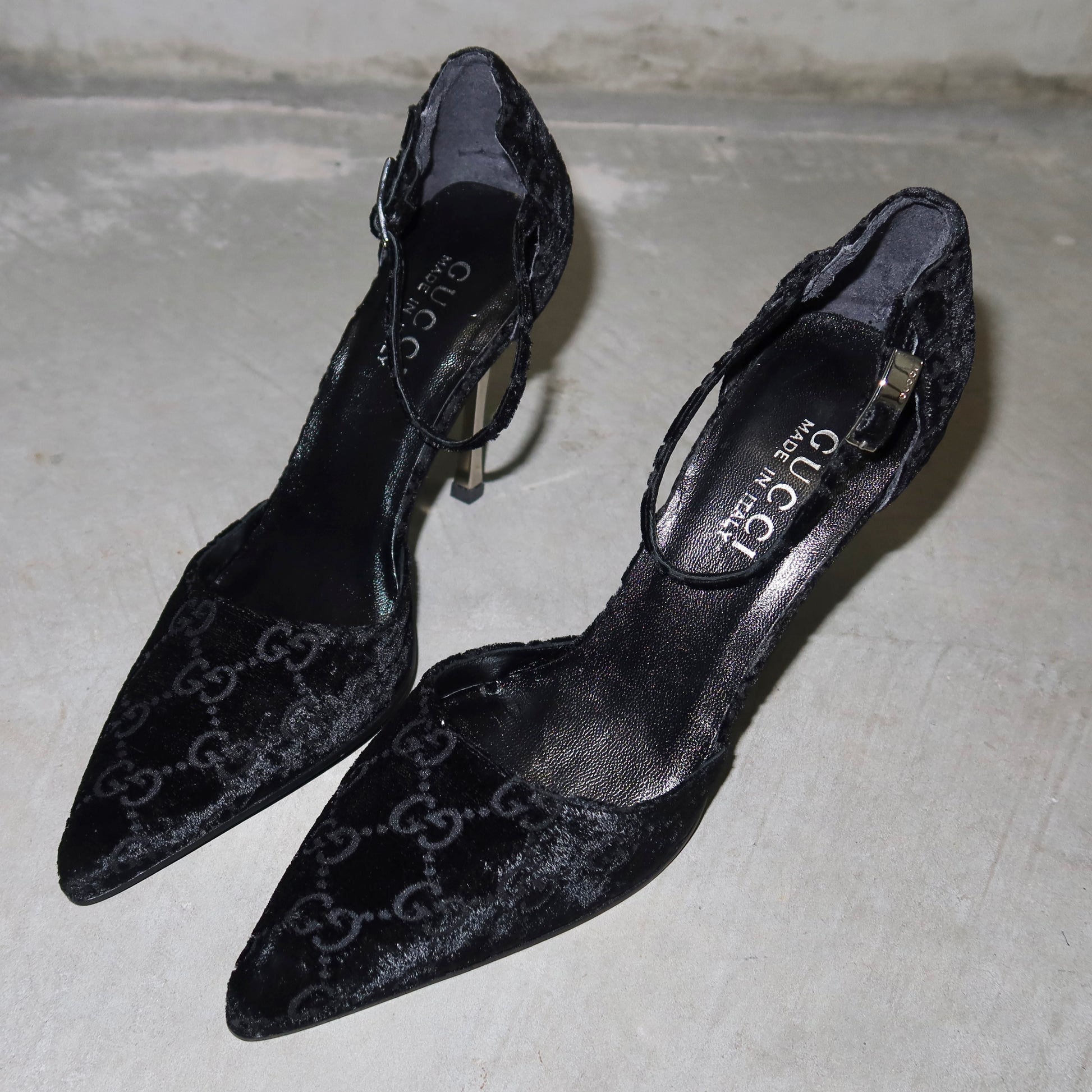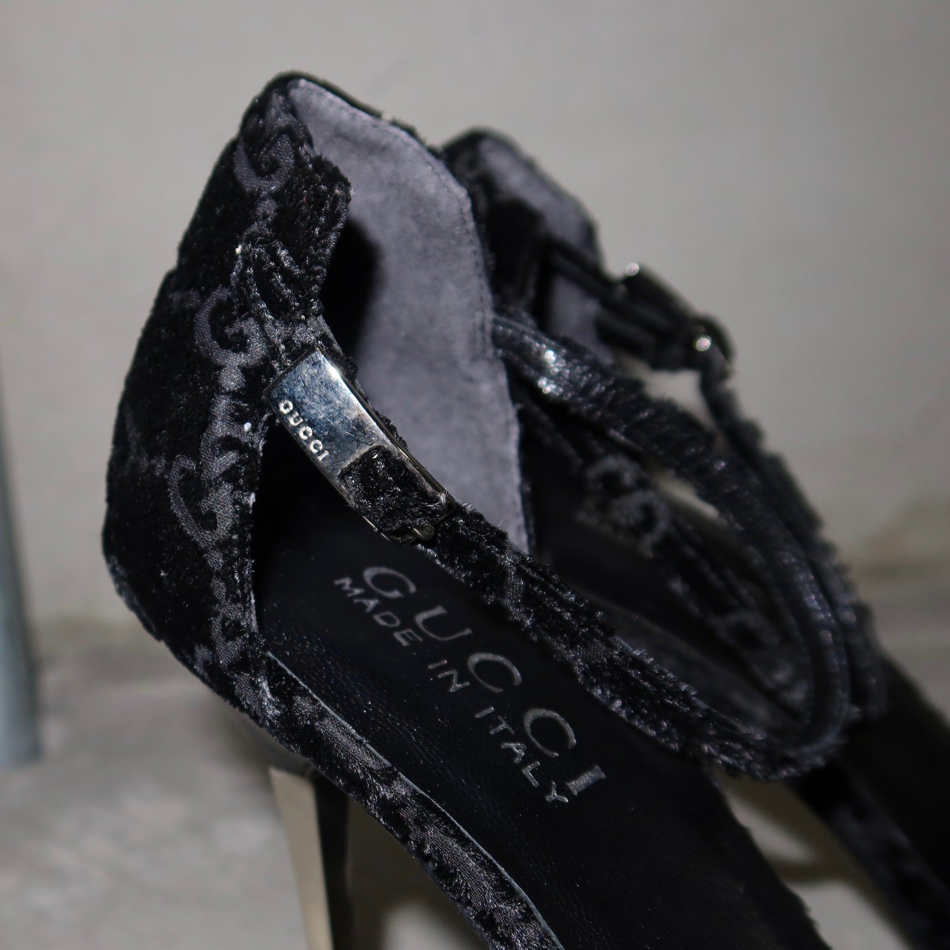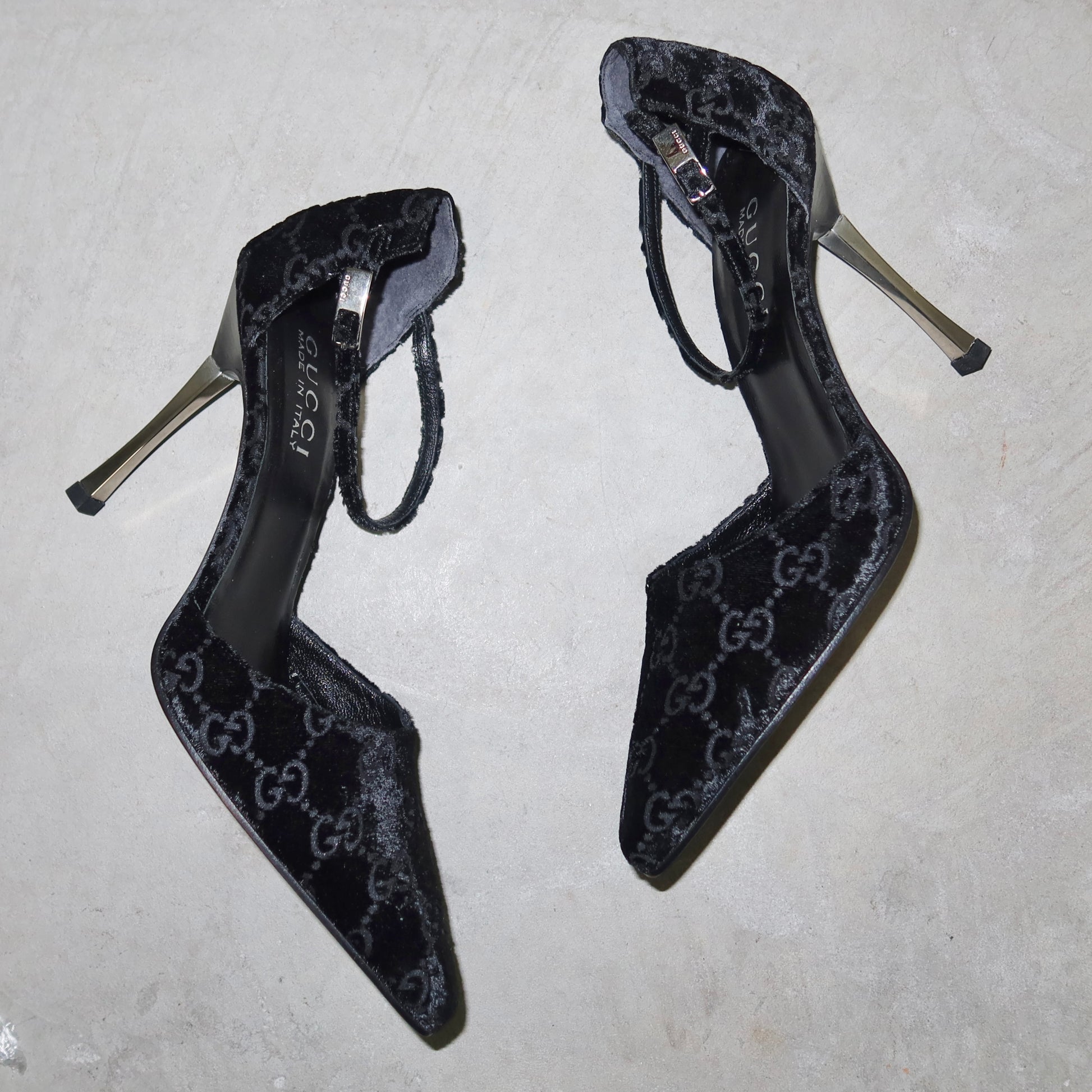 Unbelievable Tom Ford era Gucci heels in black velvet monogram. Pointed toe with ankle strap and metal heel. Unworn.