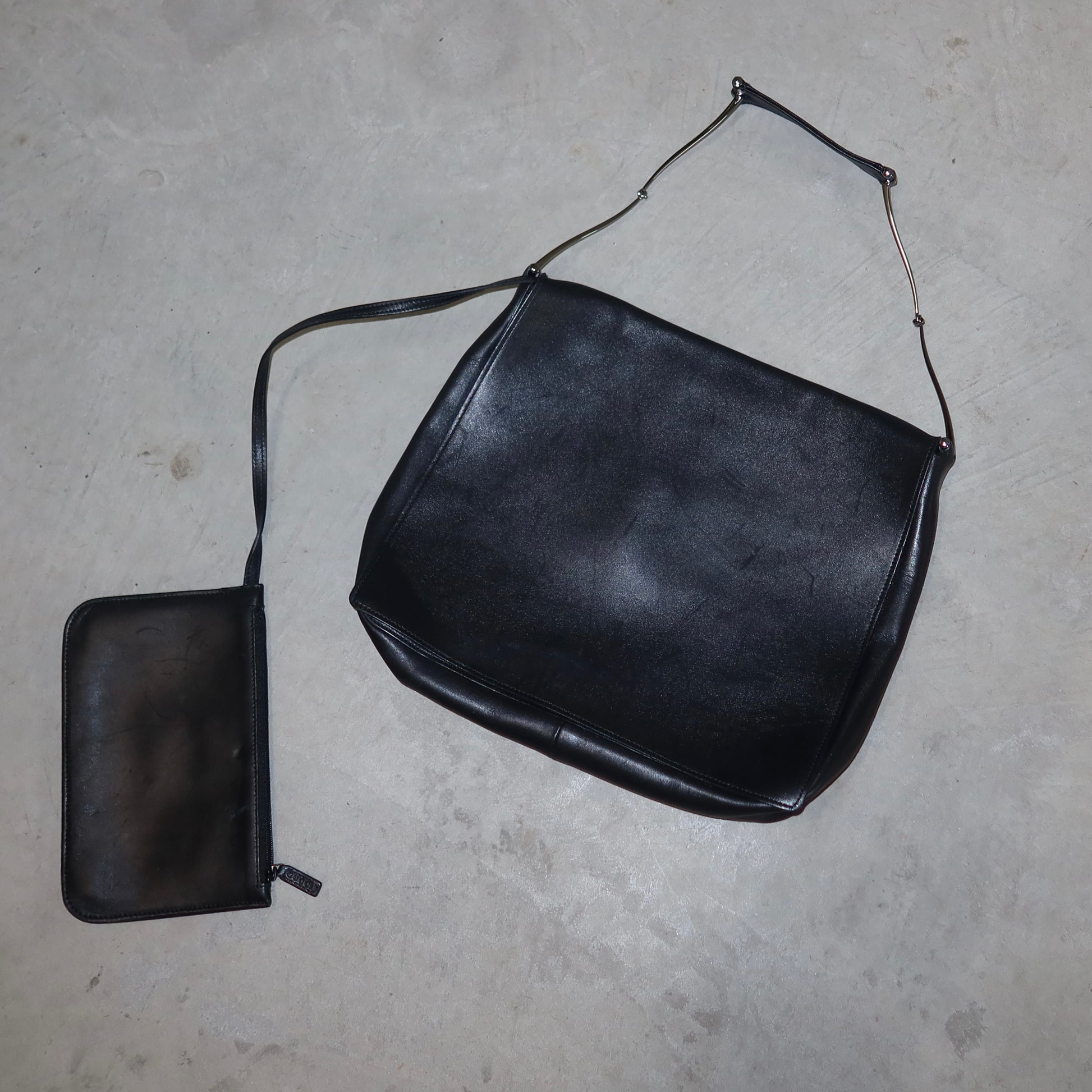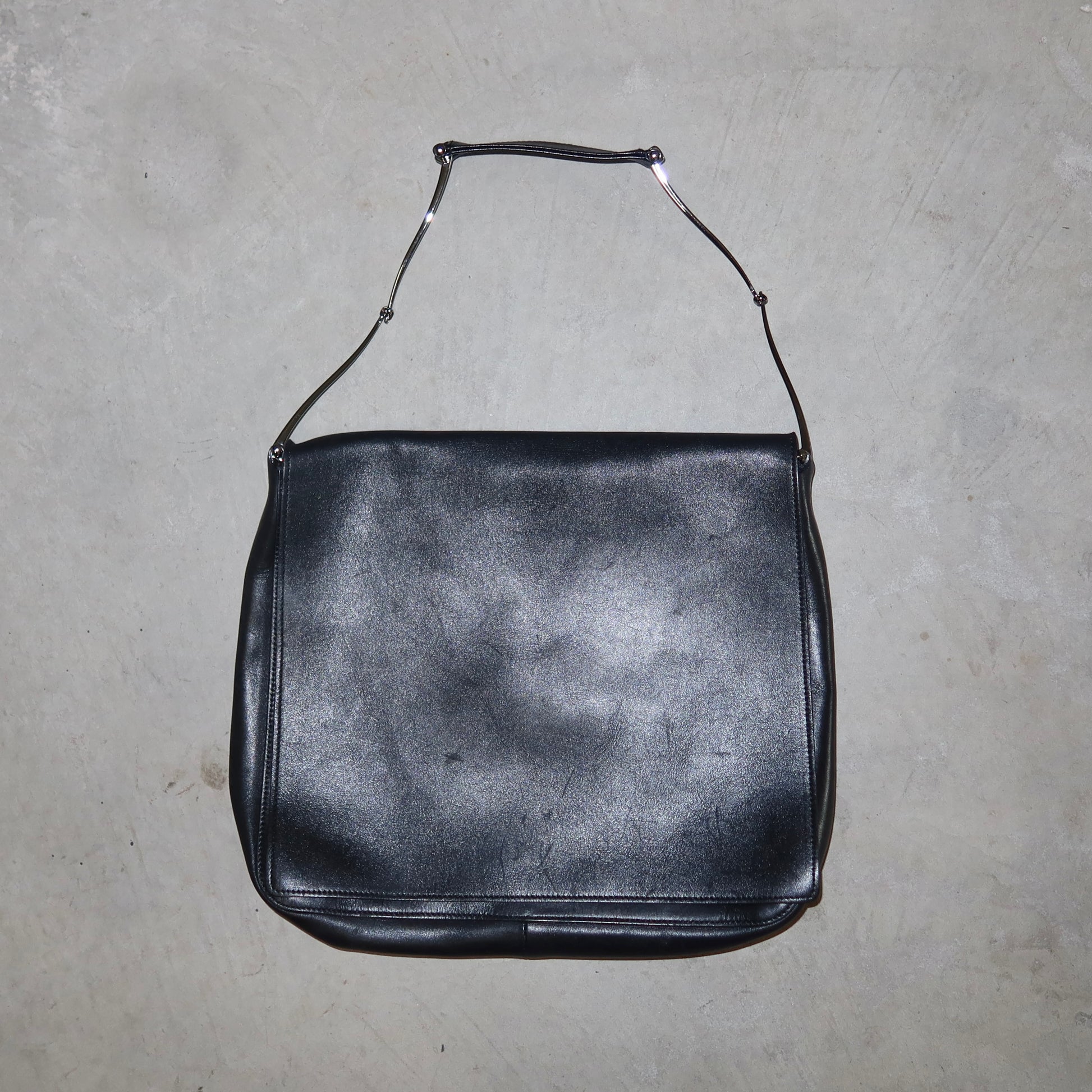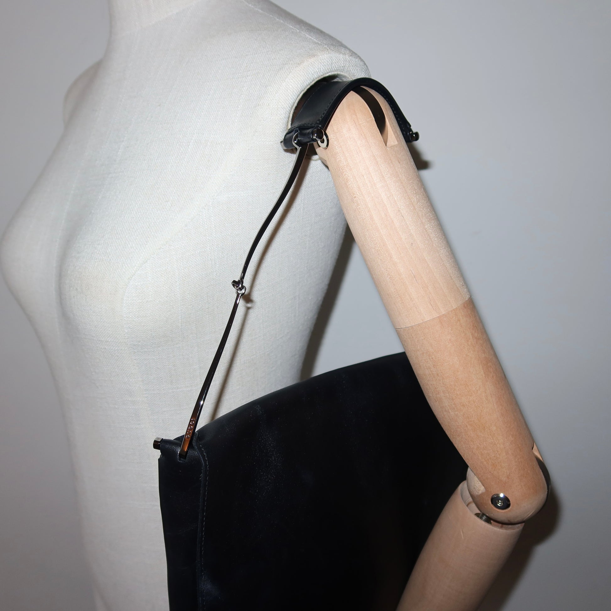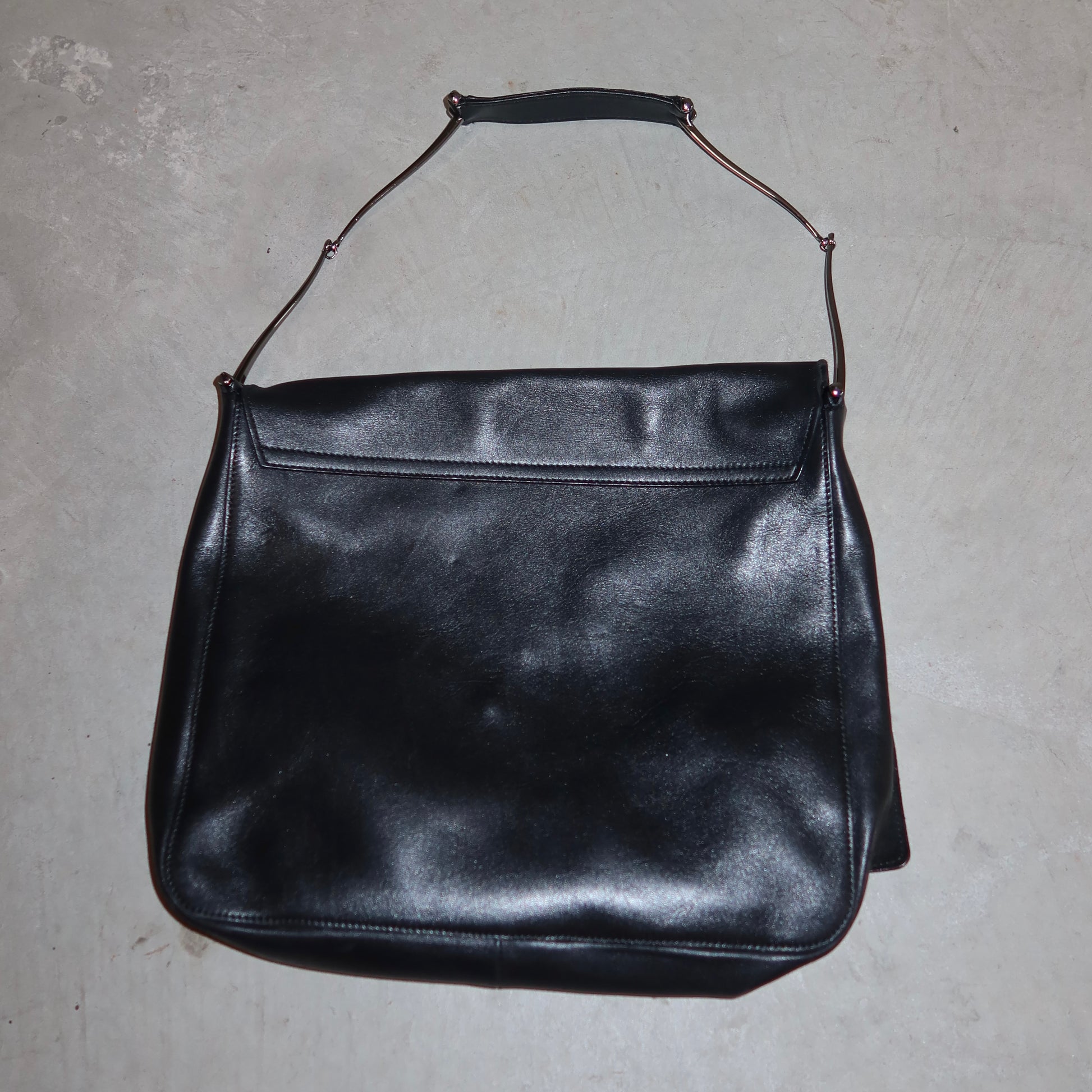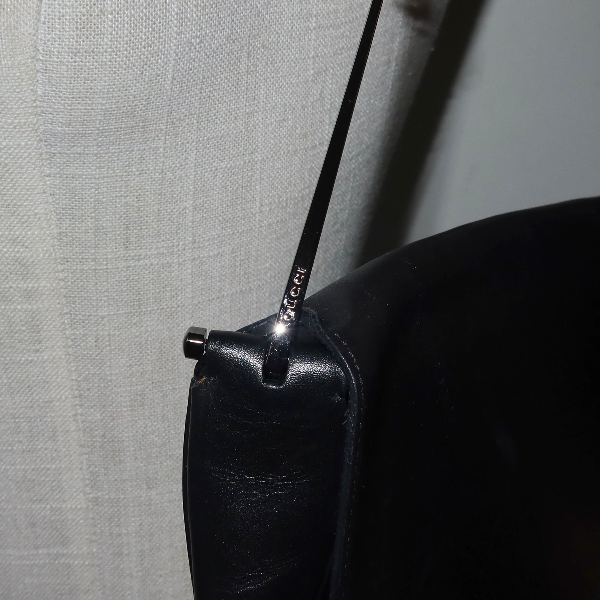 Beautiful black leather Gucci bag with iconic skinny horsebit handle. Front flap design with inner pouch attached to the inside of the bag for extra security. Tom Ford era.