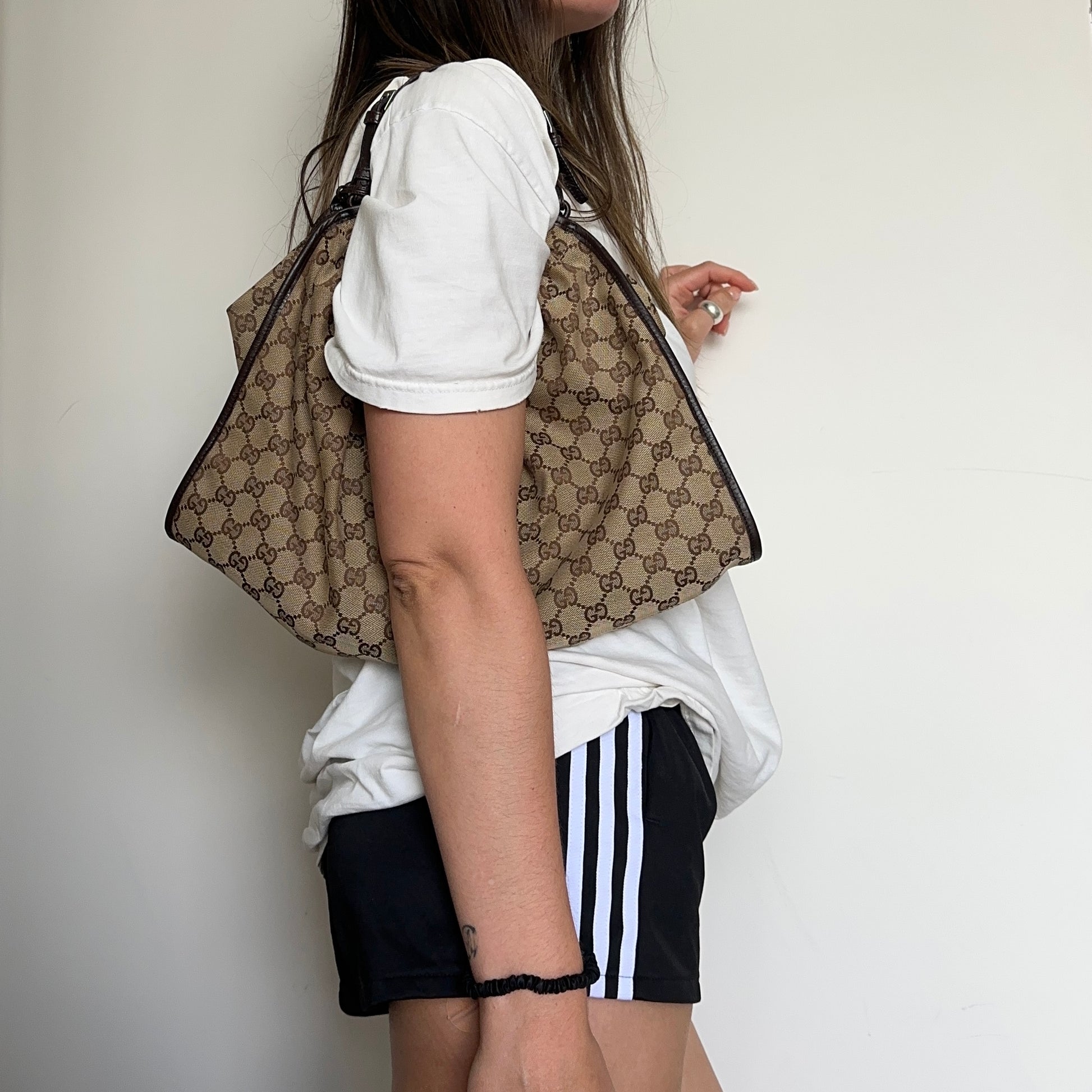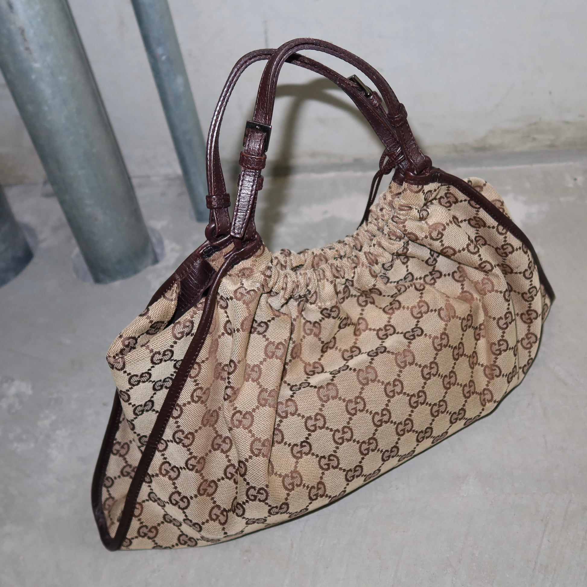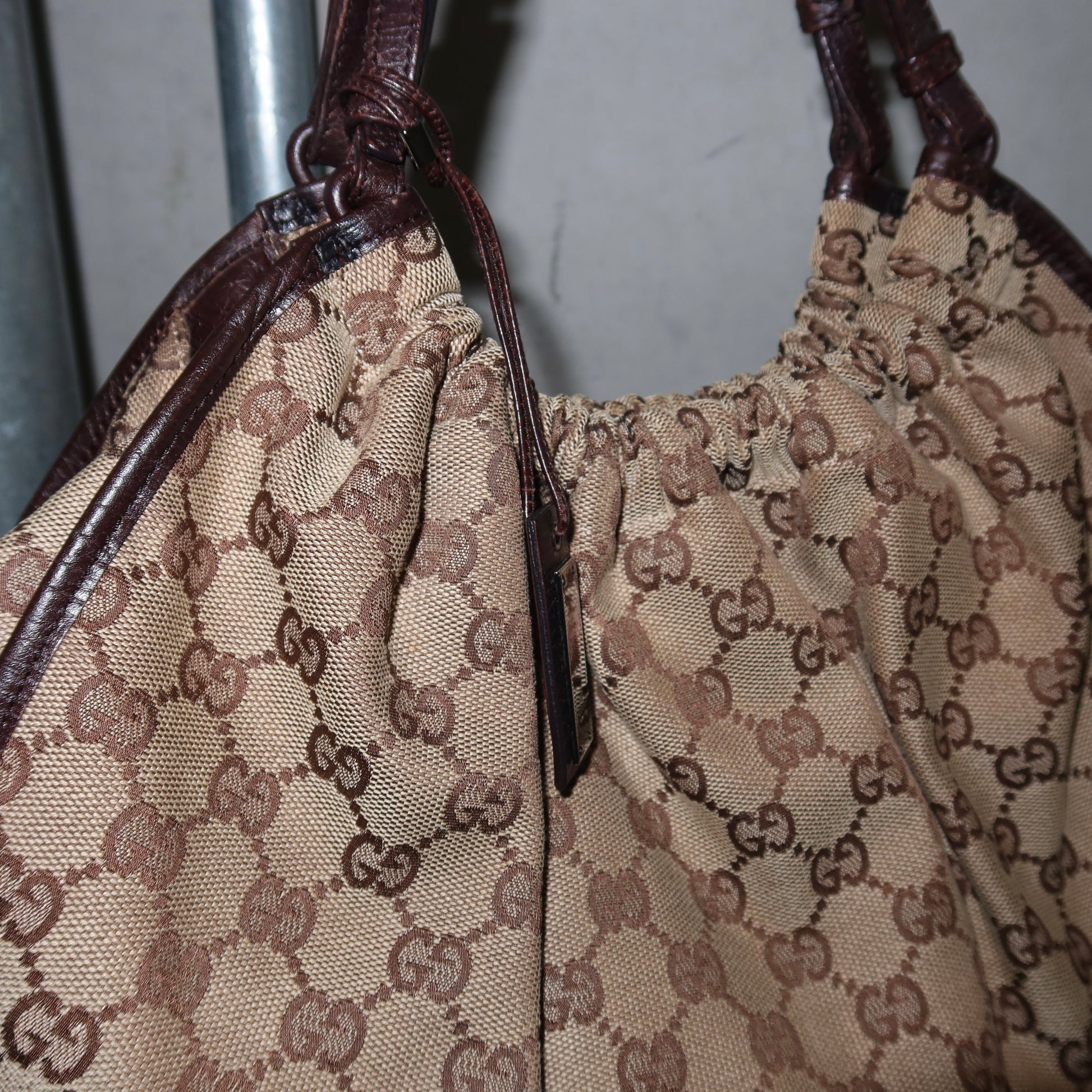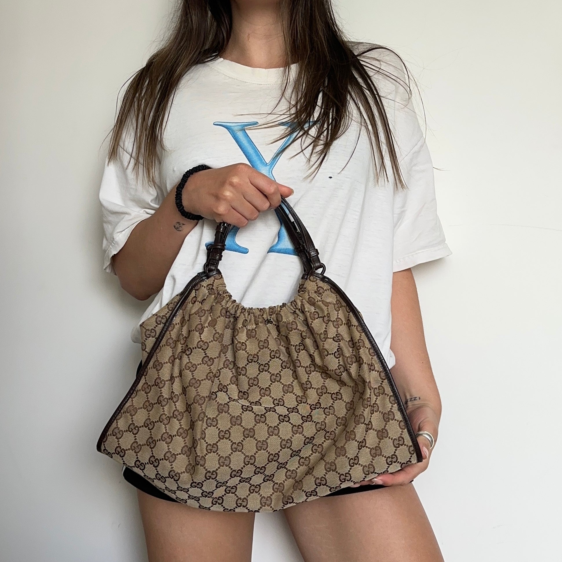 Gorgeous Gucci monogram slouchy handbag with brown leather buckle style handles and accents. Tom Ford era. Can fit over the shoulder but is very snug!!! Best used as a handbag.