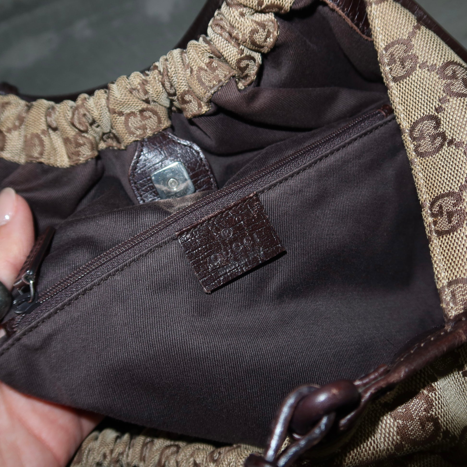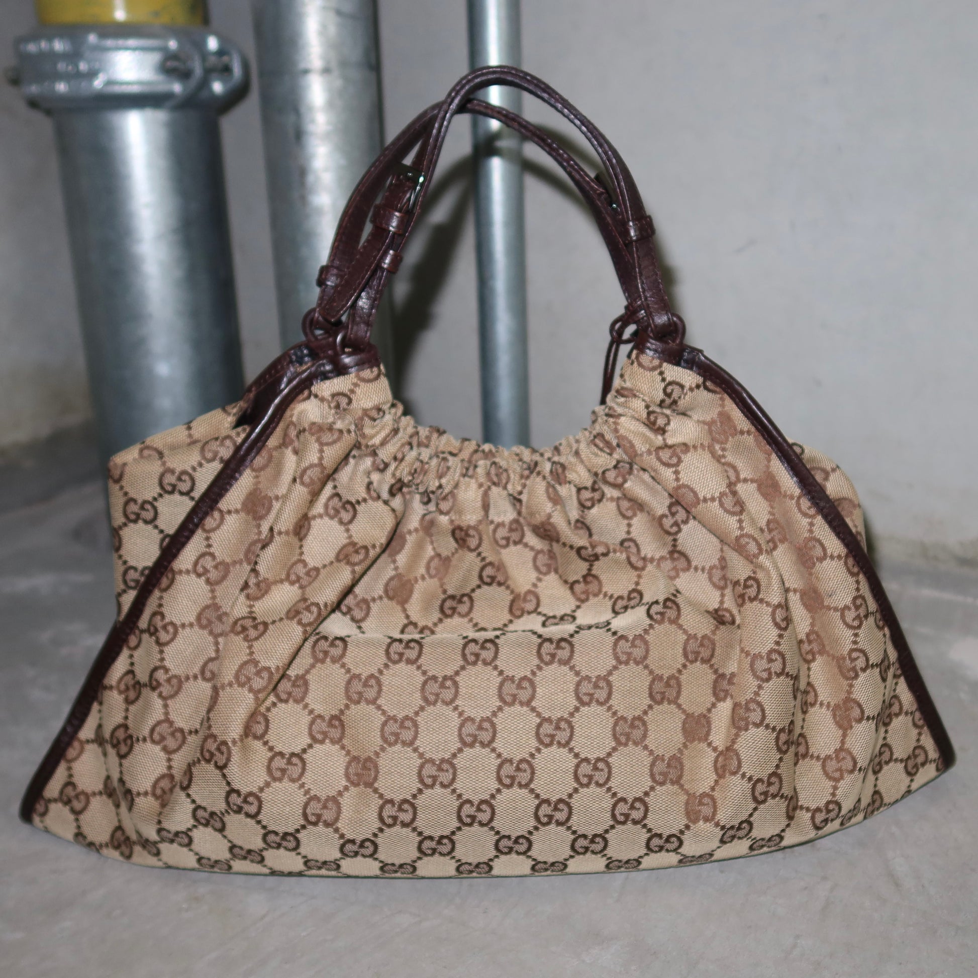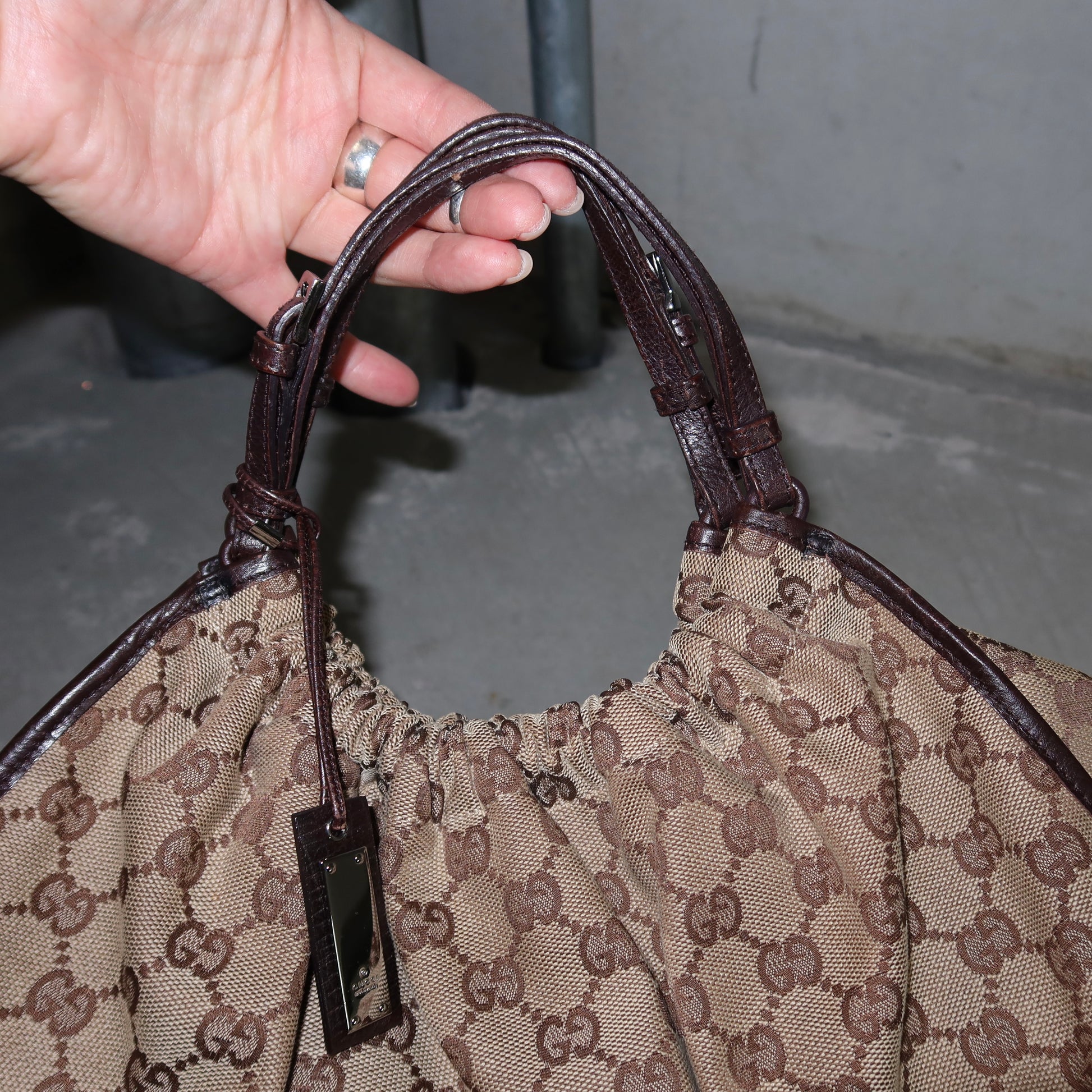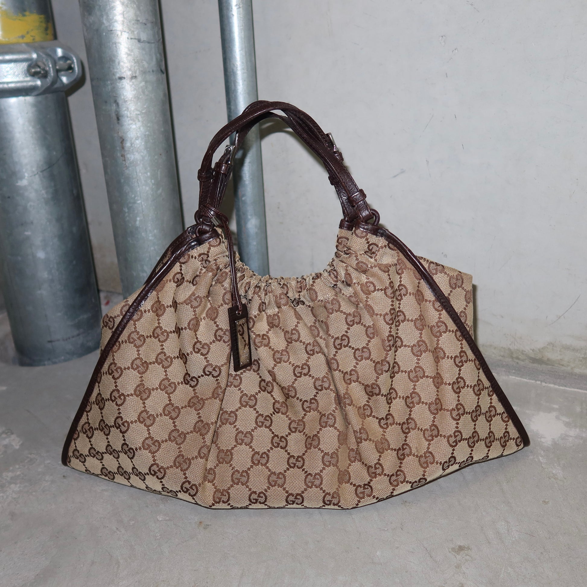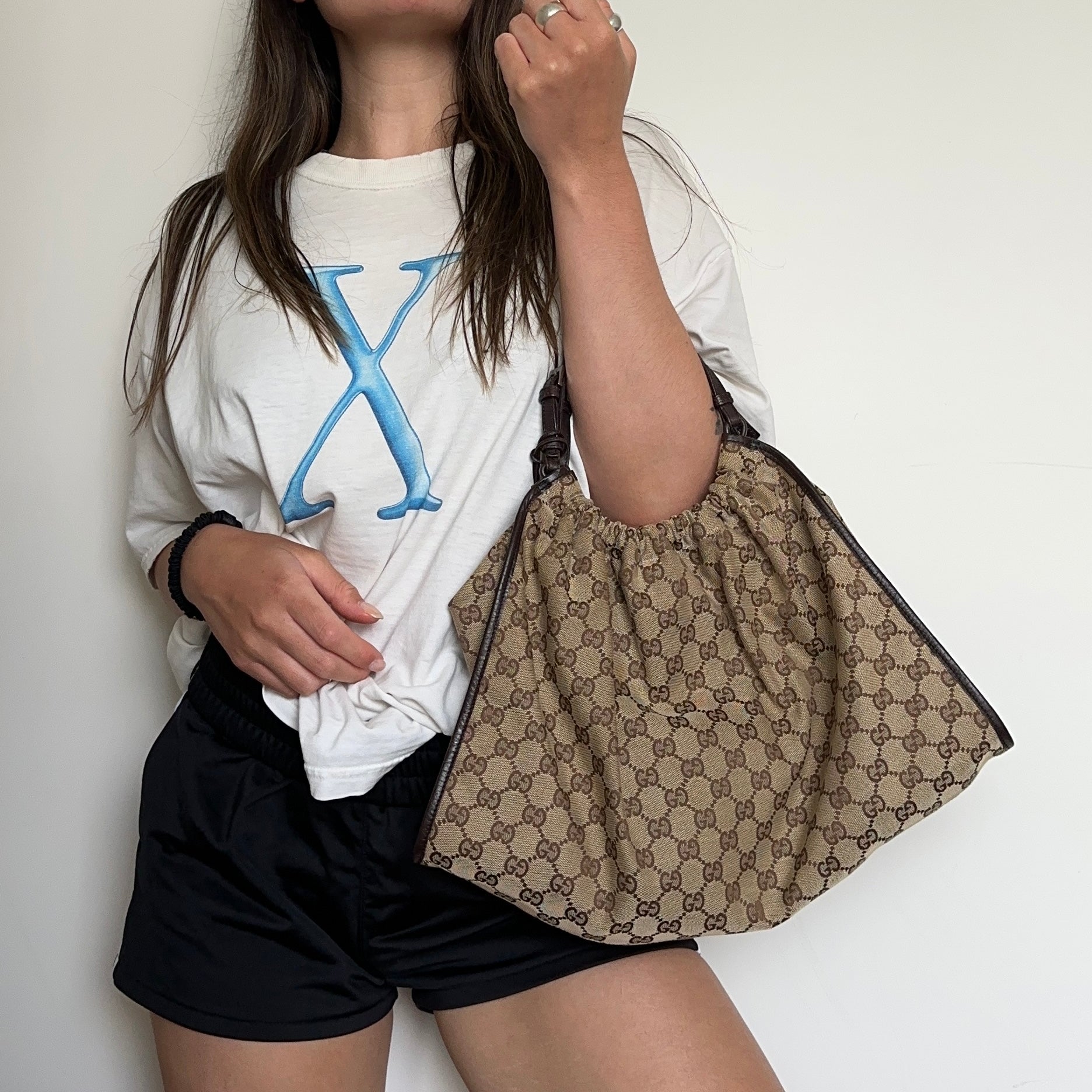Gorgeous Gucci monogram slouchy handbag with brown leather buckle style handles and accents. Tom Ford era. Can fit over the shoulder but is very snug!!! Best used as a handbag.