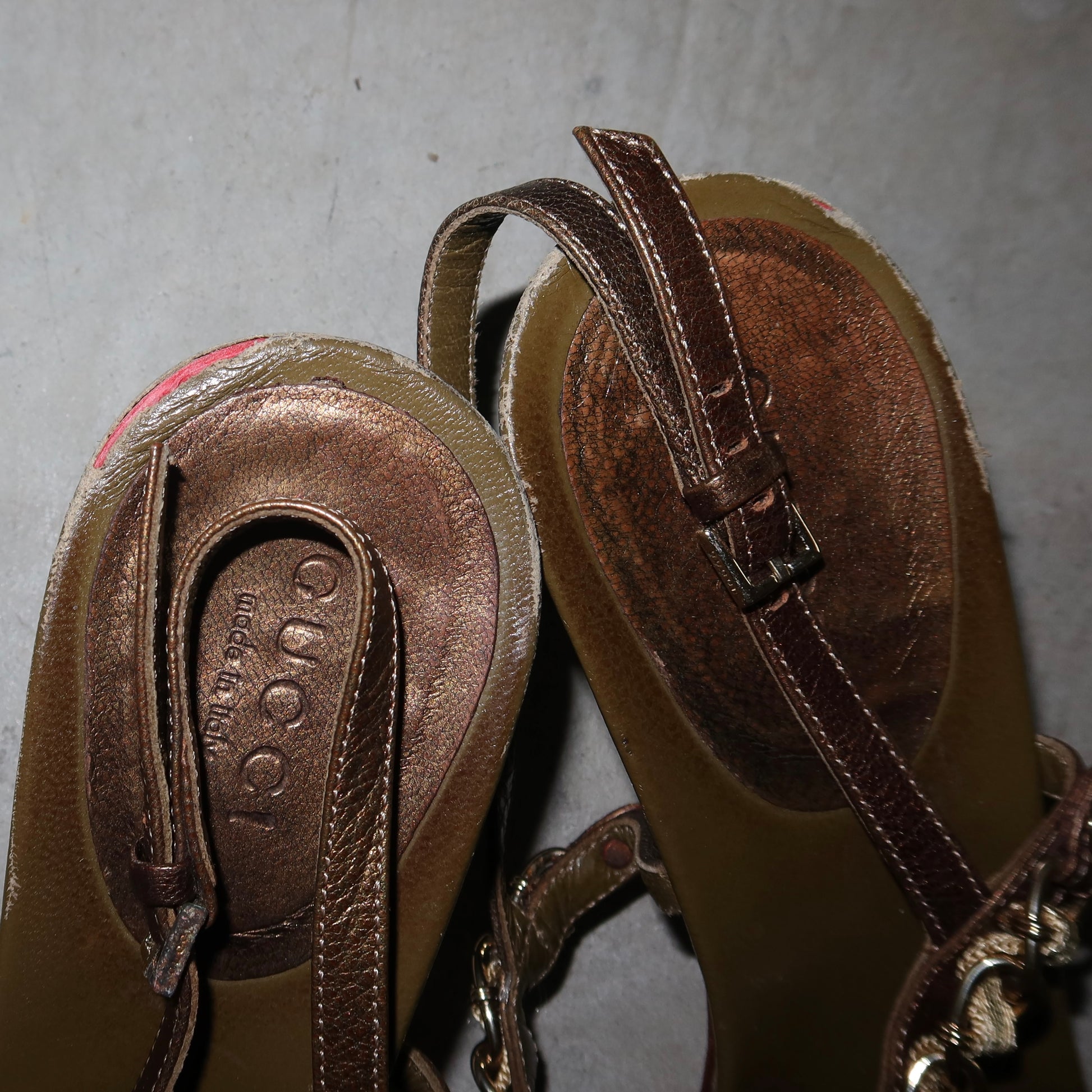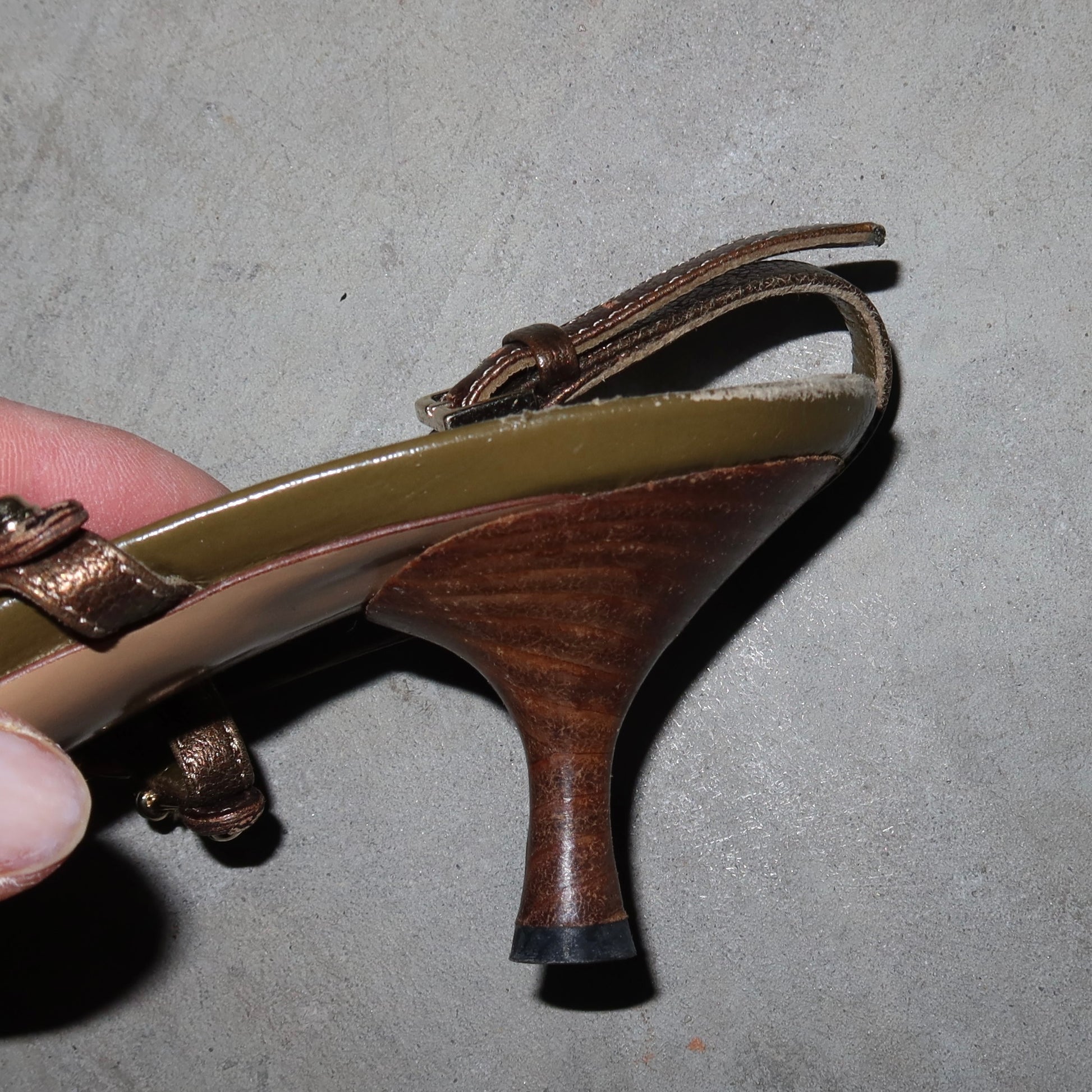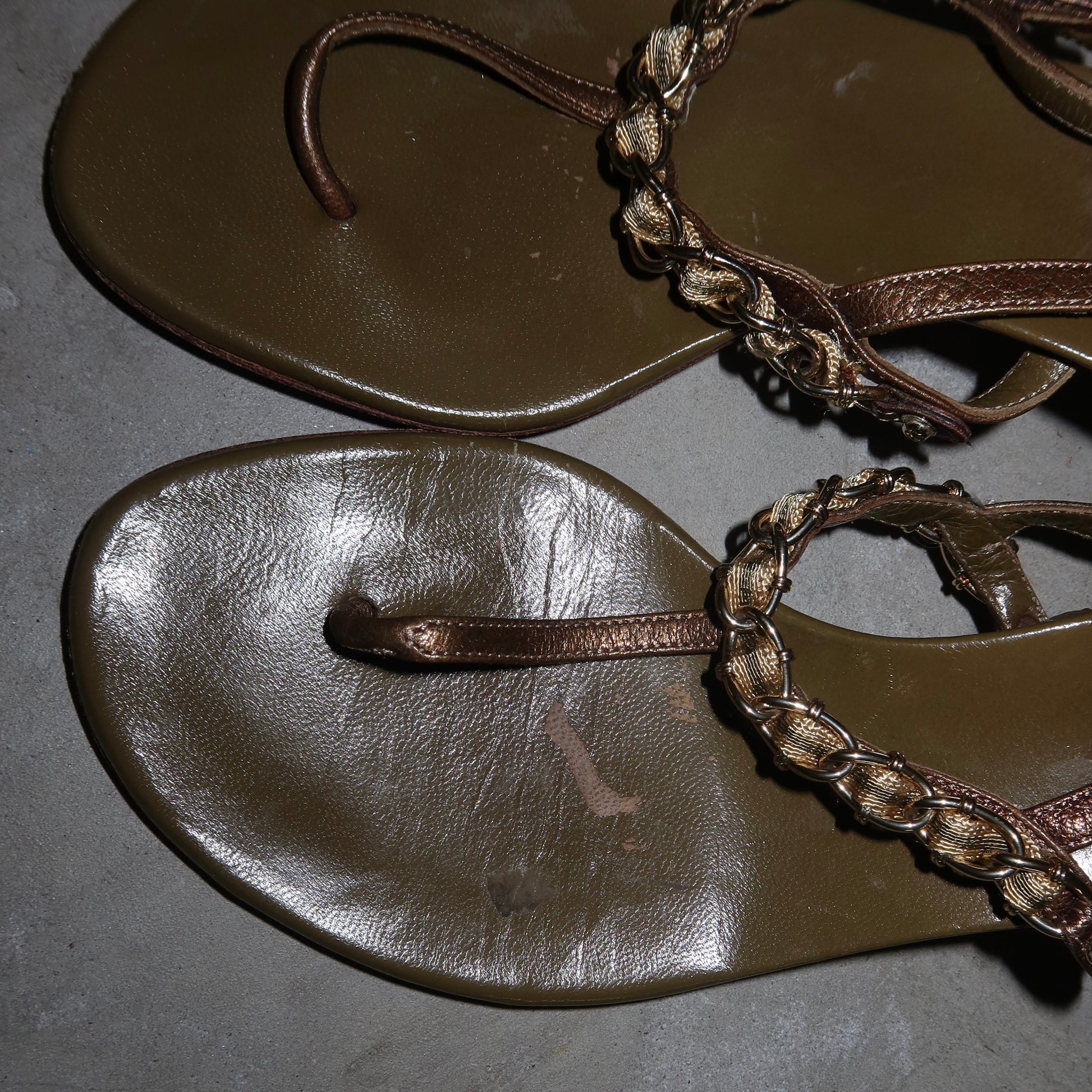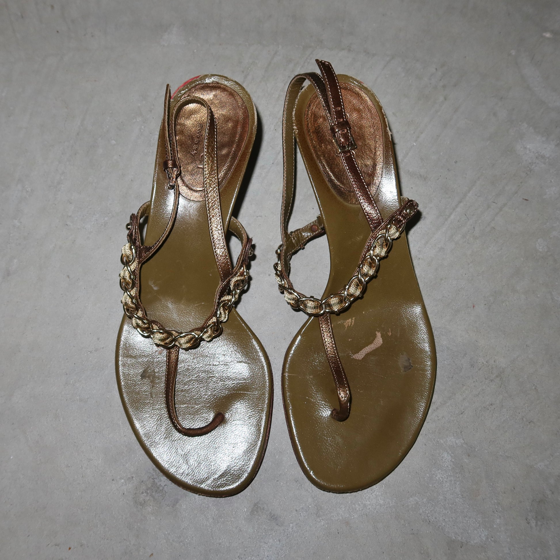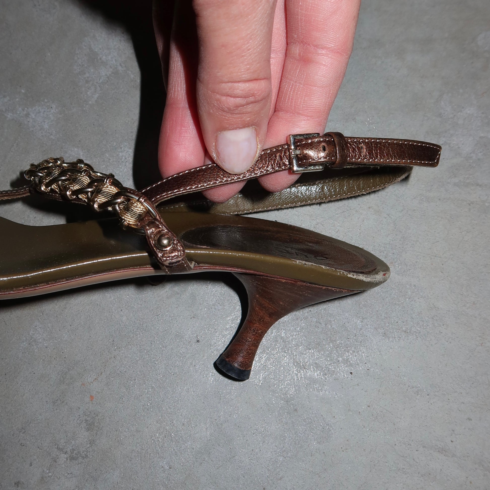 Gorgeous khaki kitten heels by Gucci with sexy chain strap detailing.
