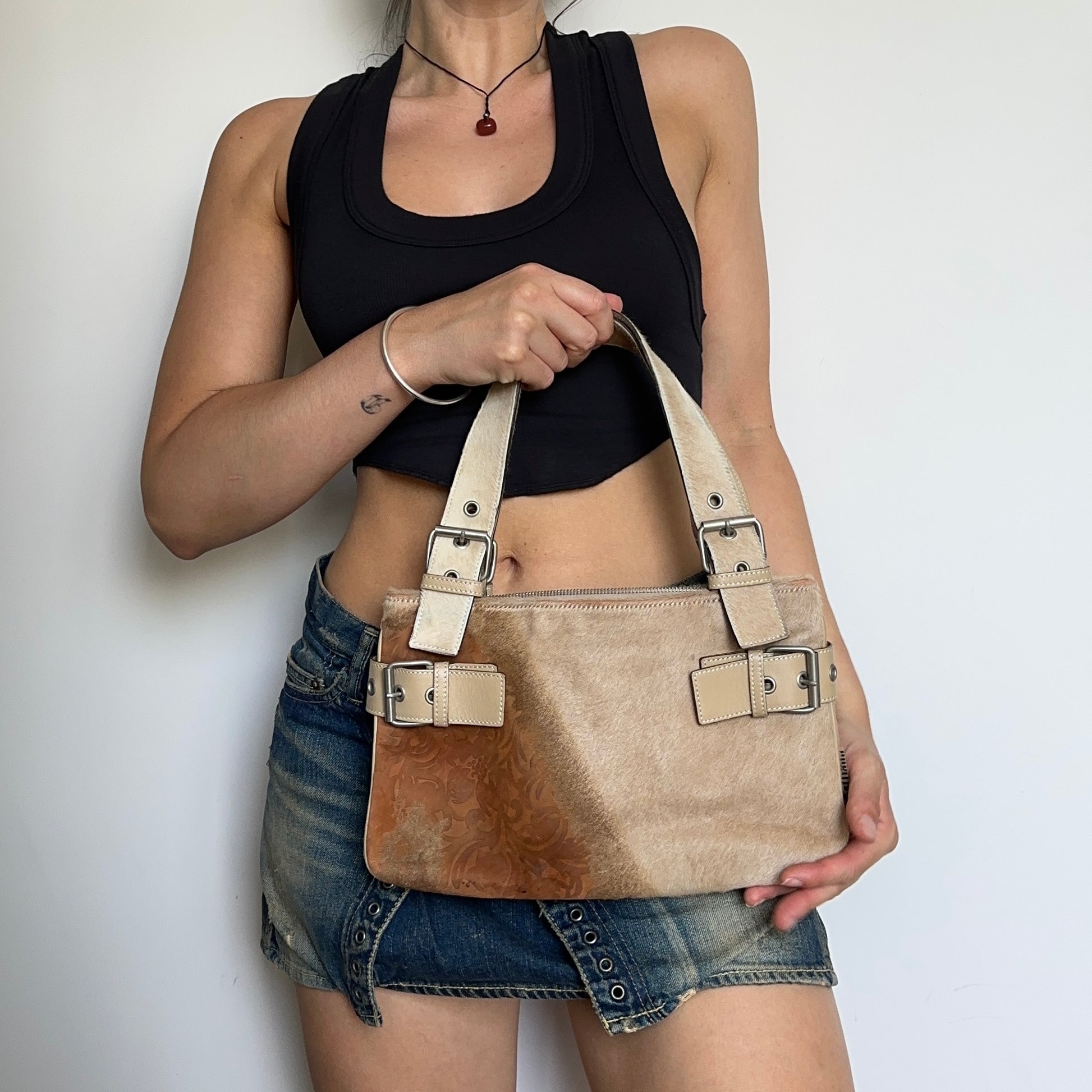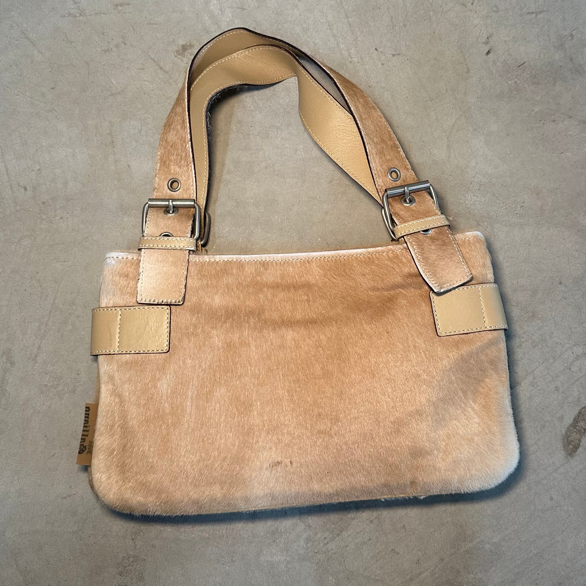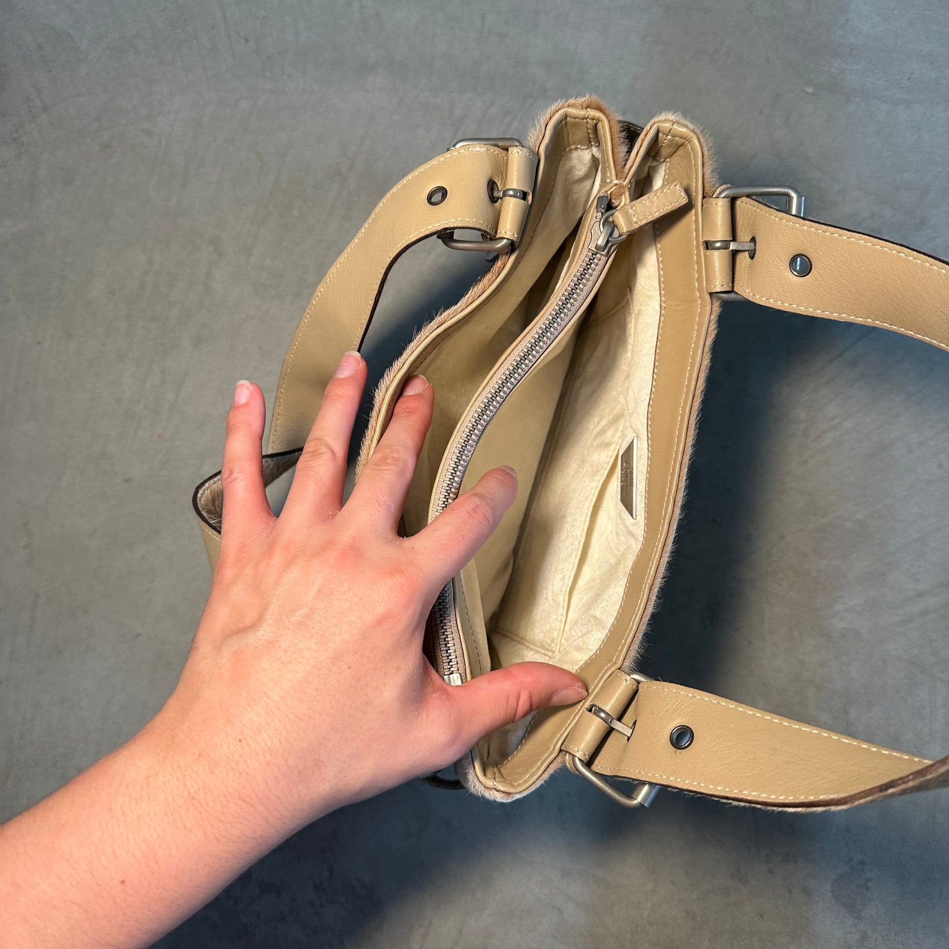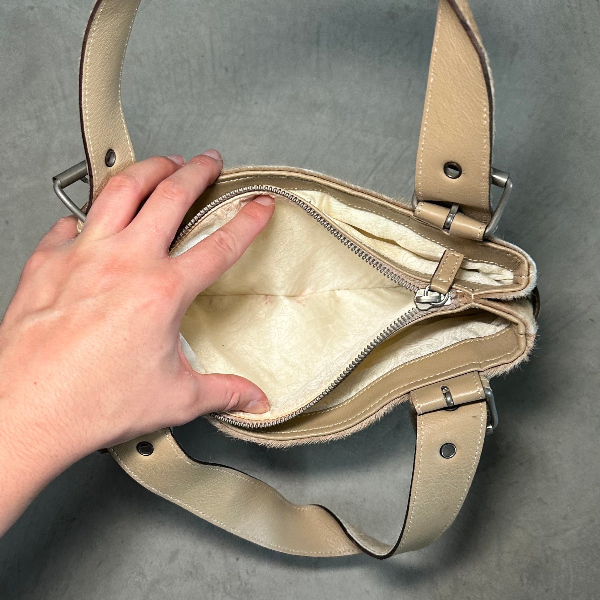 Gorgeous cowhide John Galliano bag with cute buckle detailing.