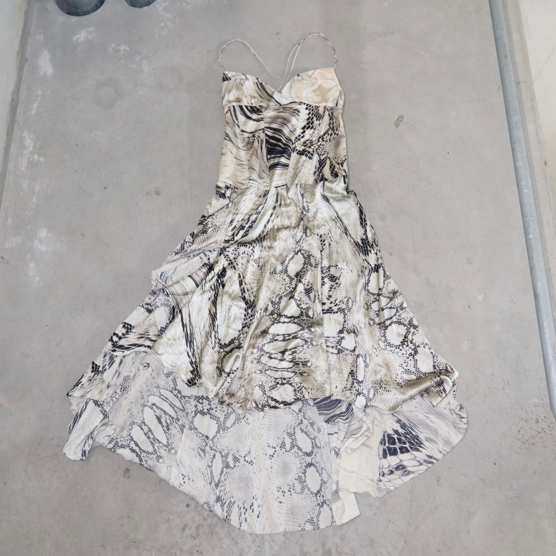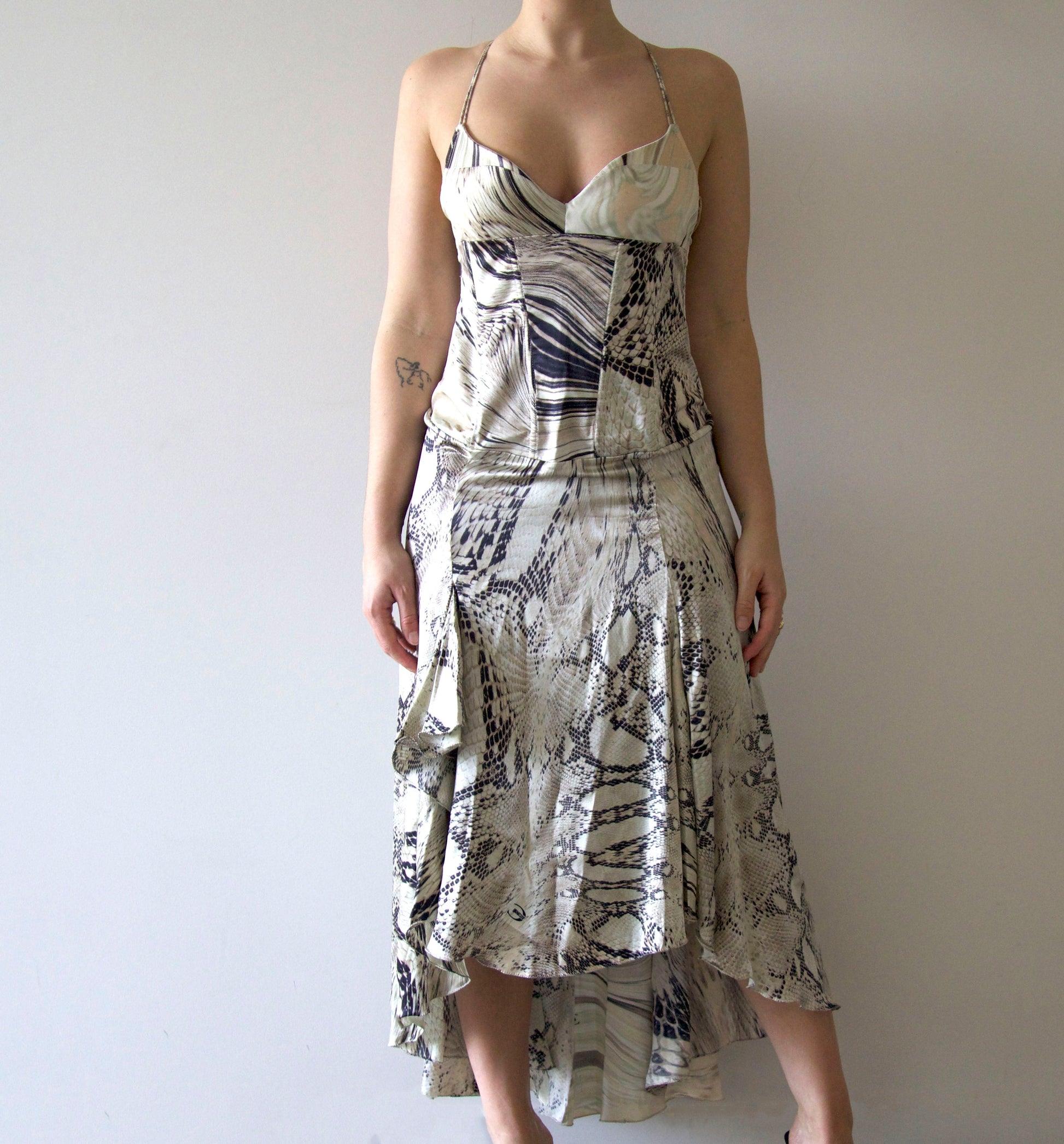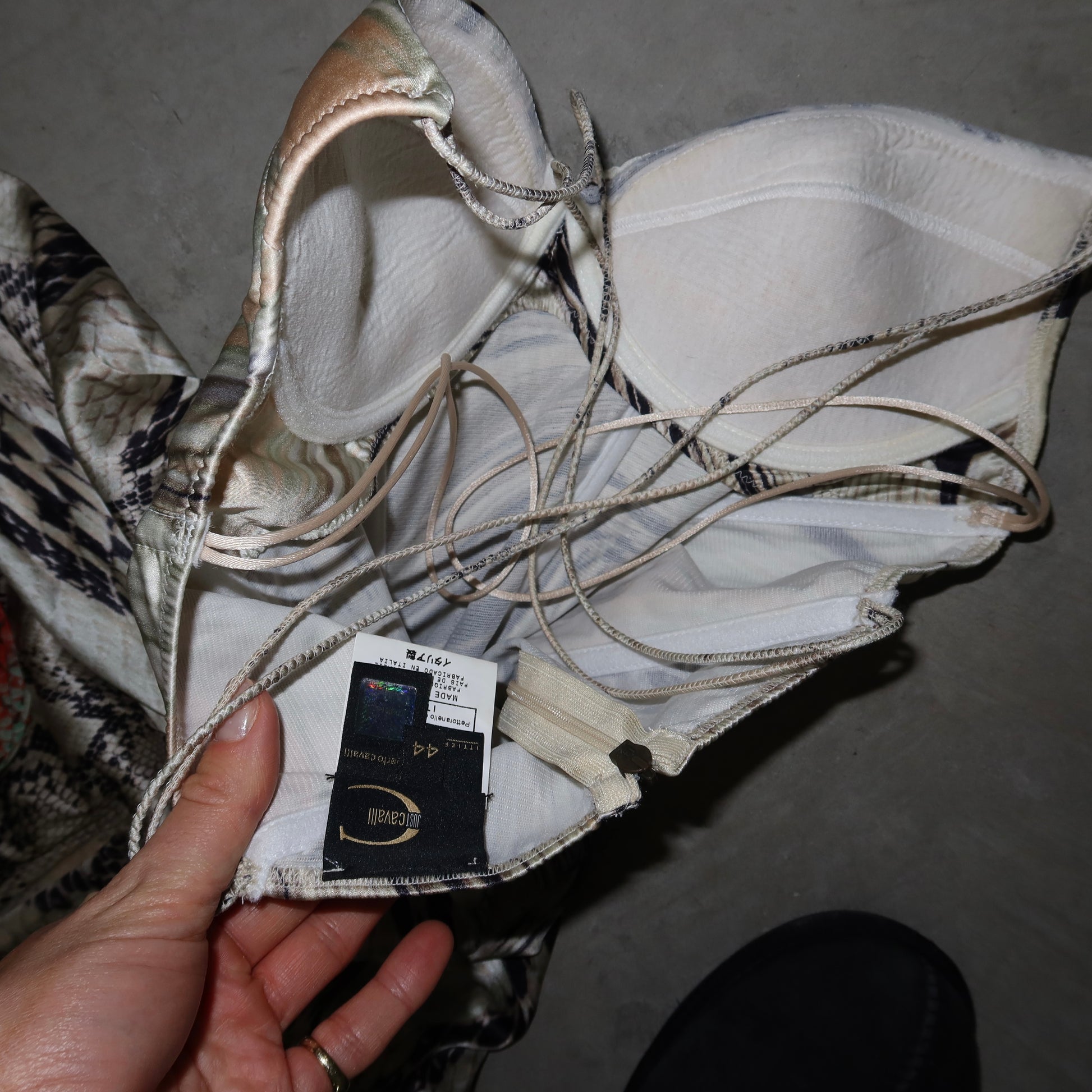 Gorgeous silk midi dress by Just Cavalli. Hi-low hem. Corseted with padded cups. The mini version was seen on Maria Carey in the 'Obsessed' music video. Also the same design was recently seen on influencer Summer Warren (Final pics)!