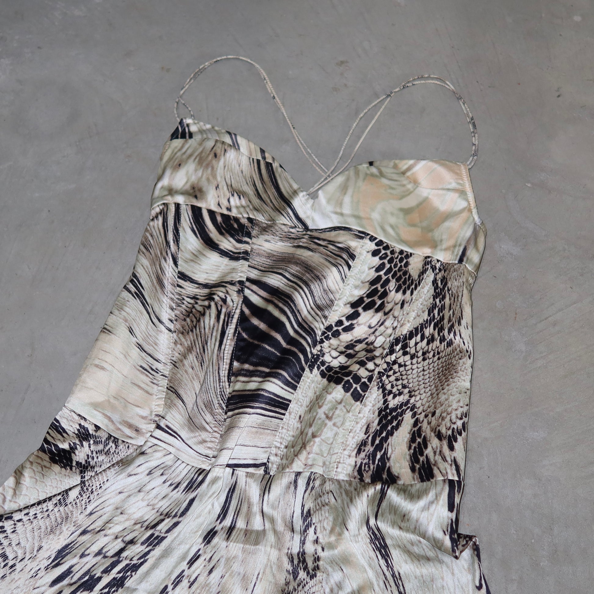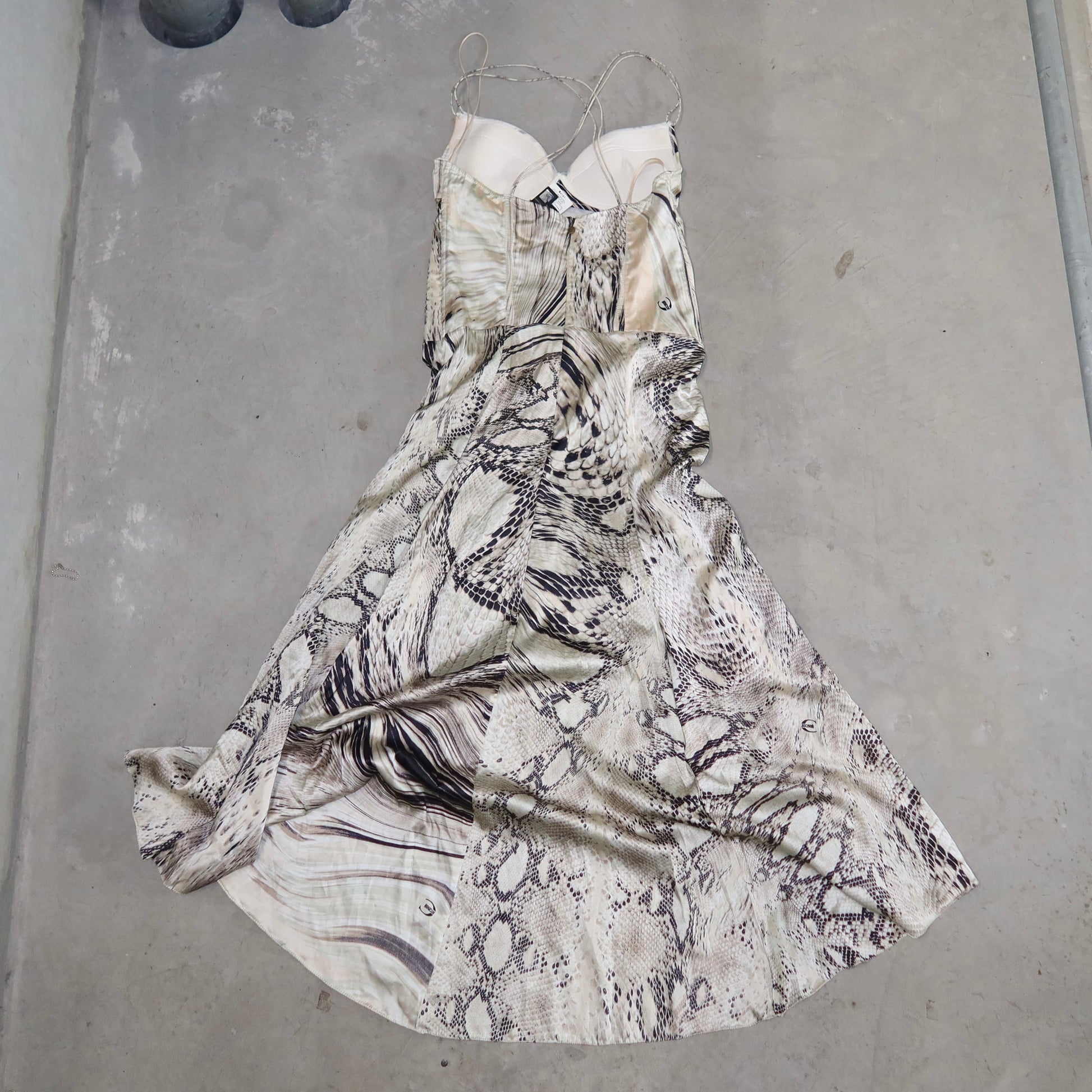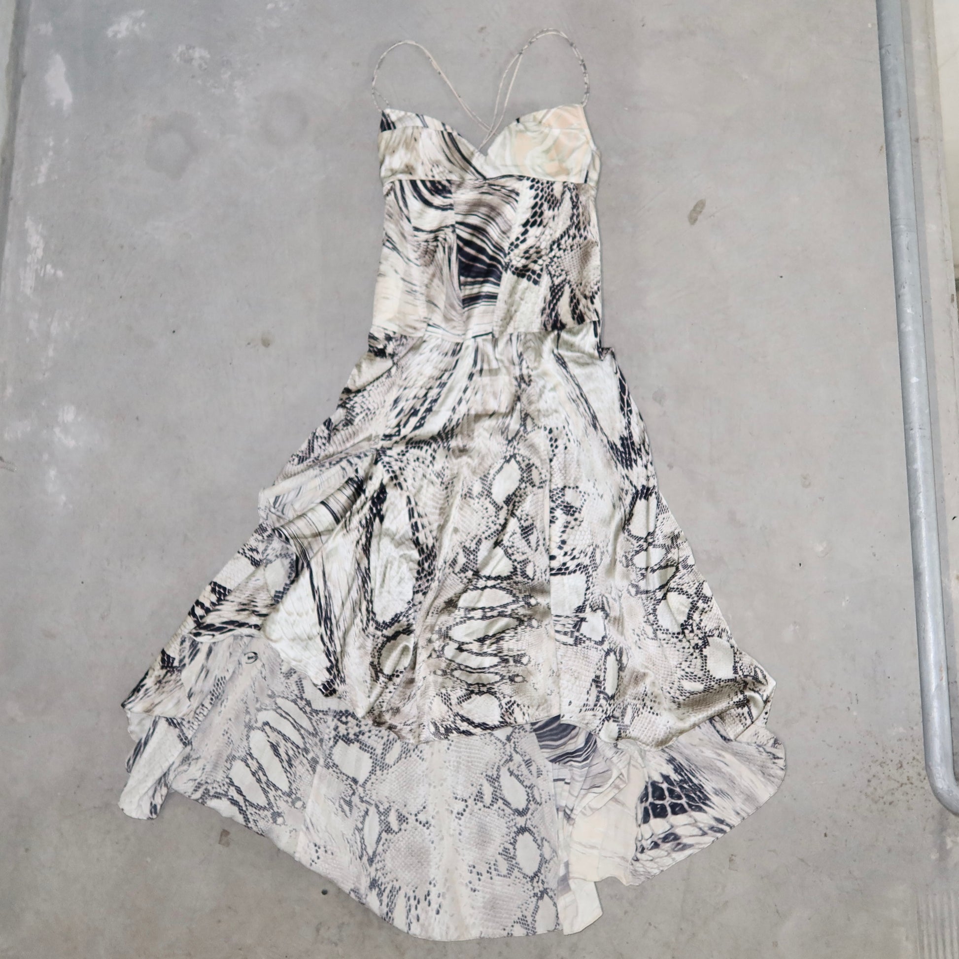 Gorgeous silk midi dress by Just Cavalli. Hi-low hem. Corseted with padded cups. The mini version was seen on Maria Carey in the 'Obsessed' music video. Also the same design was recently seen on influencer Summer Warren (Final pics)!