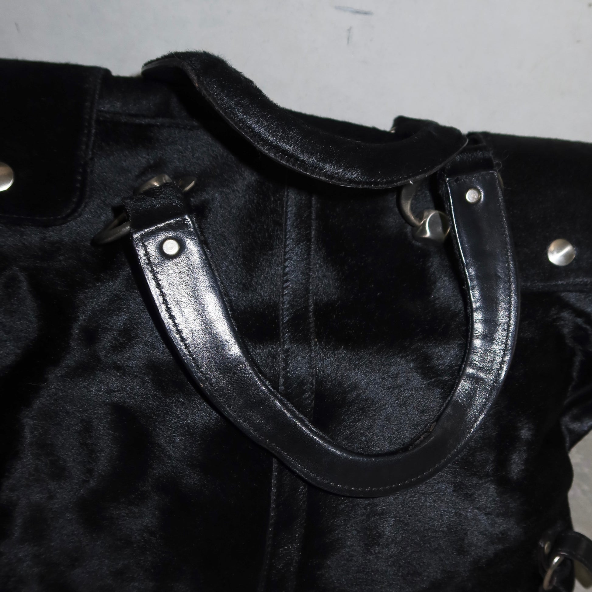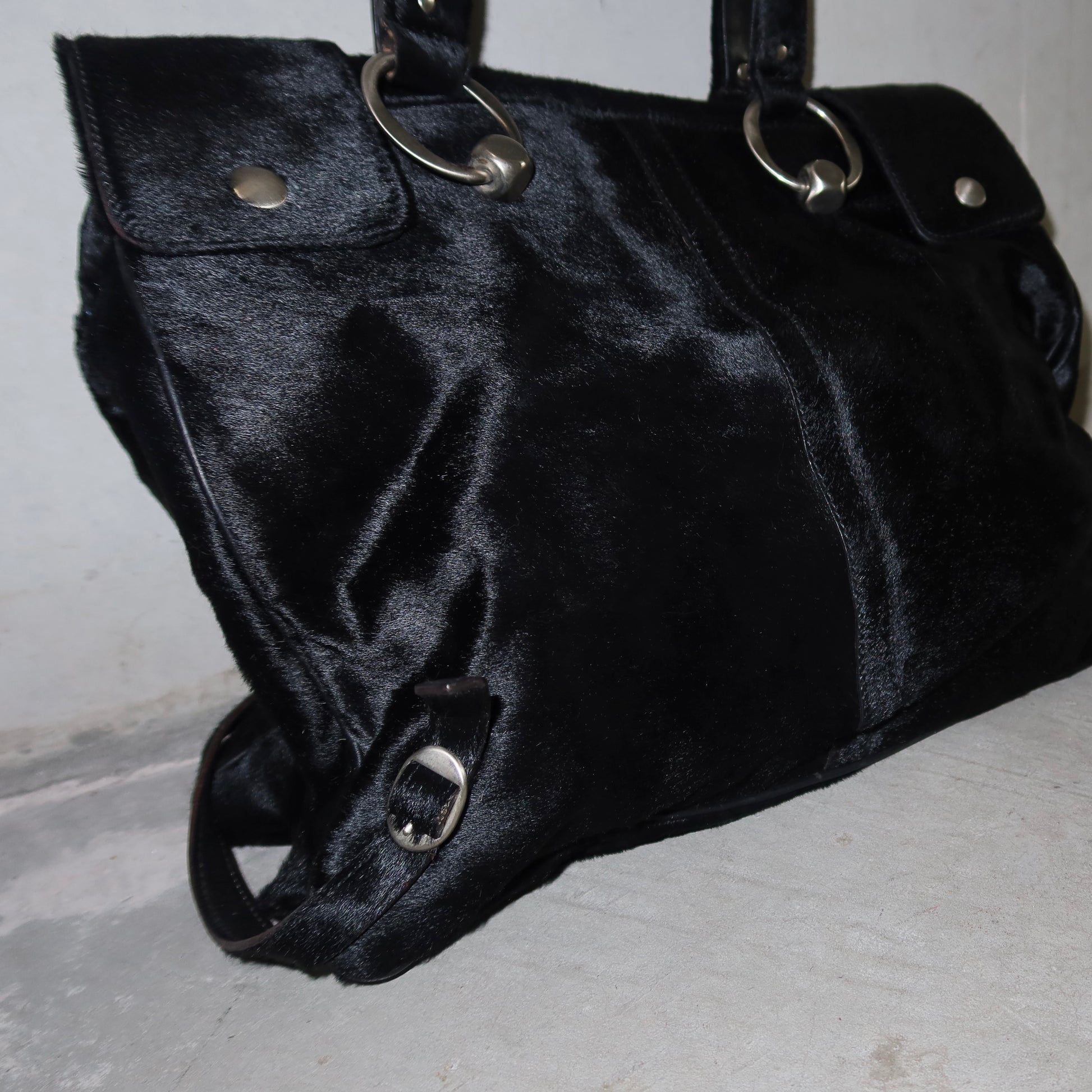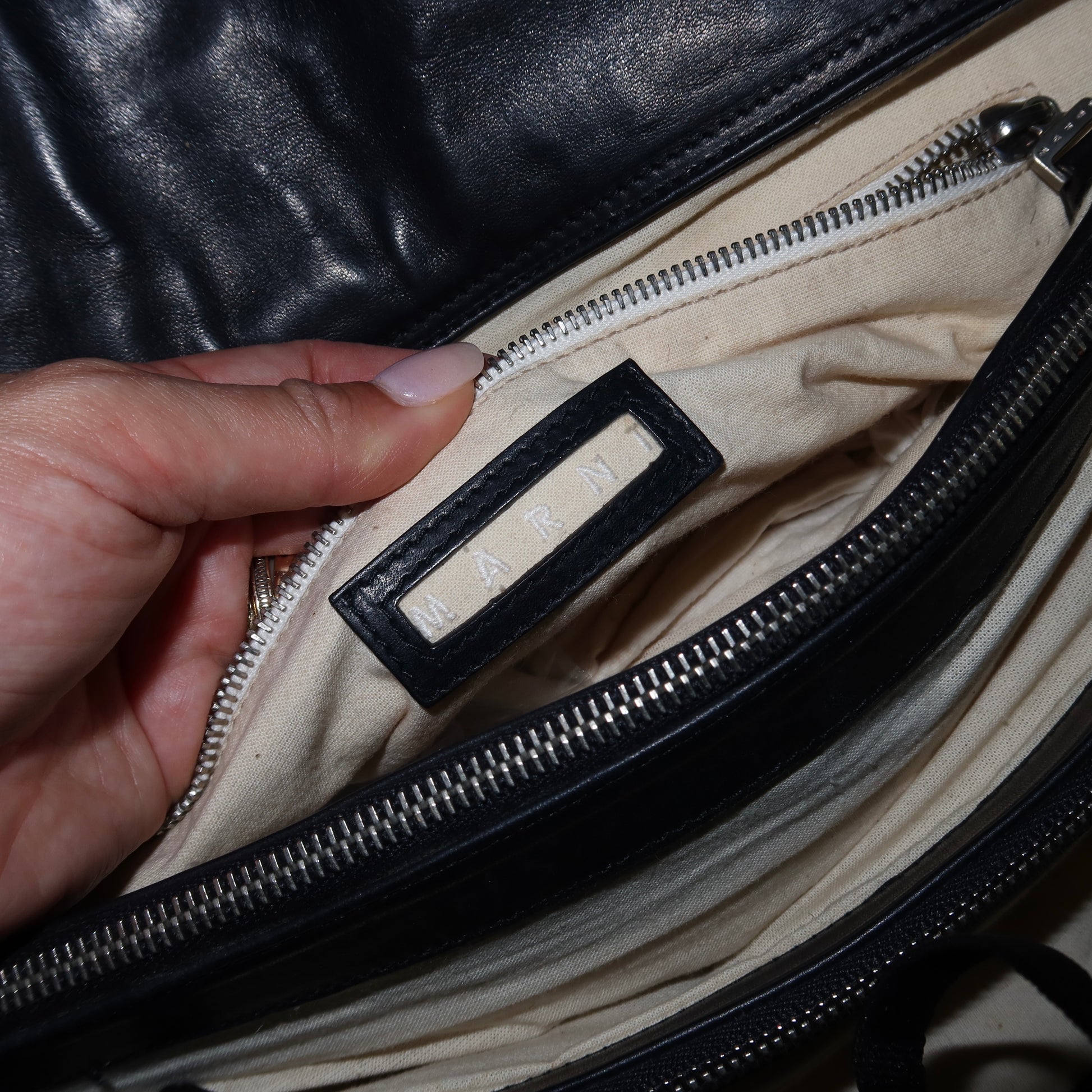 This black cowhide Marni beauty boasts 6 compartments and room for a 13" Macbook! Sits on the nook of the arm.