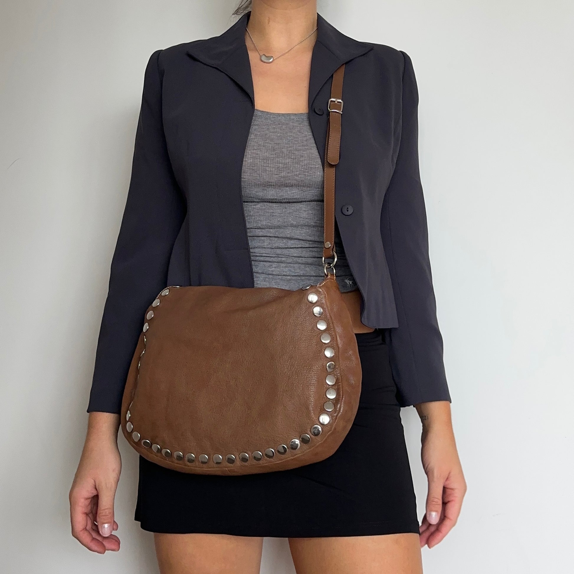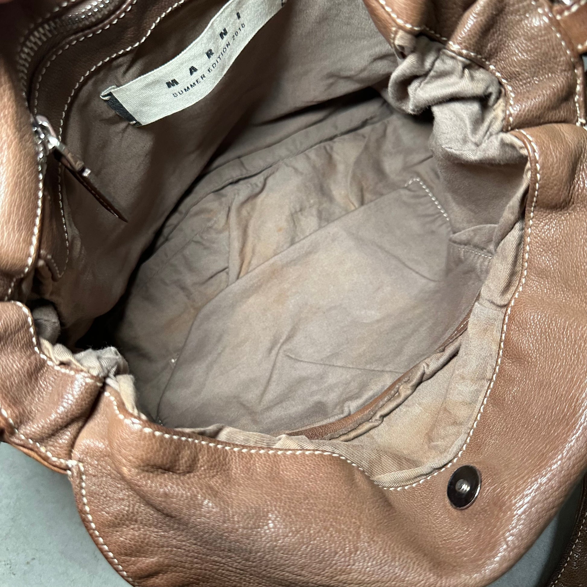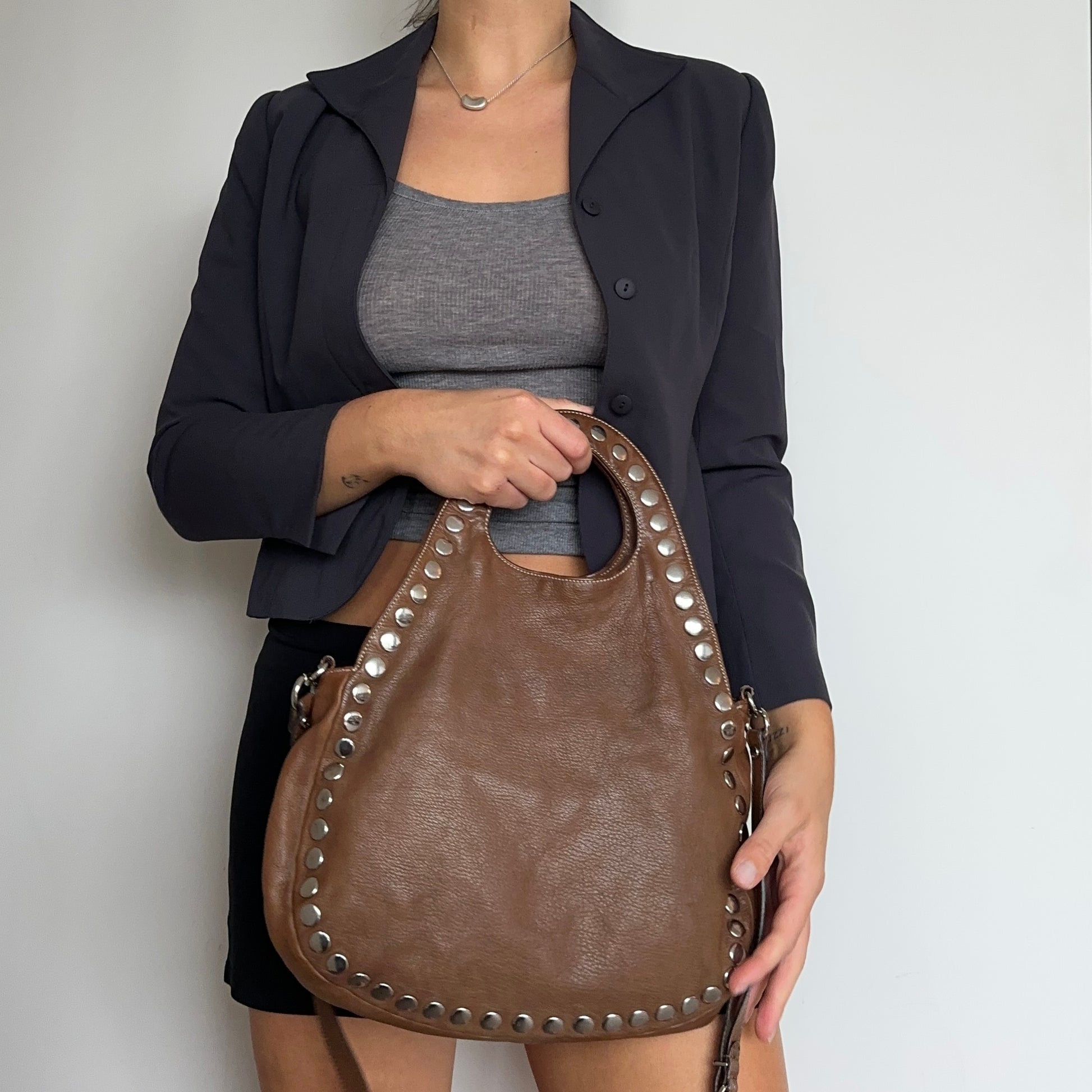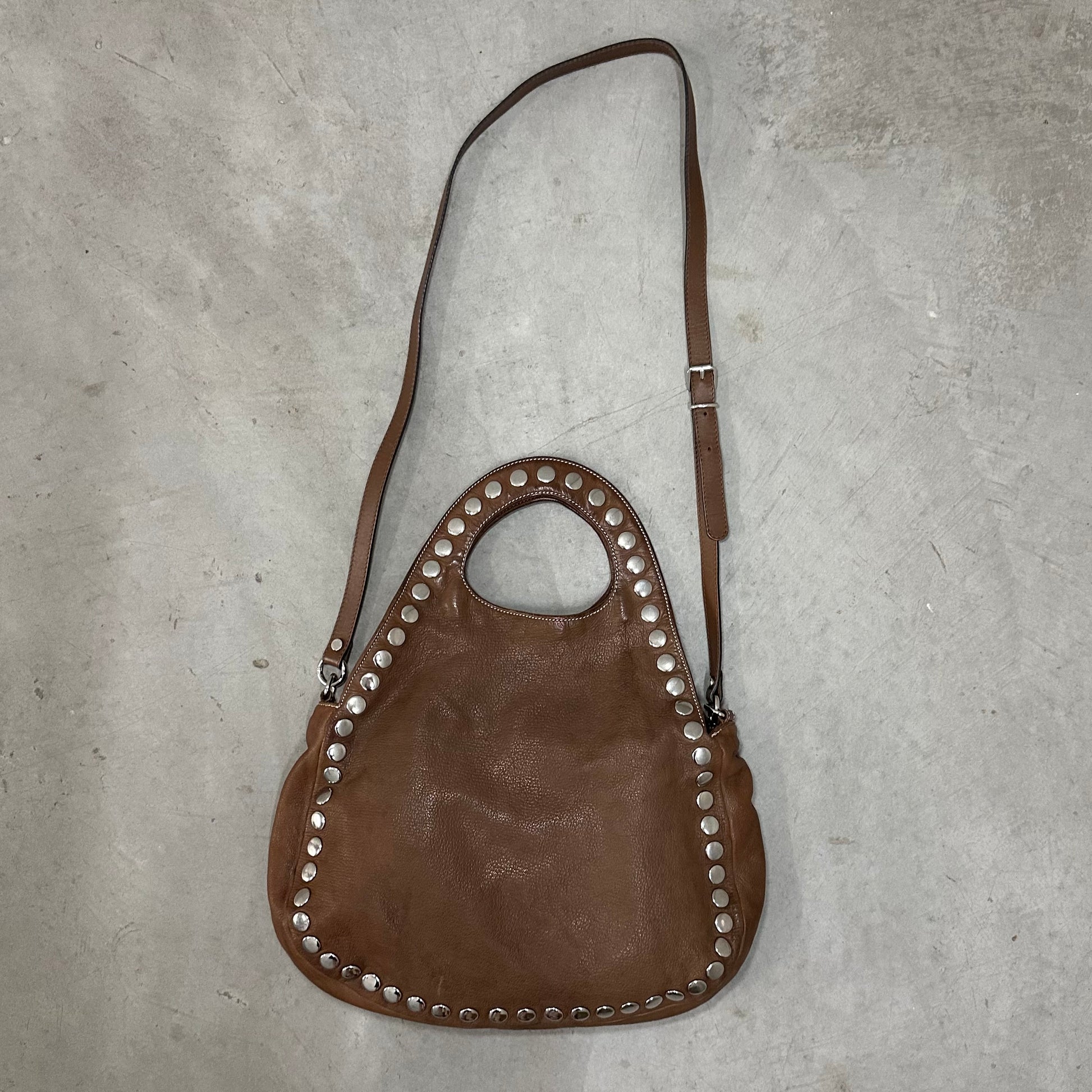 Amazing brown leather studded rare Marni bag from their Summer 2010 collection. This bag can be held by its handle or across the body with it's removable long strap. A rare find.