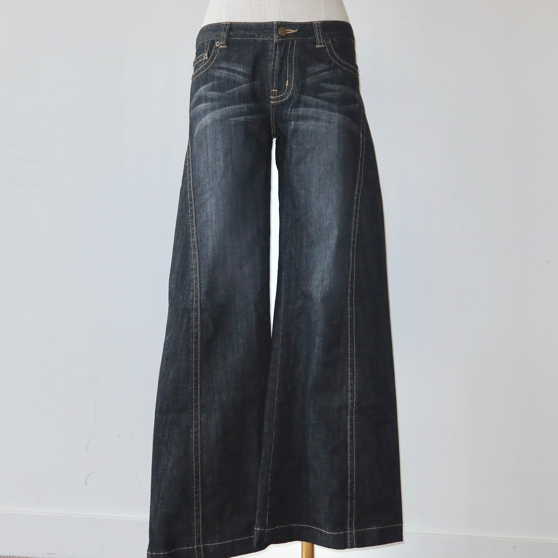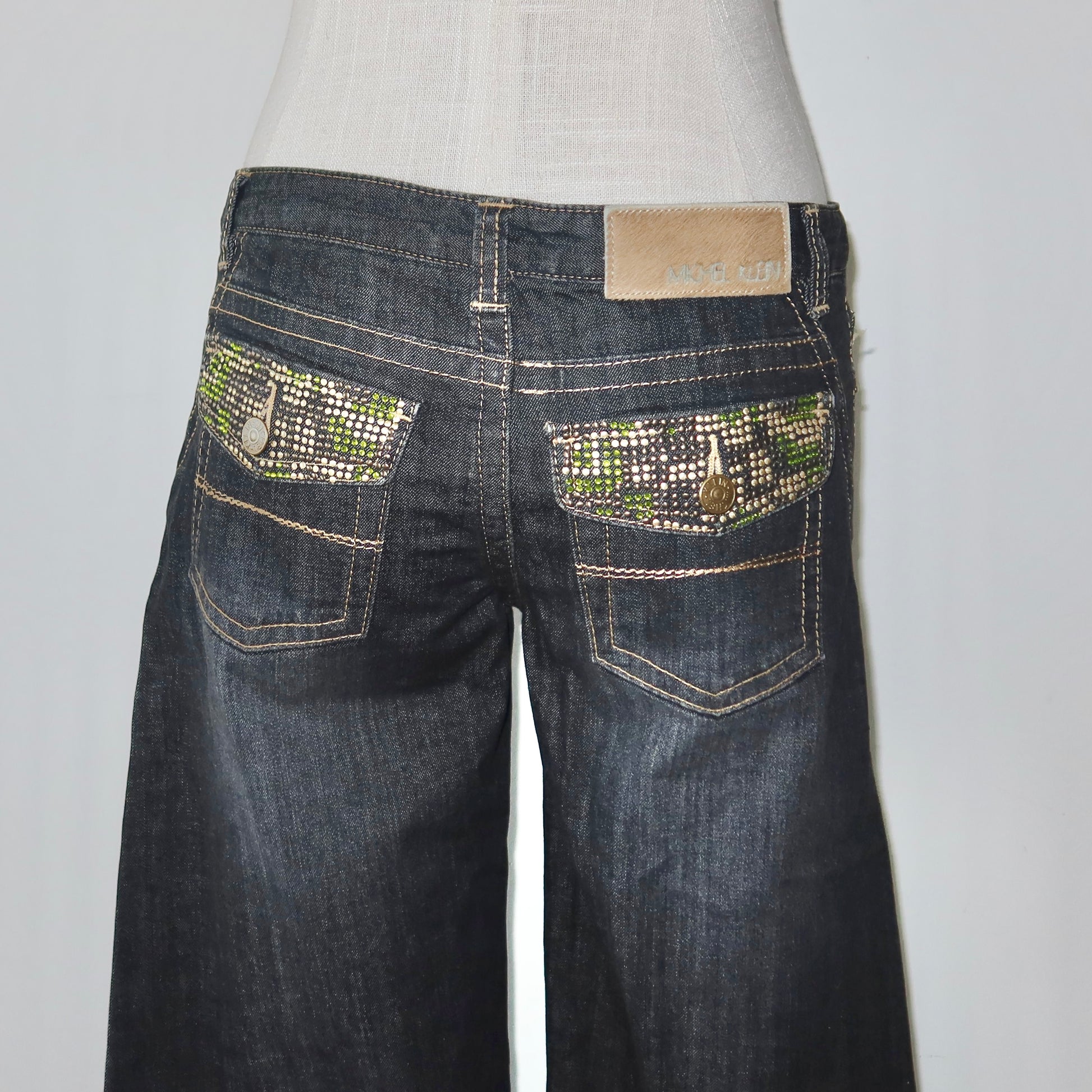 Beautiful dark wash wide leg jeans with cowhide back patch and camo print rhinestone pockets.