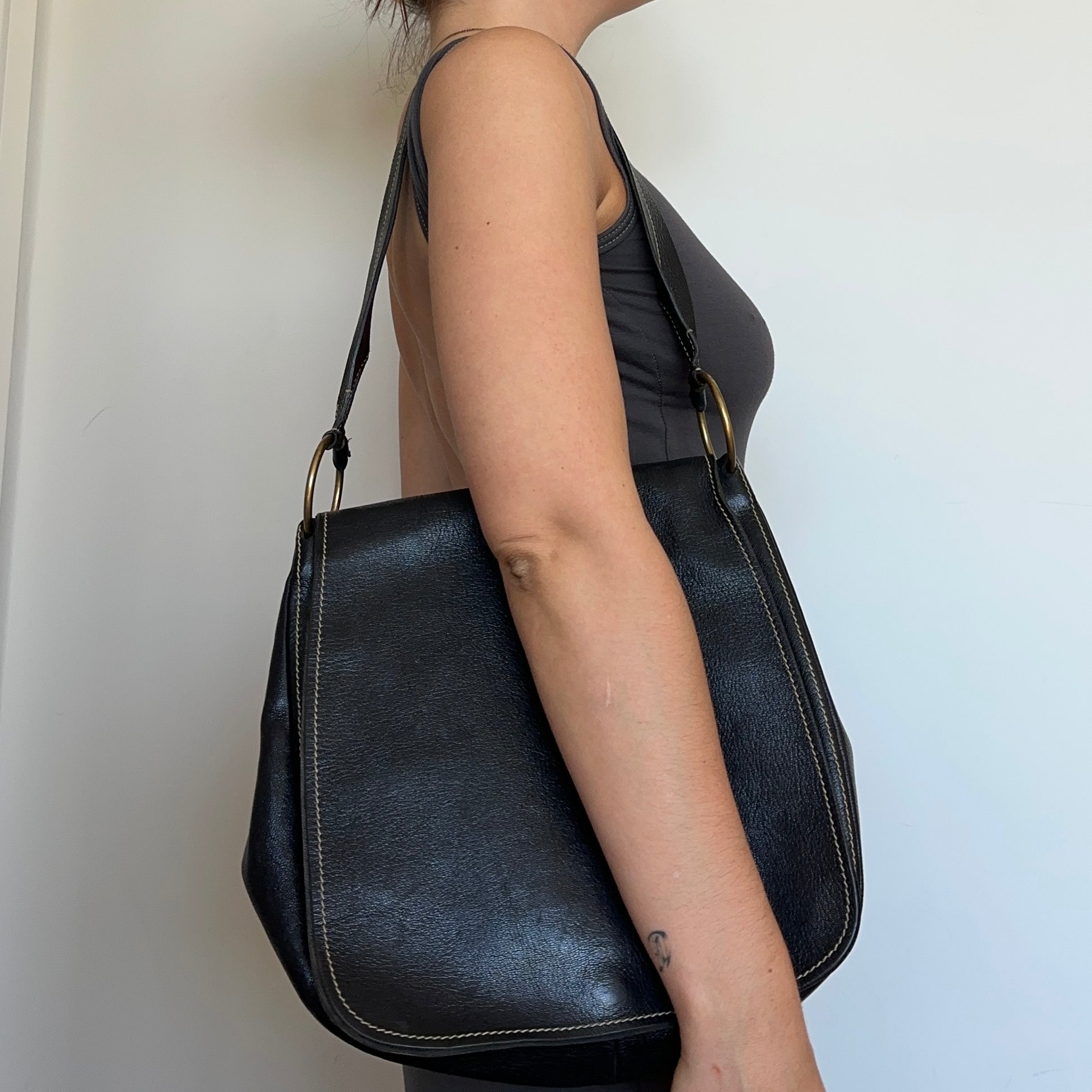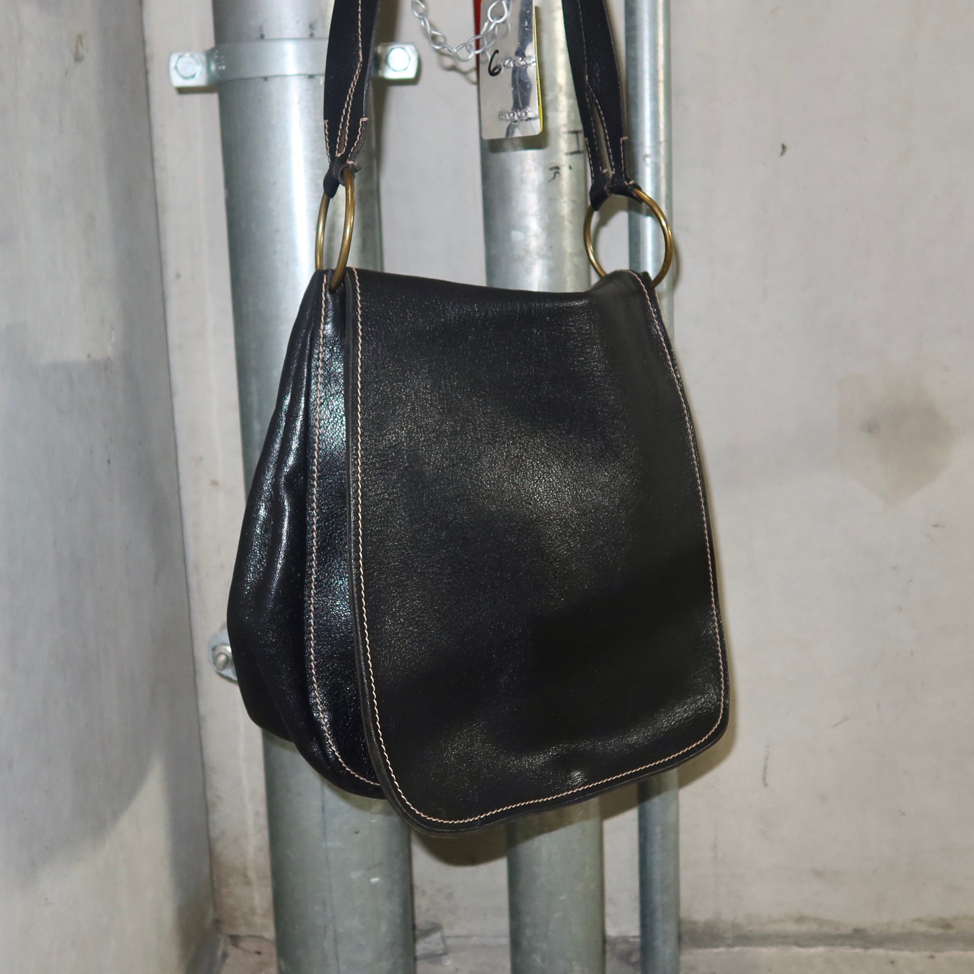 Amazing leather Miu Miu shoulder bag with metal ring hardware. Iconic Miu Miu embossing on the base at the back of the bag.