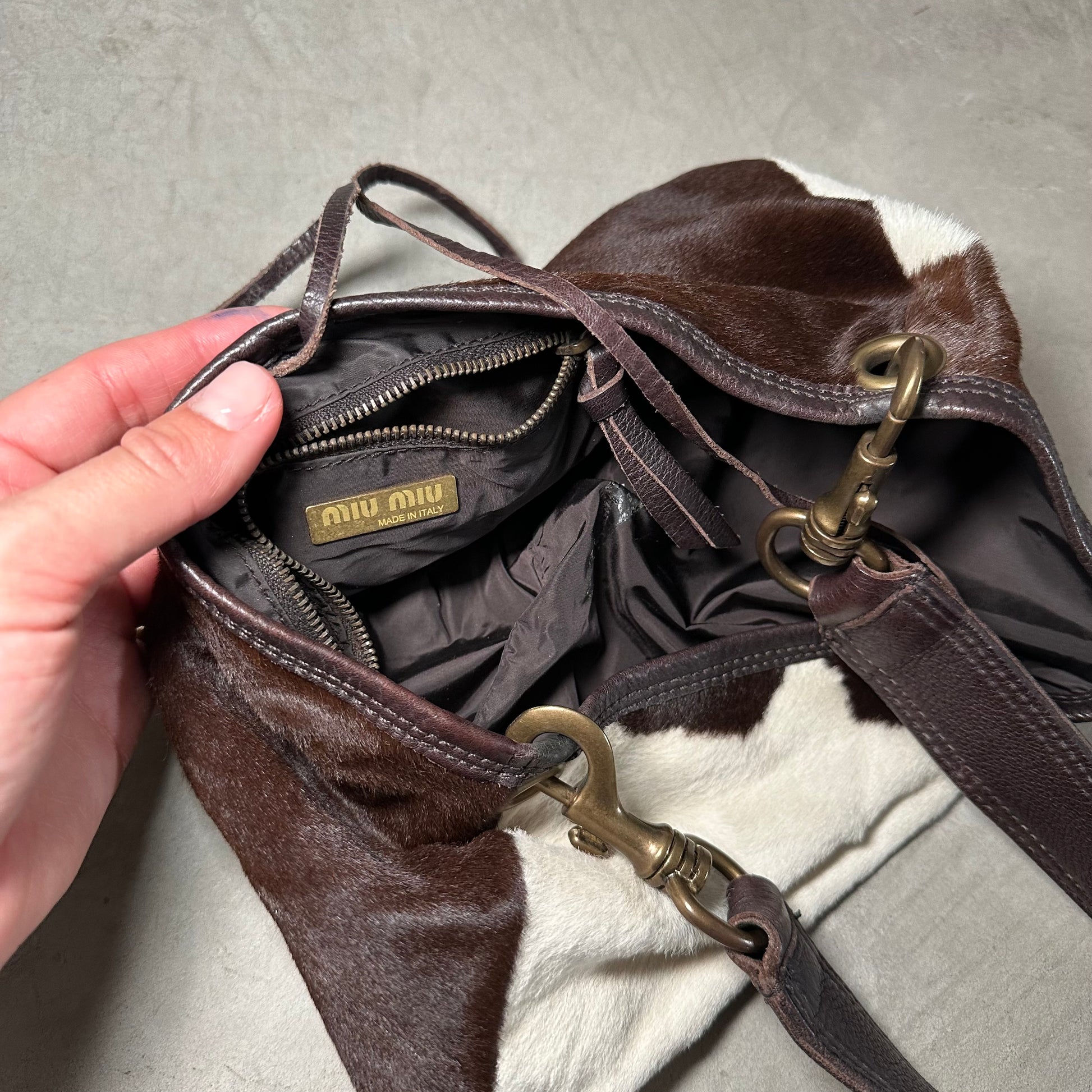 An iconic slouchy Miu Miu cowhide shoulder bag. Embossed leather strap and leather tie closure.