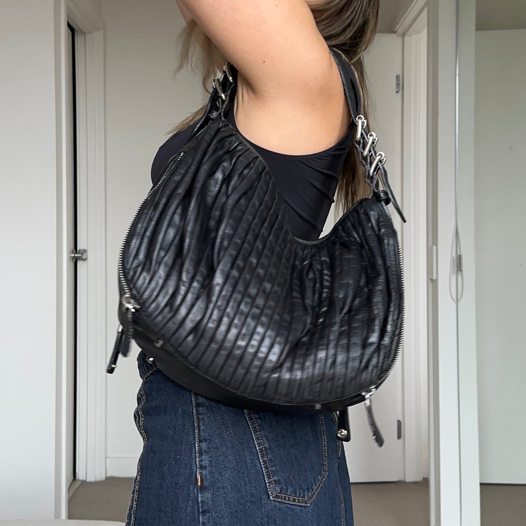 Incredible and rare vintage chunky Miu Miu bag with triple buckle handle detail, a fat, crescent shape, and zip accents. She's large, weighty, squishy perfection.