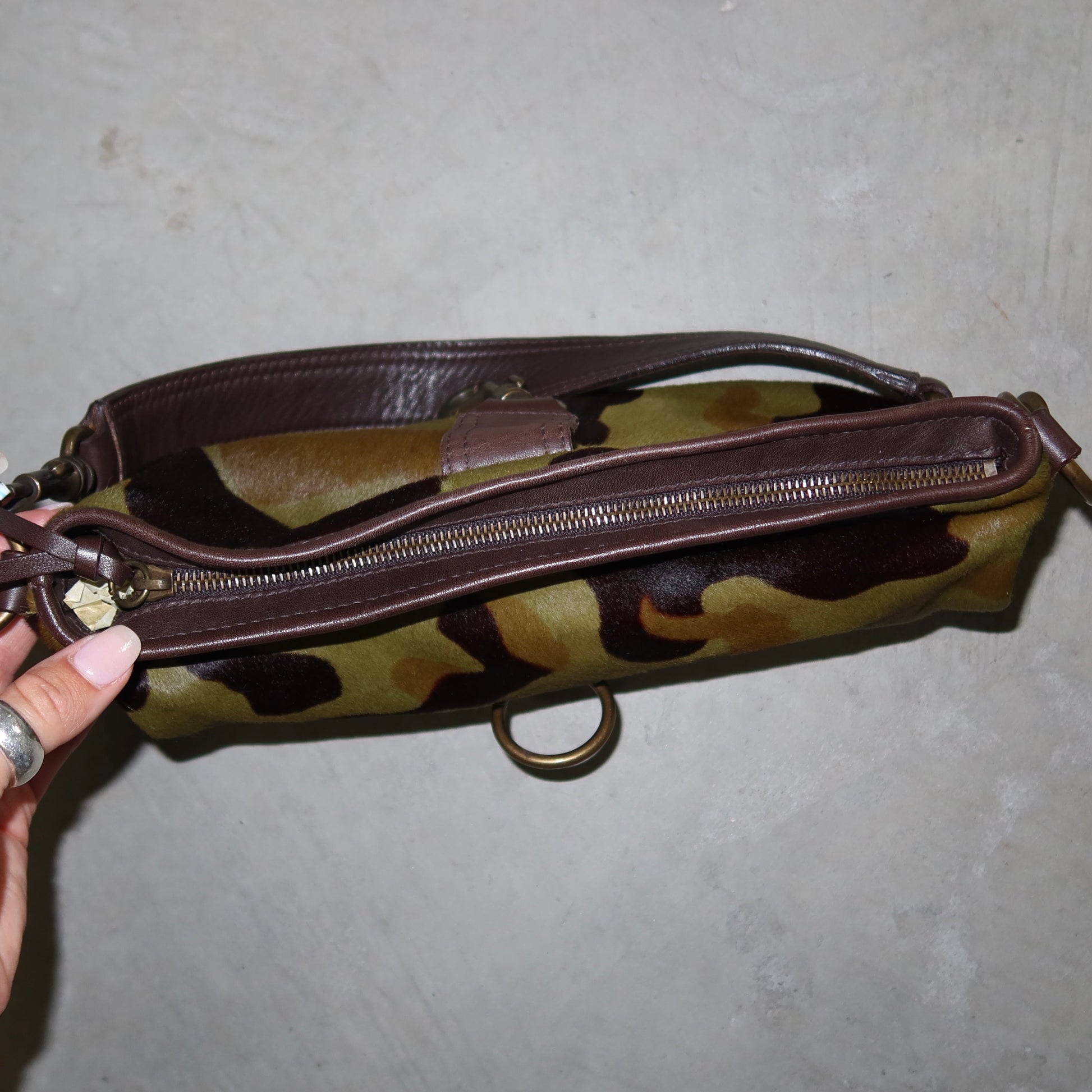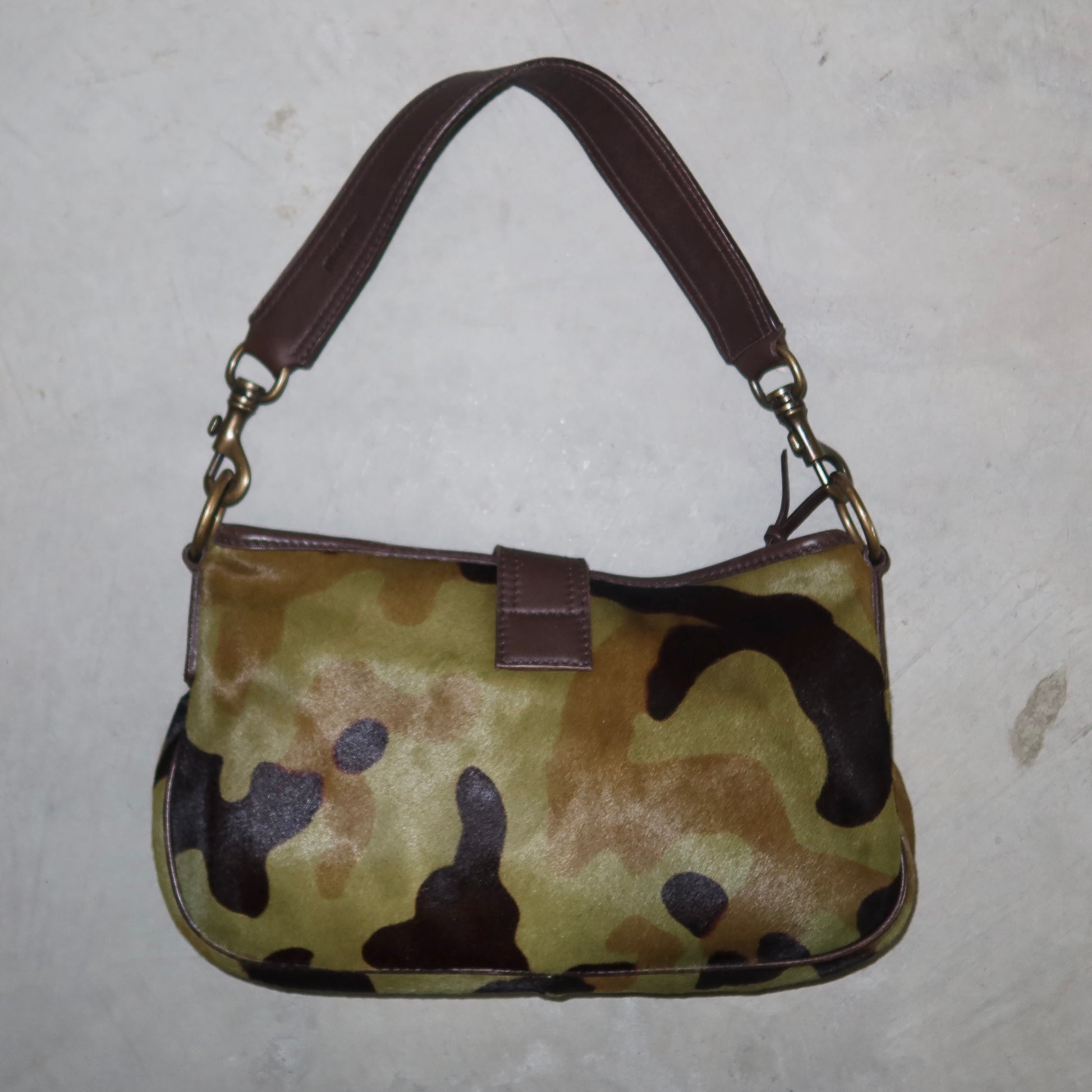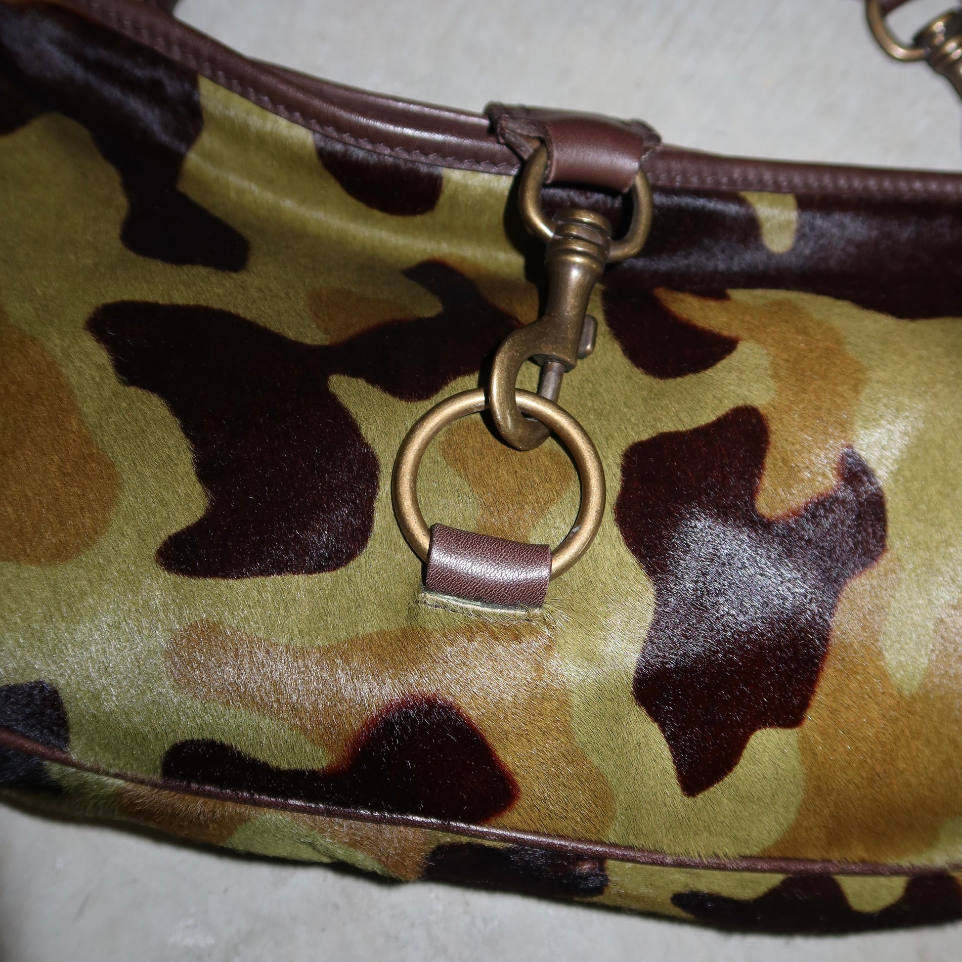 Gorgeous Miu Miu clasp front bag in a special camouflage cowhide. Not only are these vintage clasp front Miu Miu bags a rare find since they rereleased them but the camouflage version is particularly hard to come by!