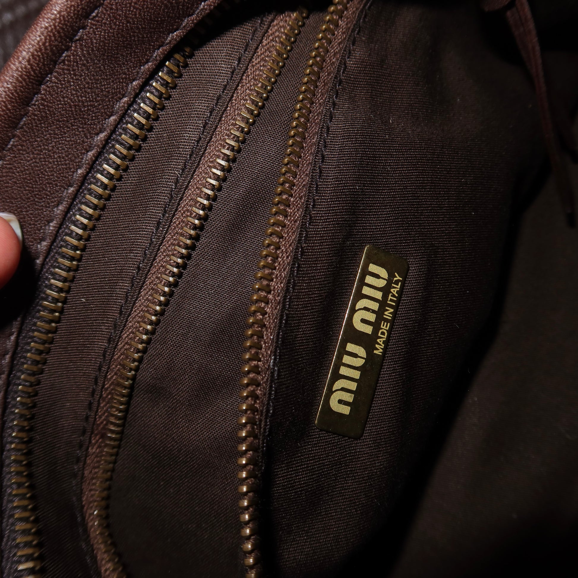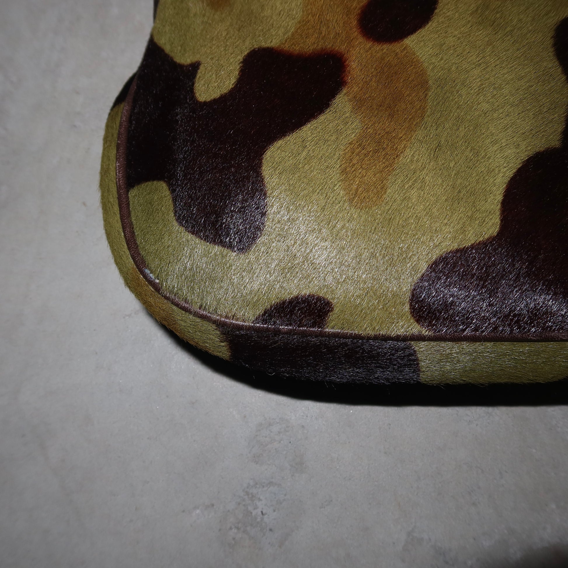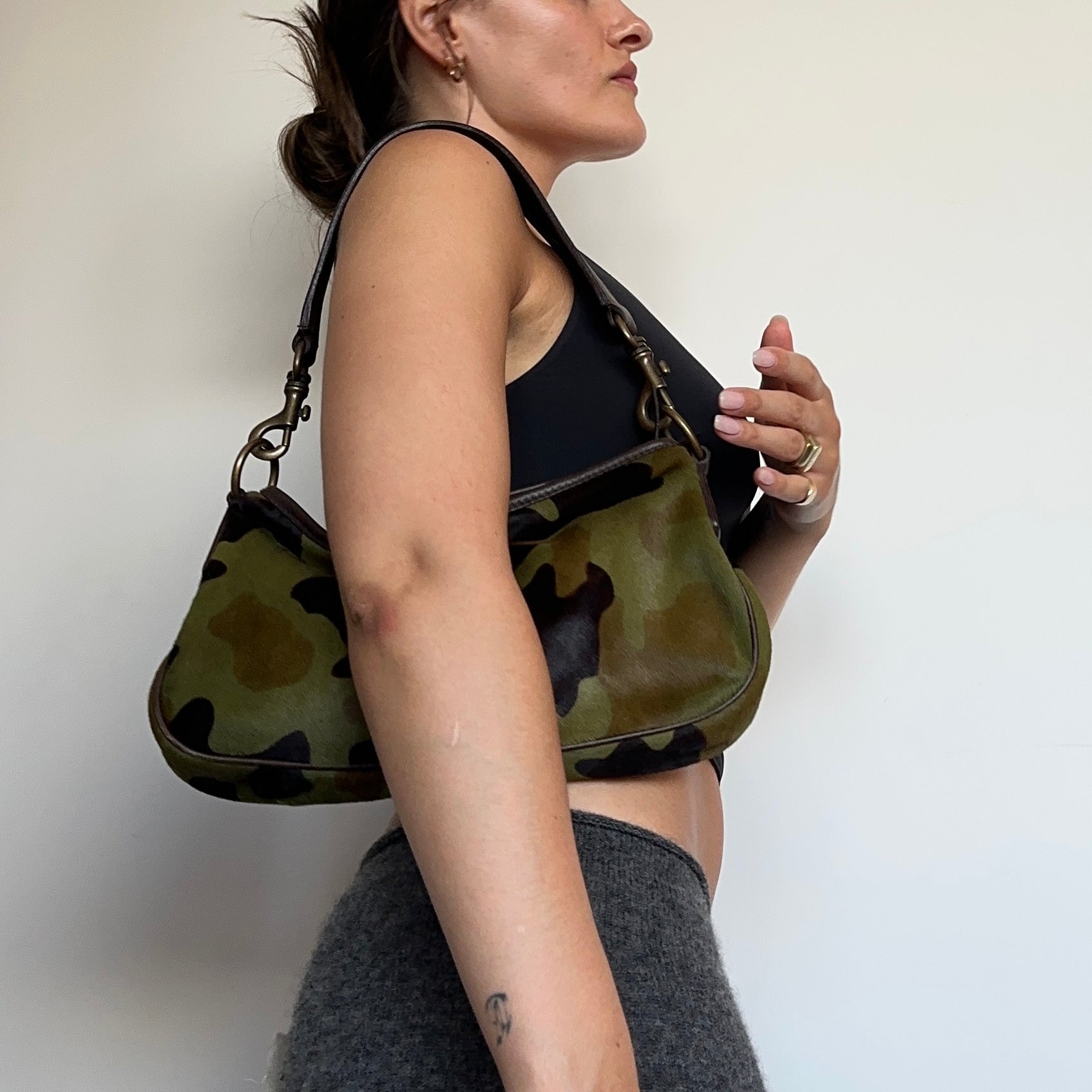 Gorgeous Miu Miu clasp front bag in a special camouflage cowhide. Not only are these vintage clasp front Miu Miu bags a rare find since they rereleased them but the camouflage version is particularly hard to come by!