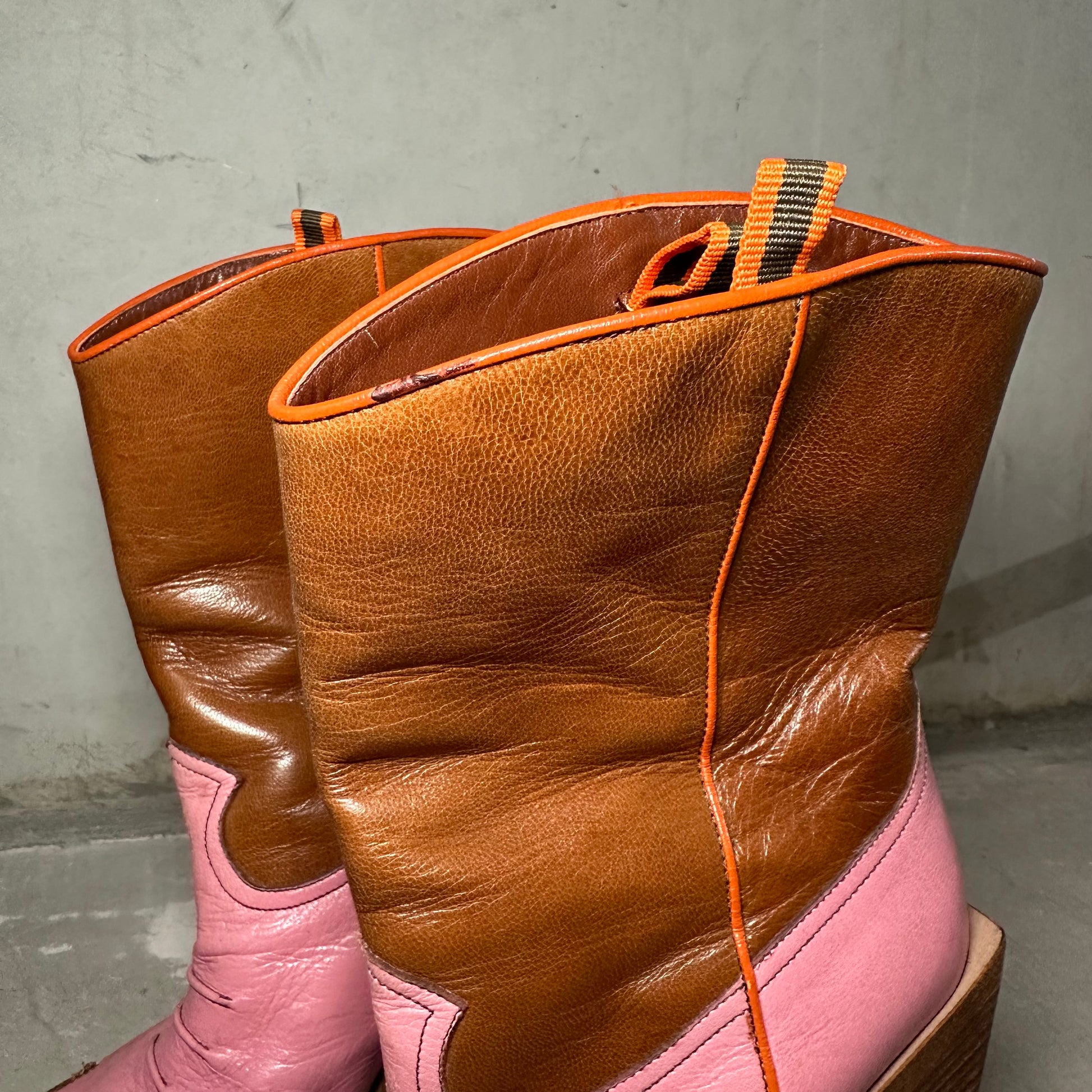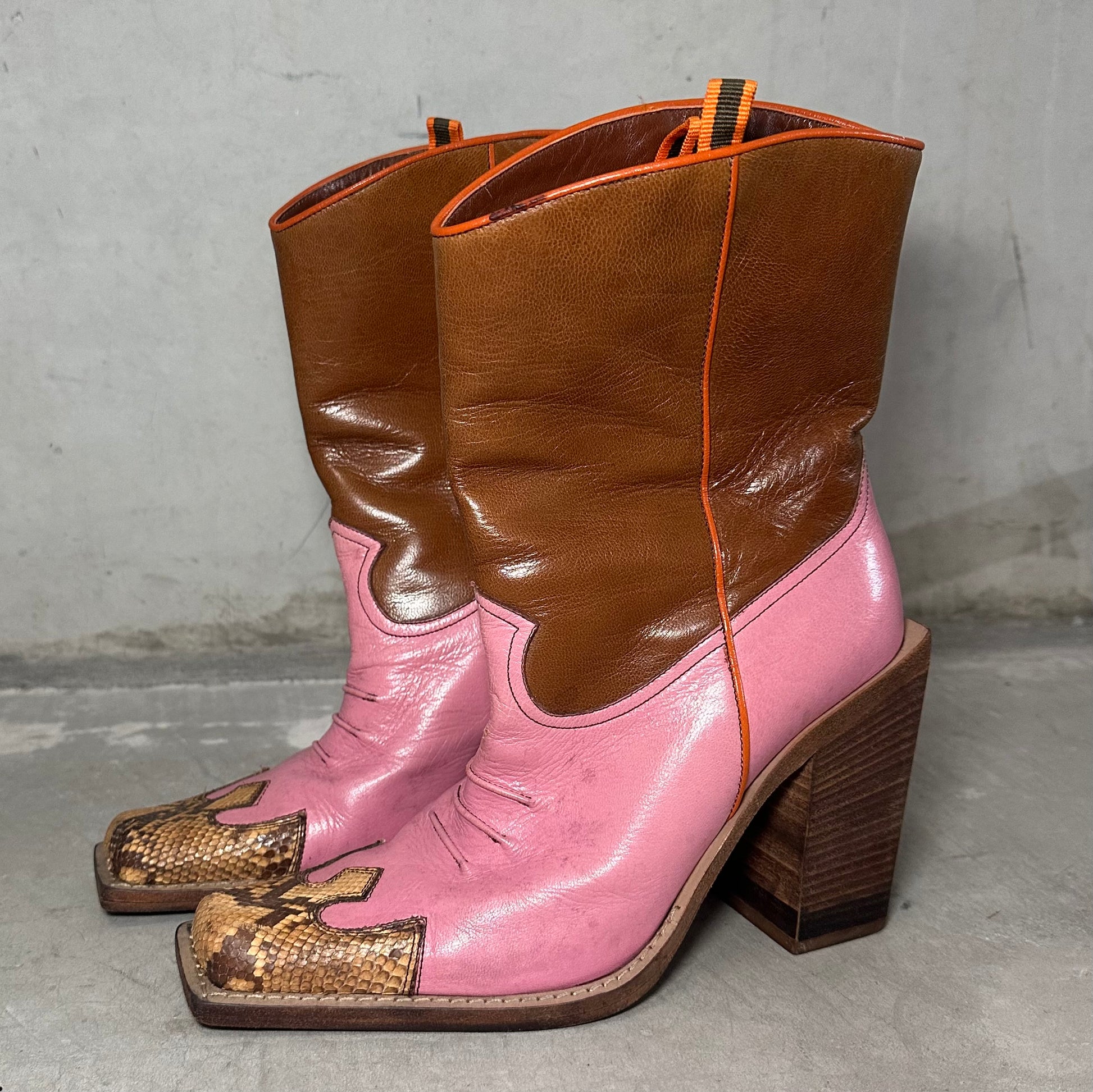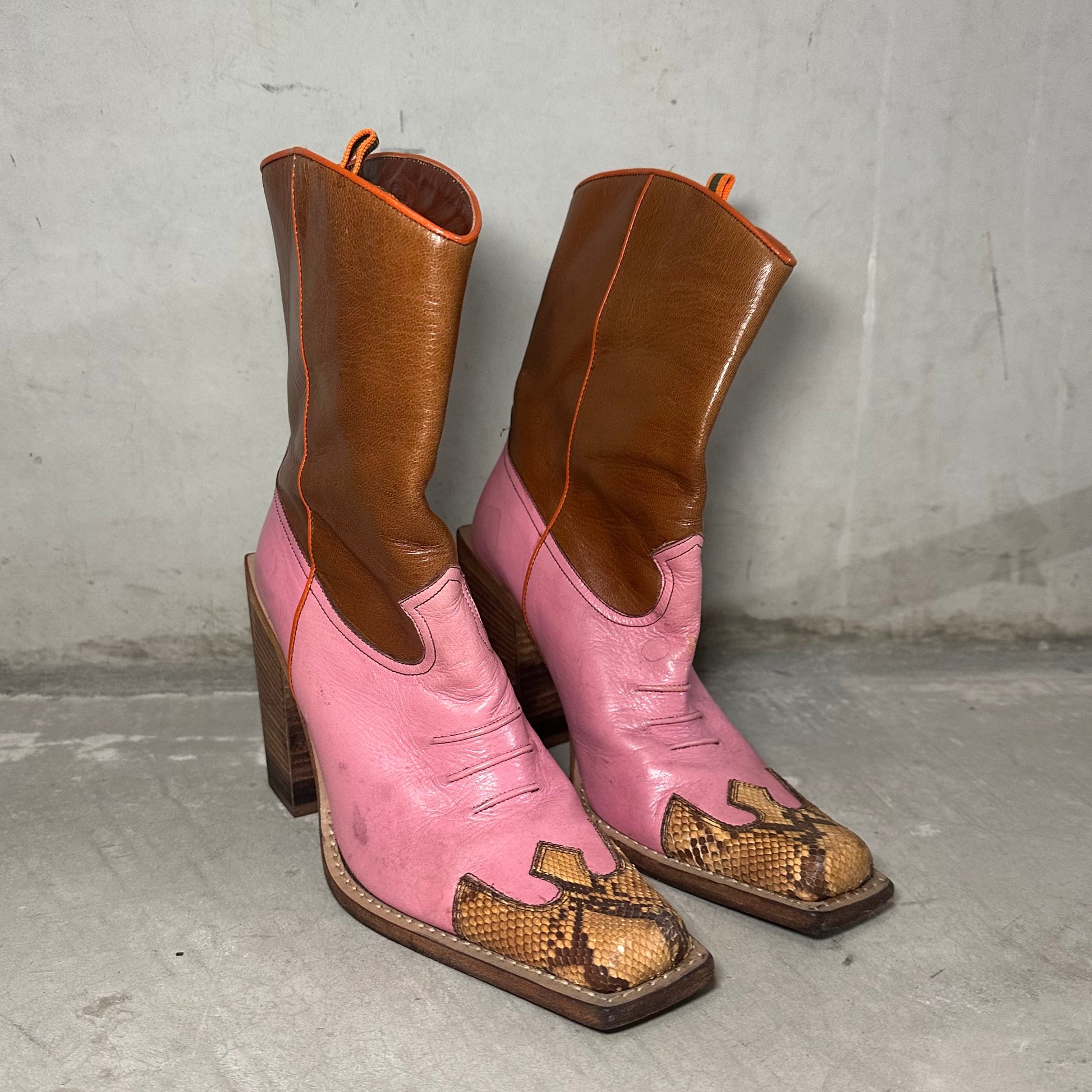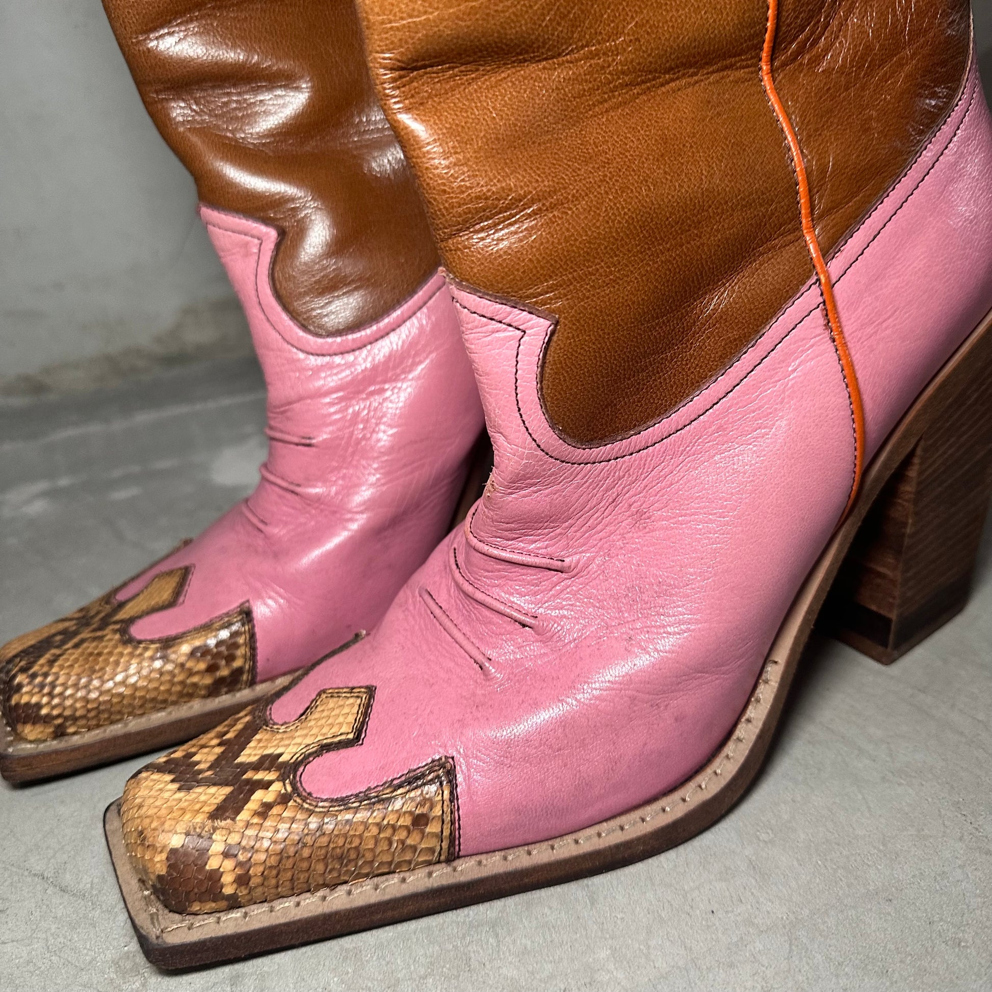 The most amazing Miu Miu SS1999 cowboy boots in pink and brown leather, with python toe accents, as seen on the runway. Please note, these are incredibly rare.