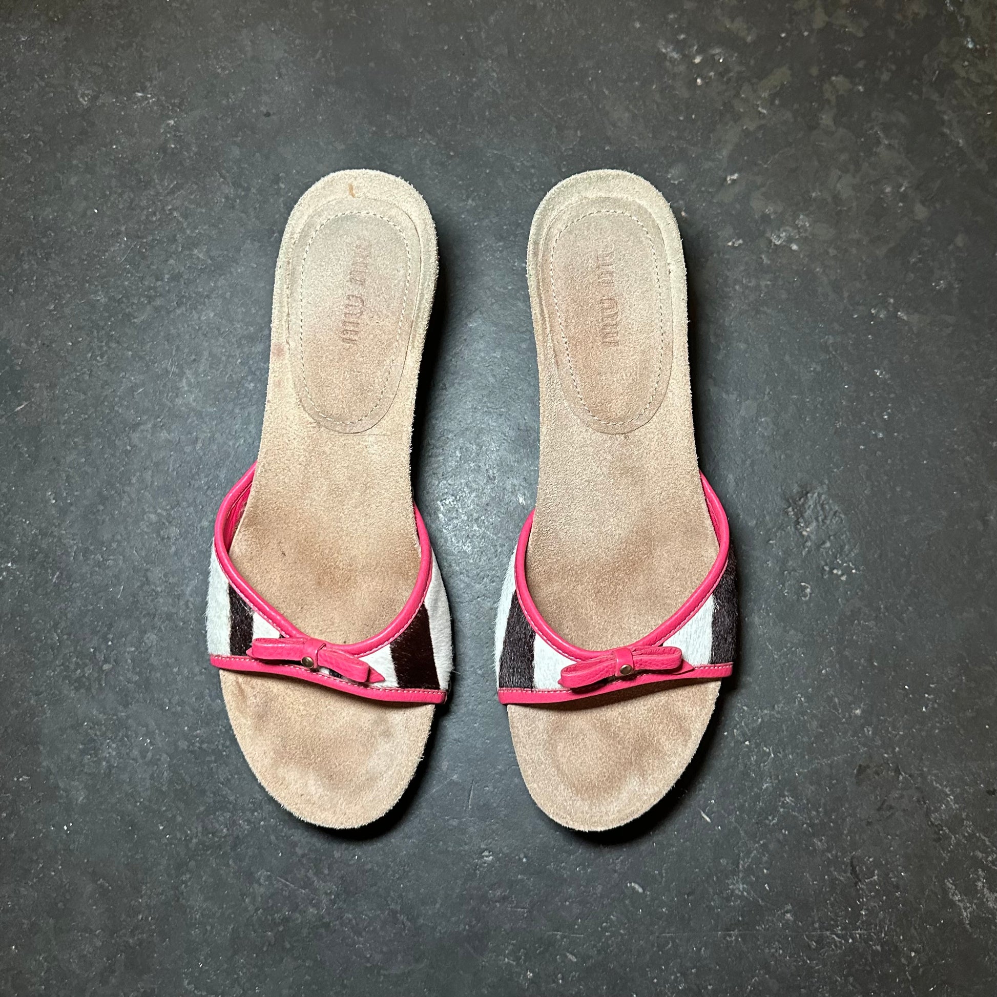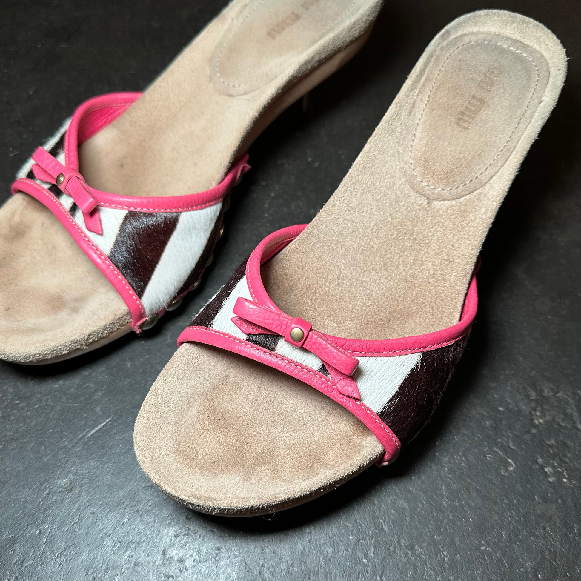 Miu Miu cowhide zebra print peep toe kitten heels with bow detail.
