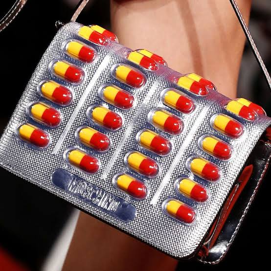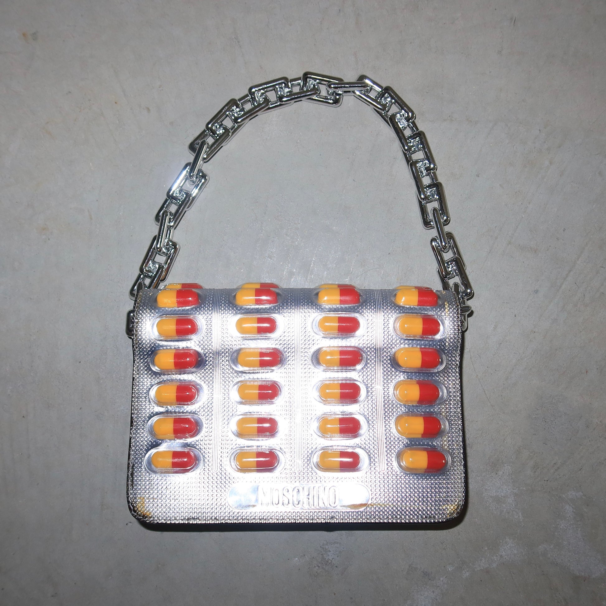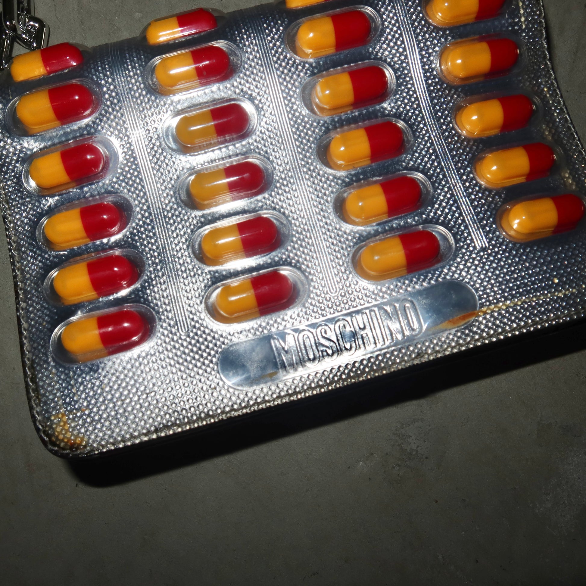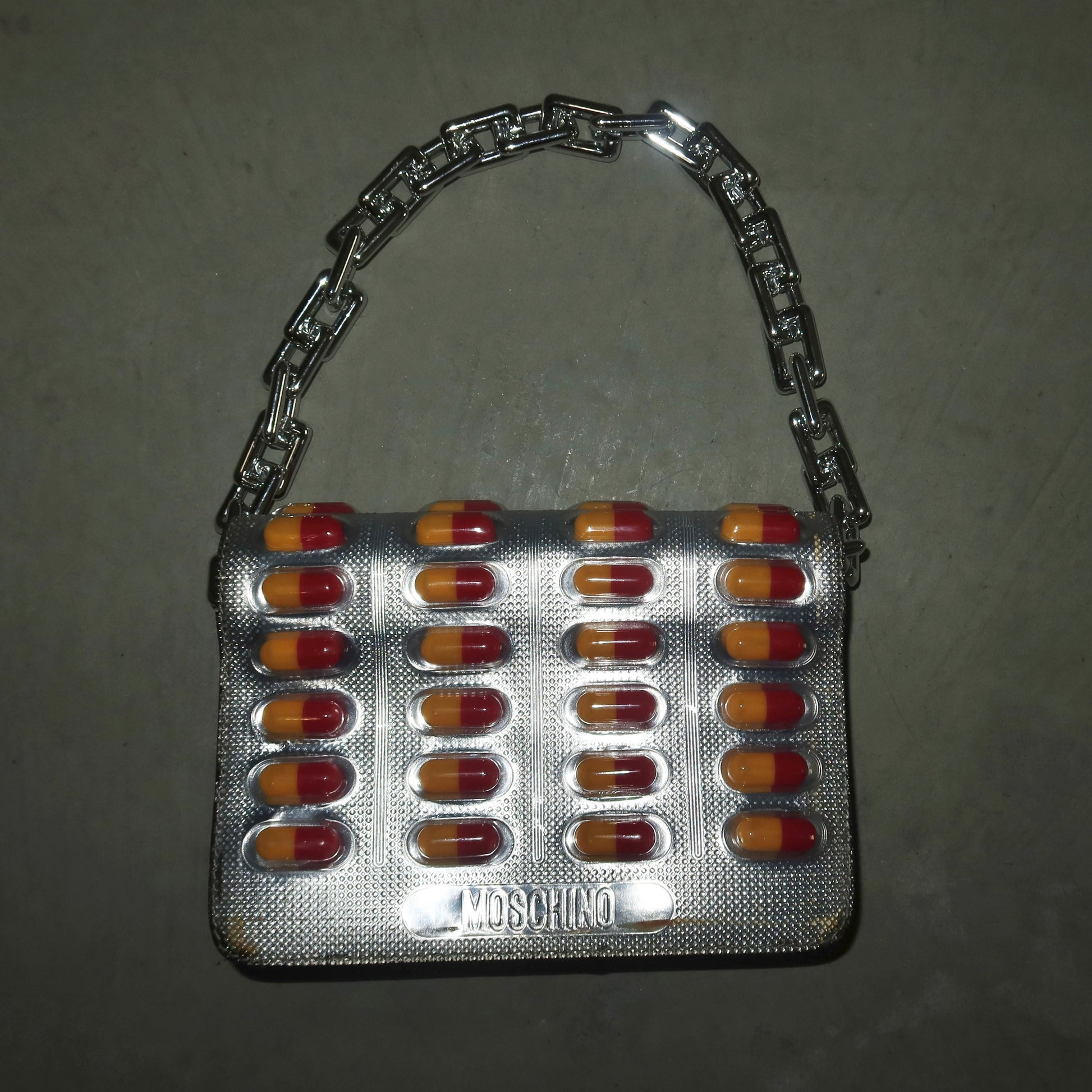 Moschino pill bag from Jeremy Scott's era, as seen on the runway. This beauty was swiftly discontinued due to the controversy it caused when it was released.Β