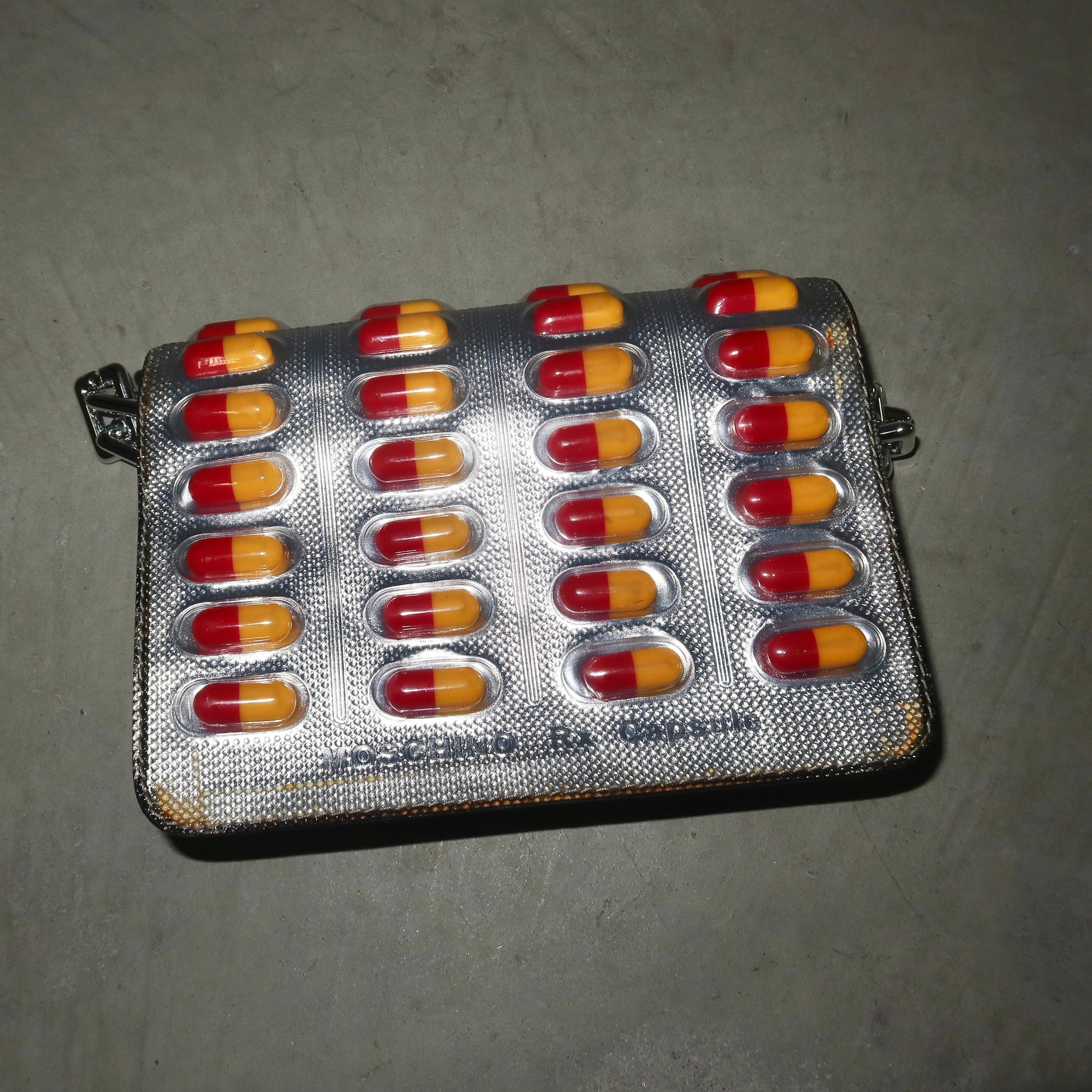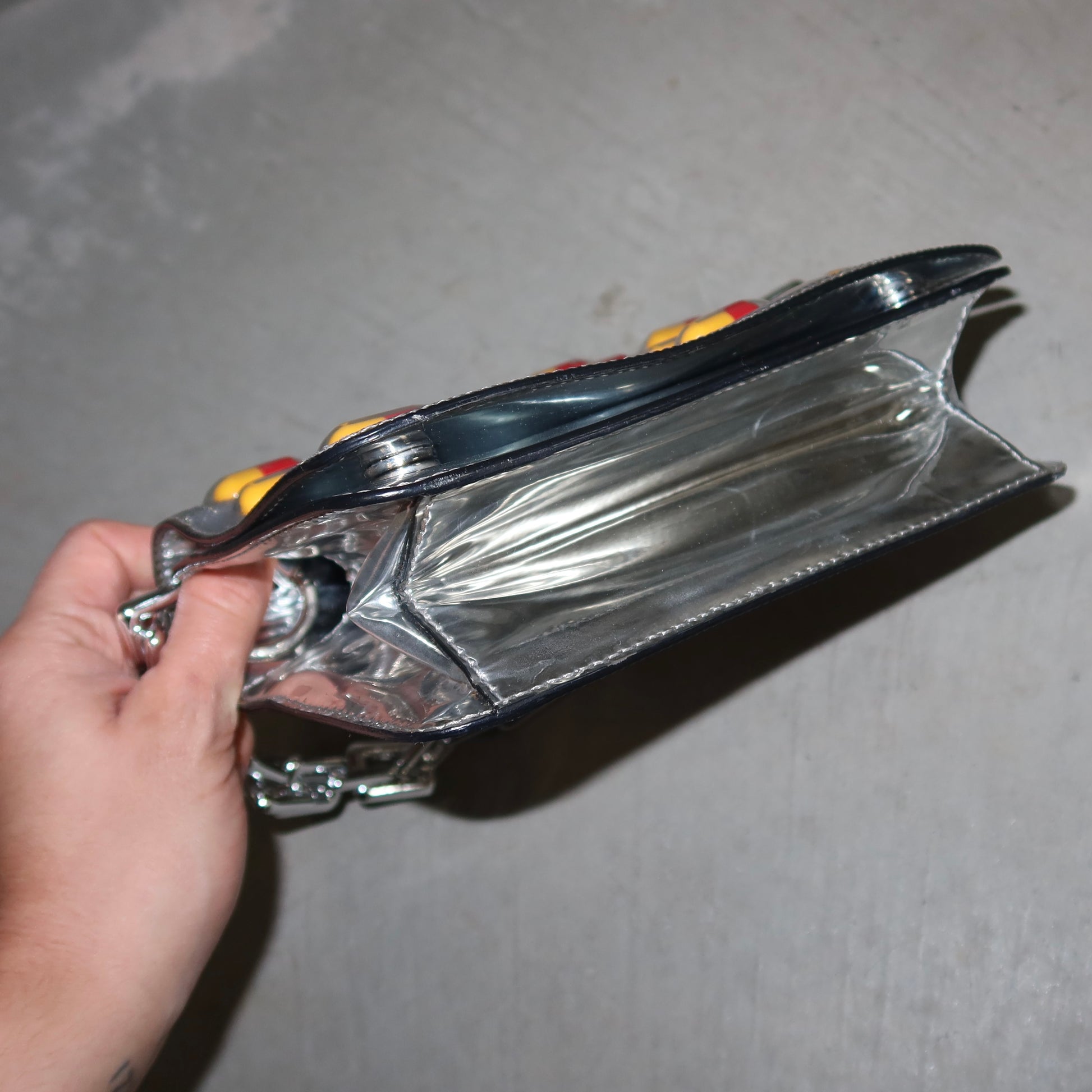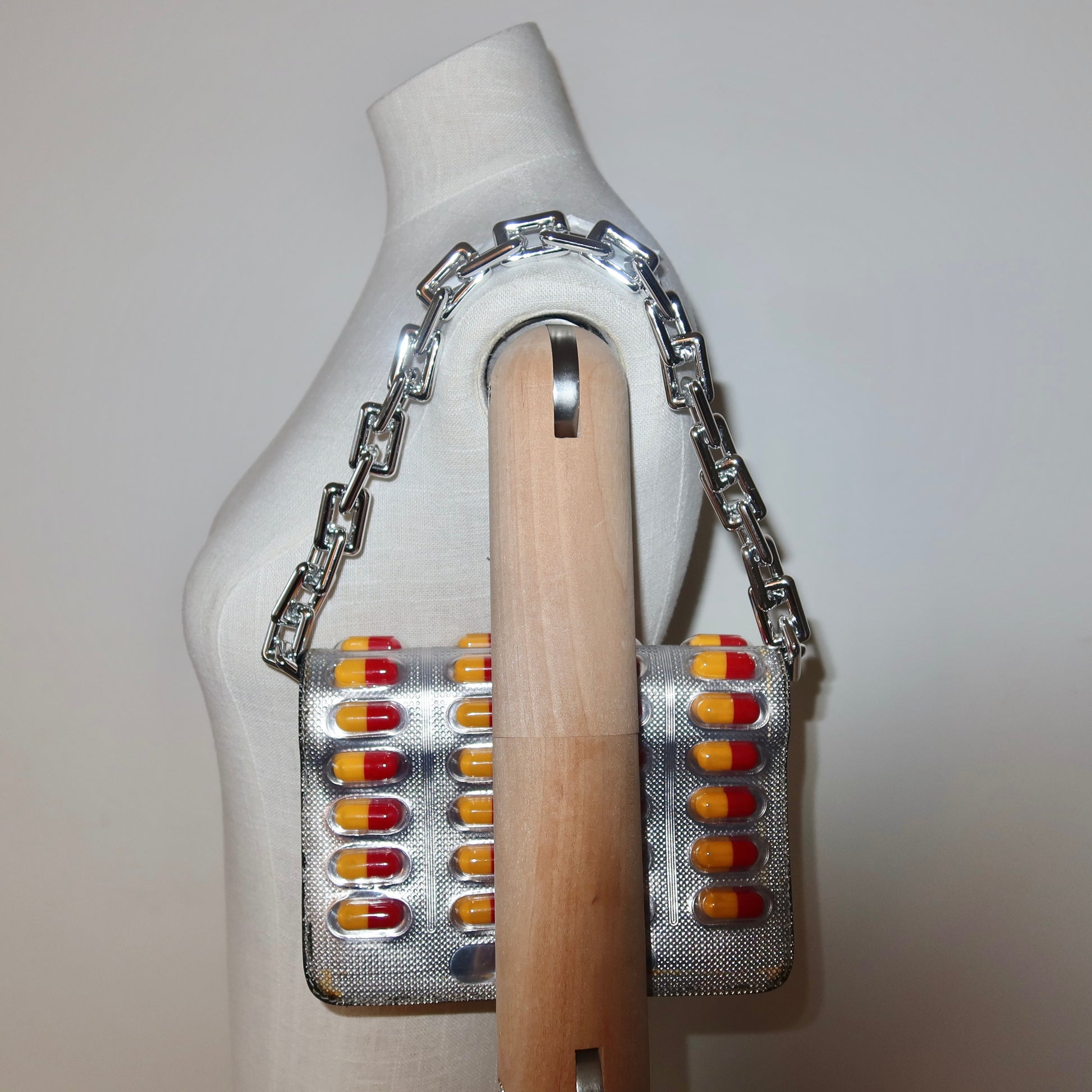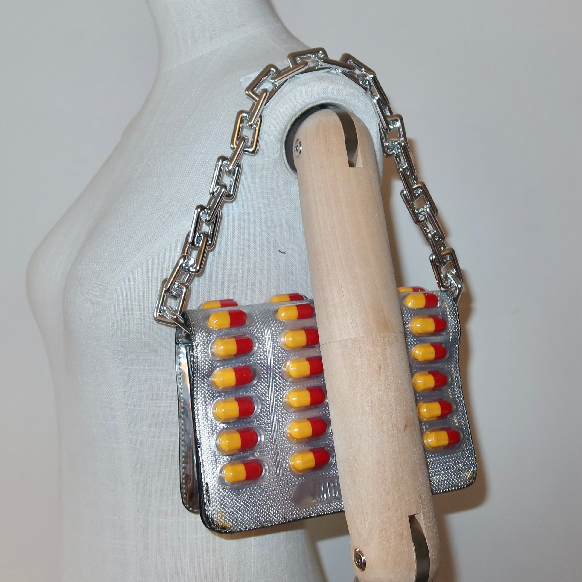 Moschino pill bag from Jeremy Scott's era, as seen on the runway. This beauty was swiftly discontinued due to the controversy it caused when it was released.Β
