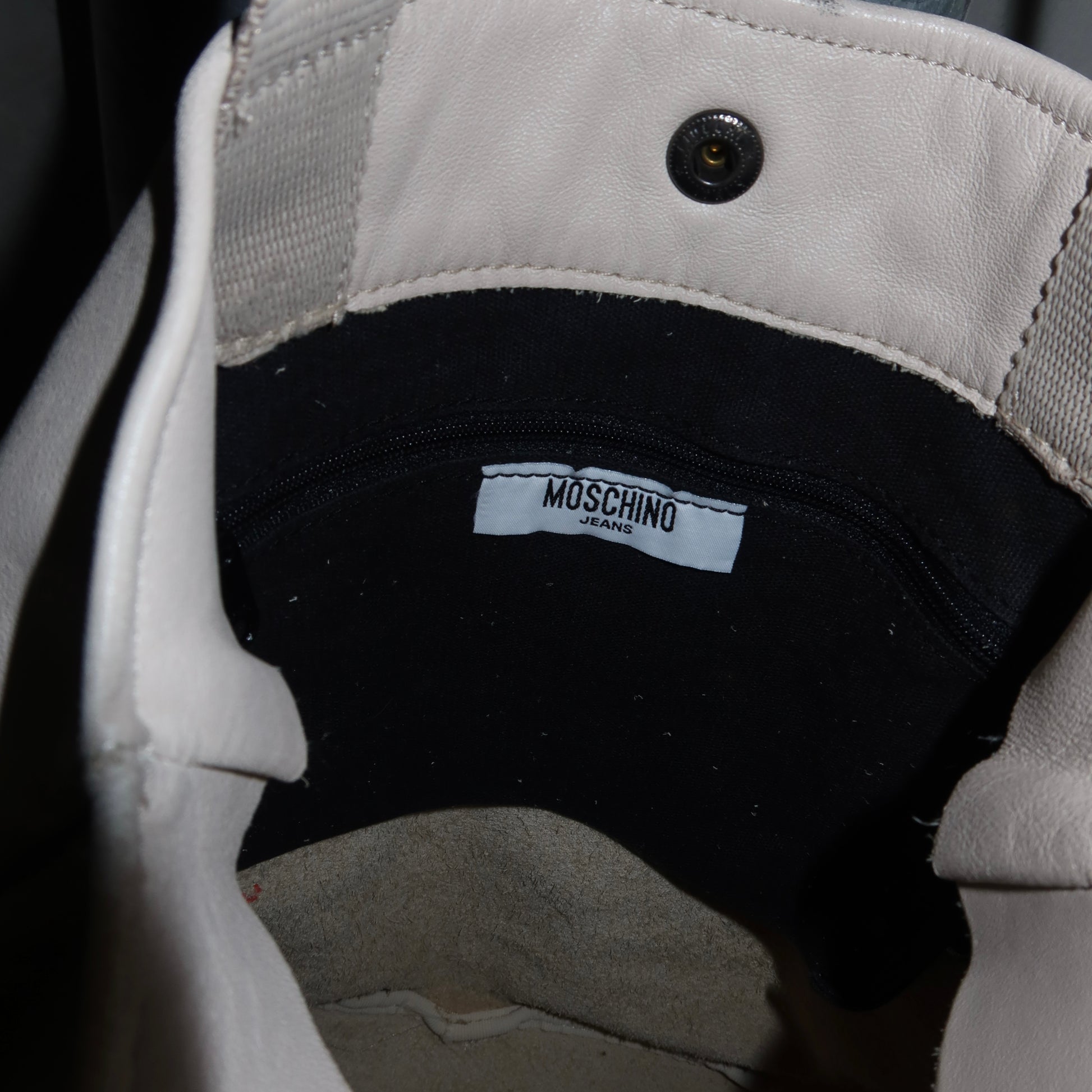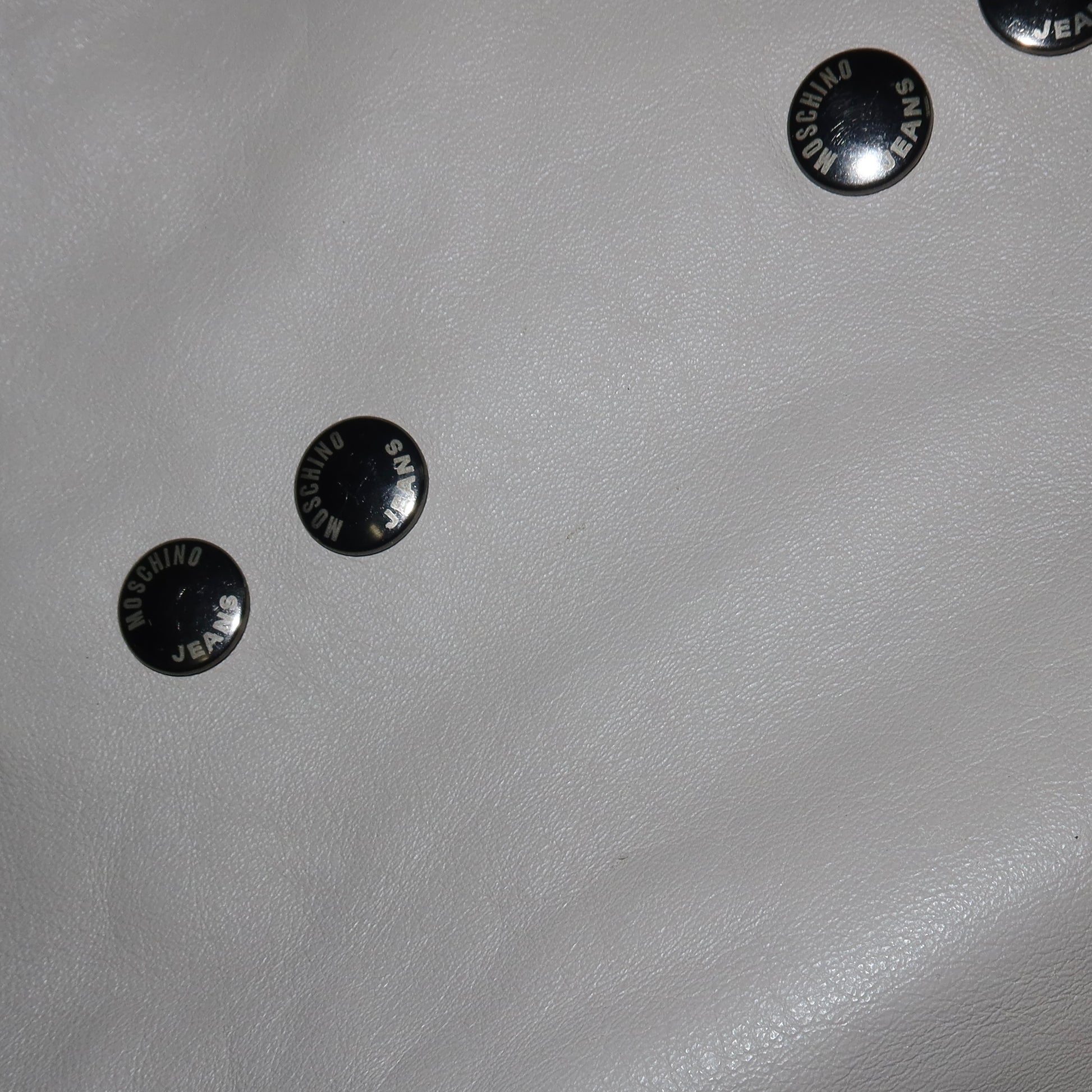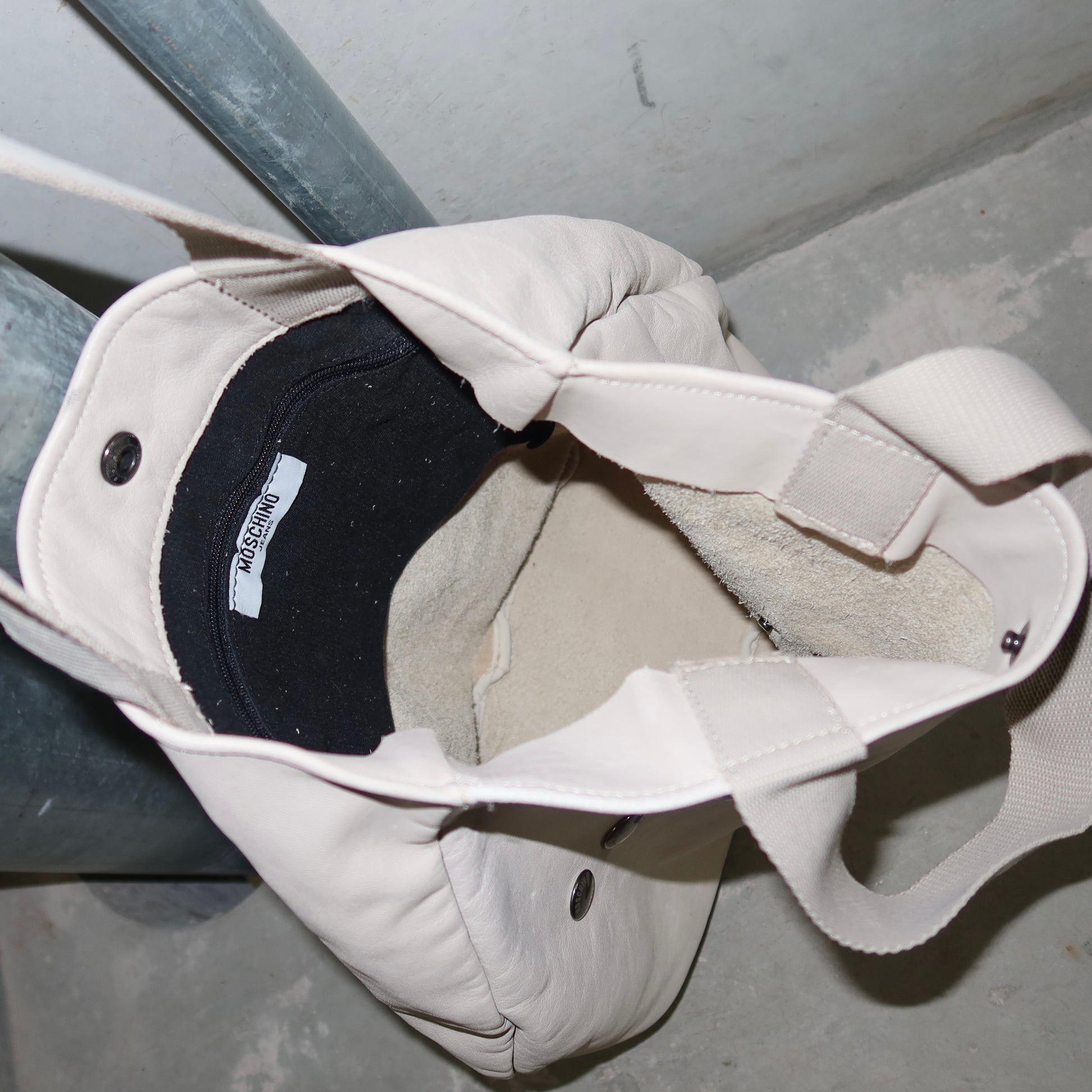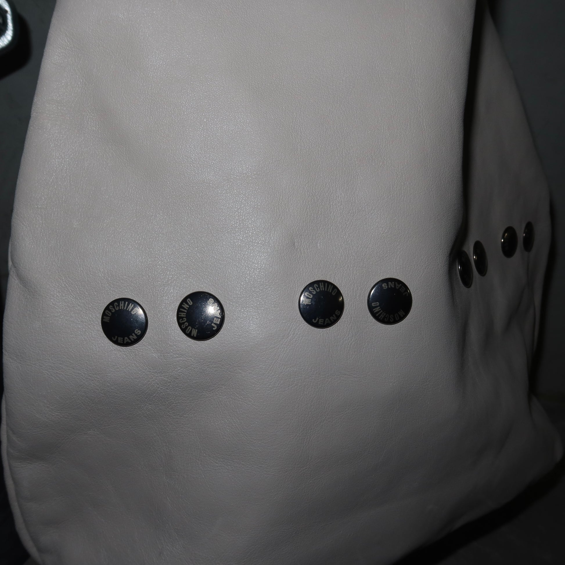 Gorgeous studded white leather mini tote by Moschino. Suede interior. Cotton handle.