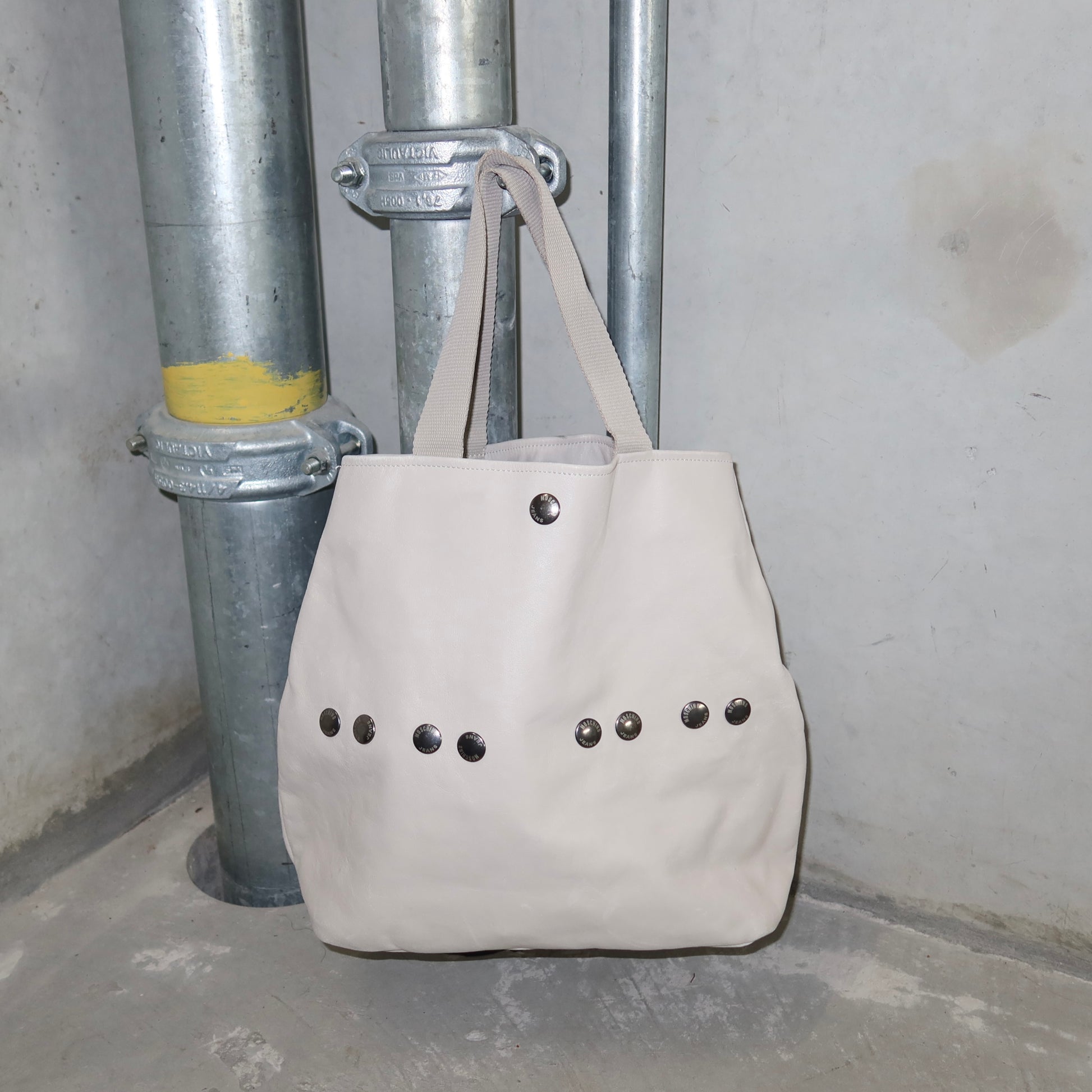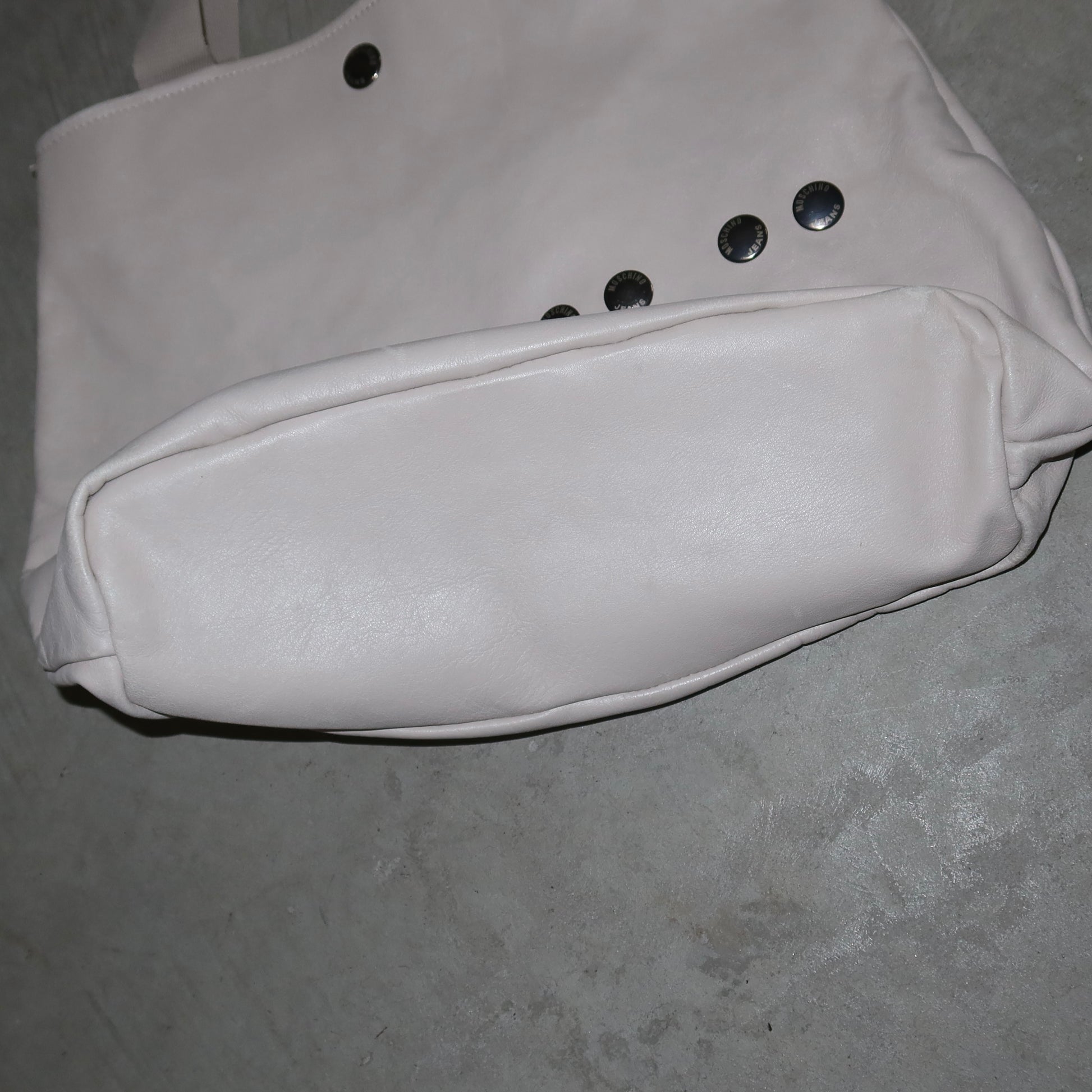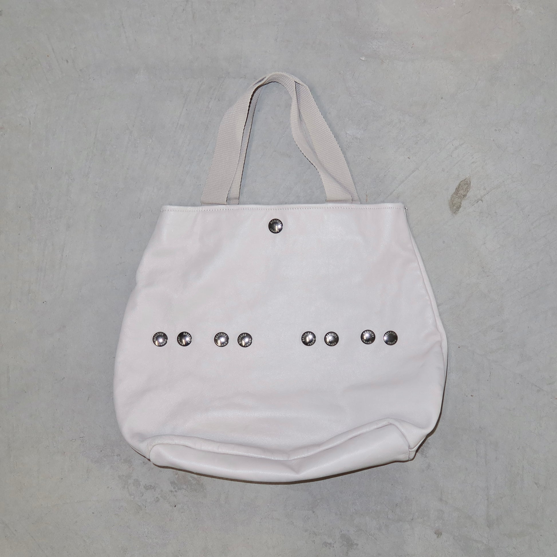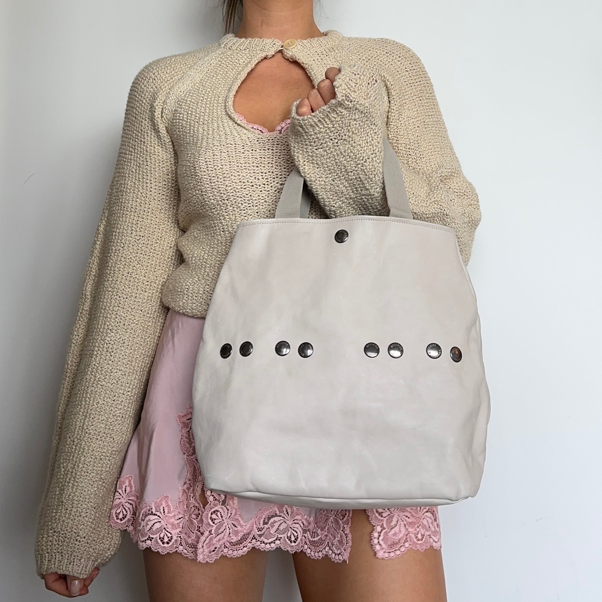 Gorgeous studded white leather mini tote by Moschino. Suede interior. Cotton handle.