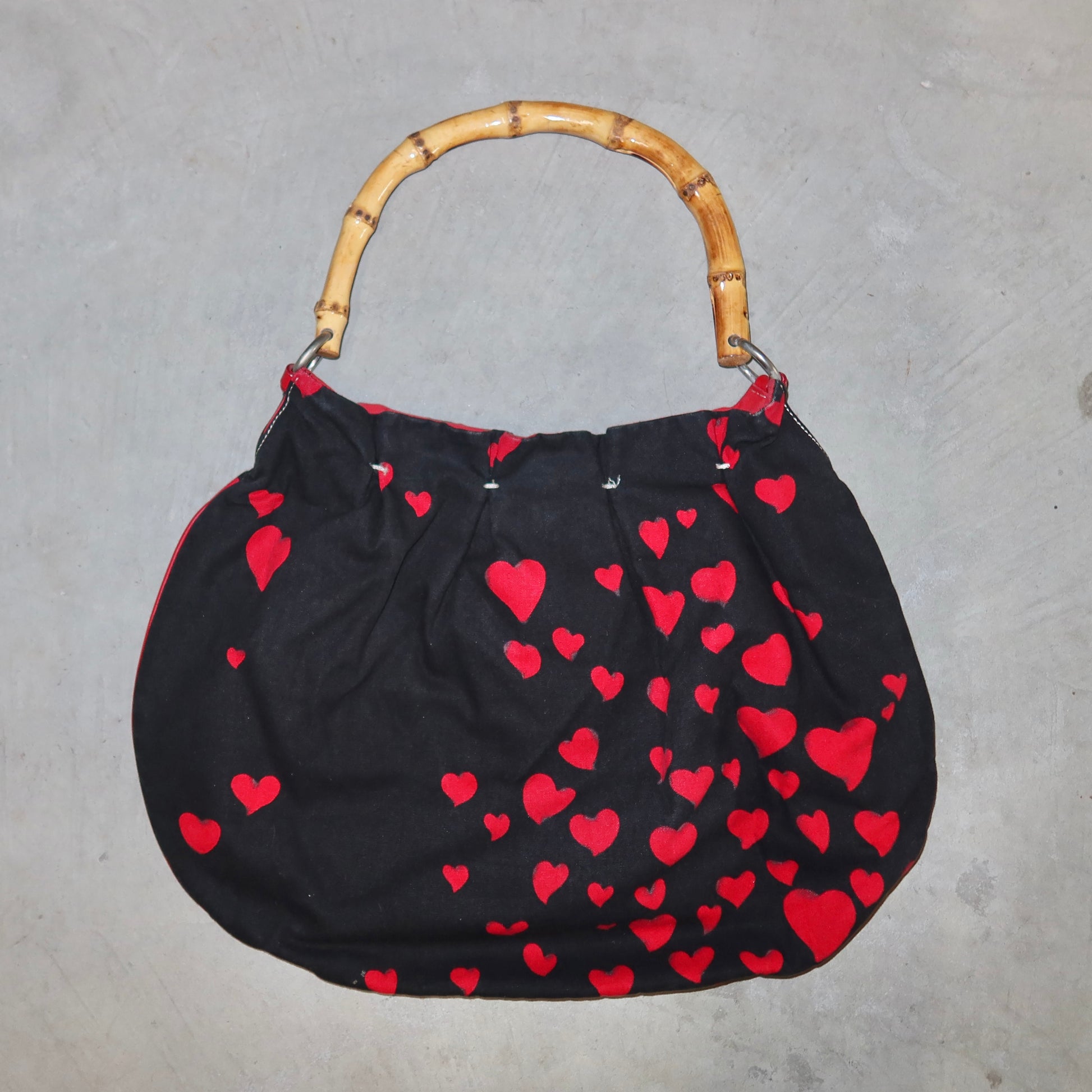 The cutest large black cotton Moschino bag with bamboo handle and iconic Moschino Cheap & Chic heart print pattern.