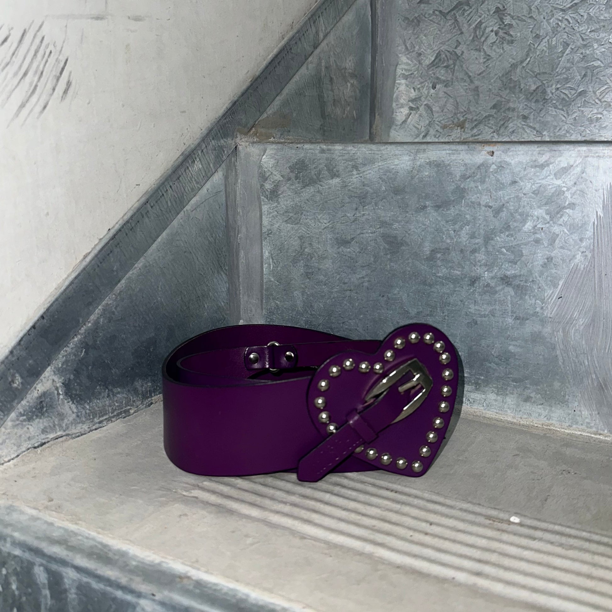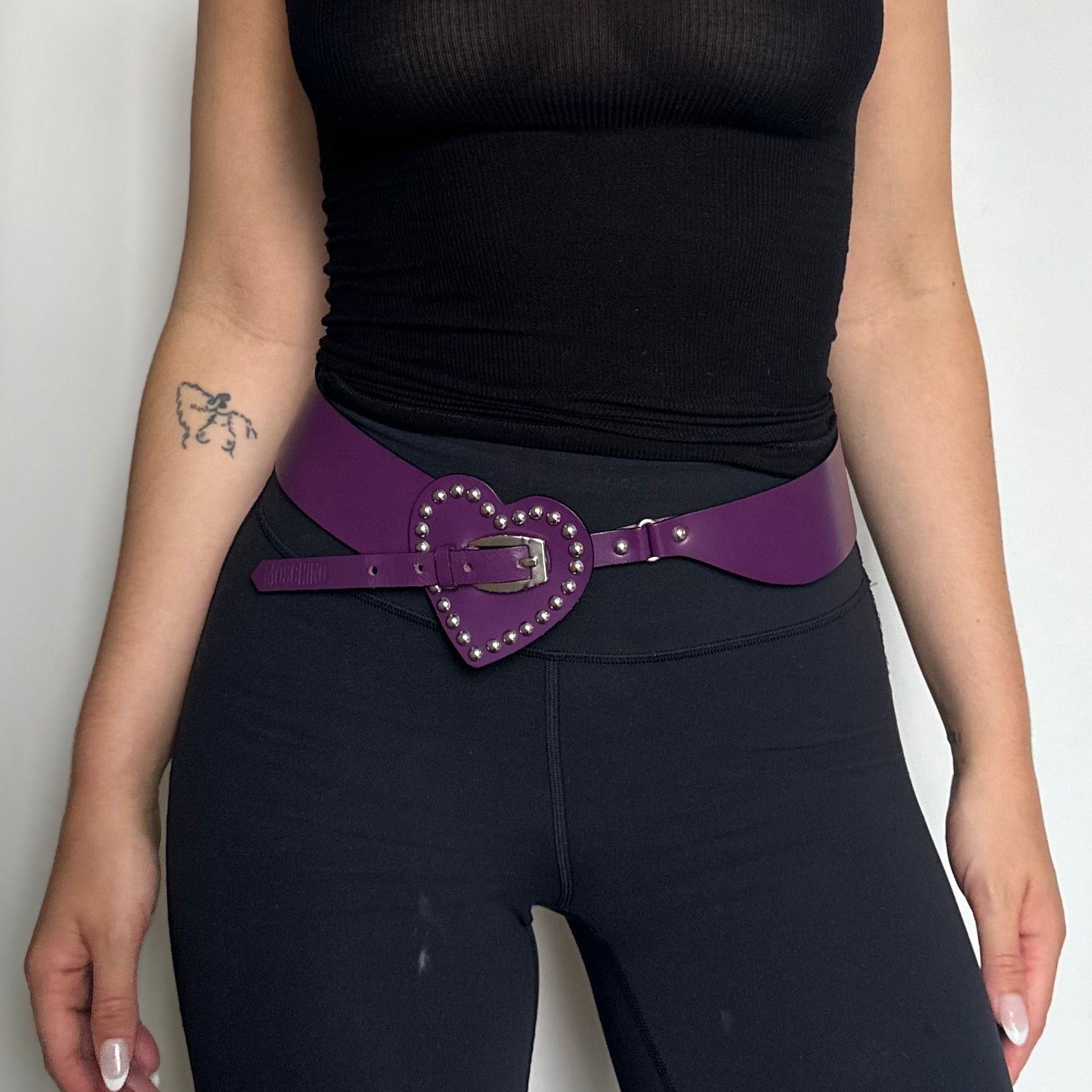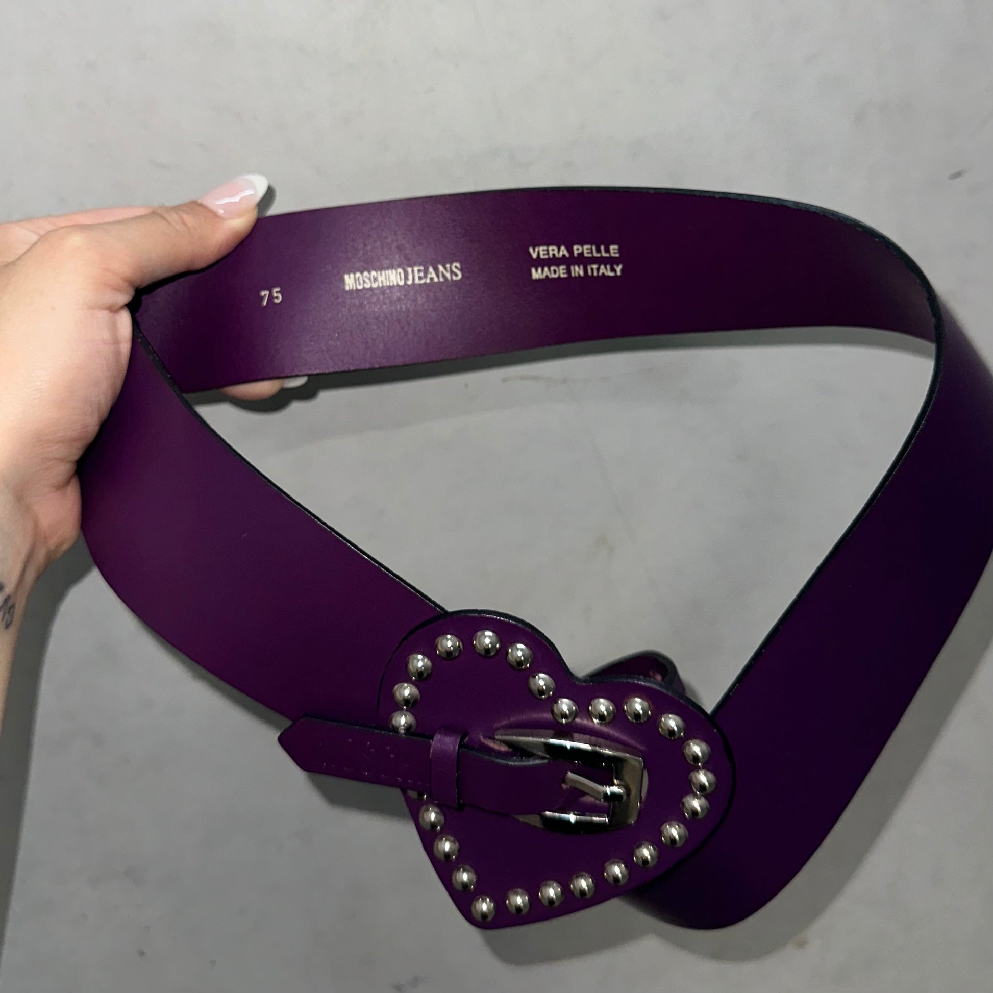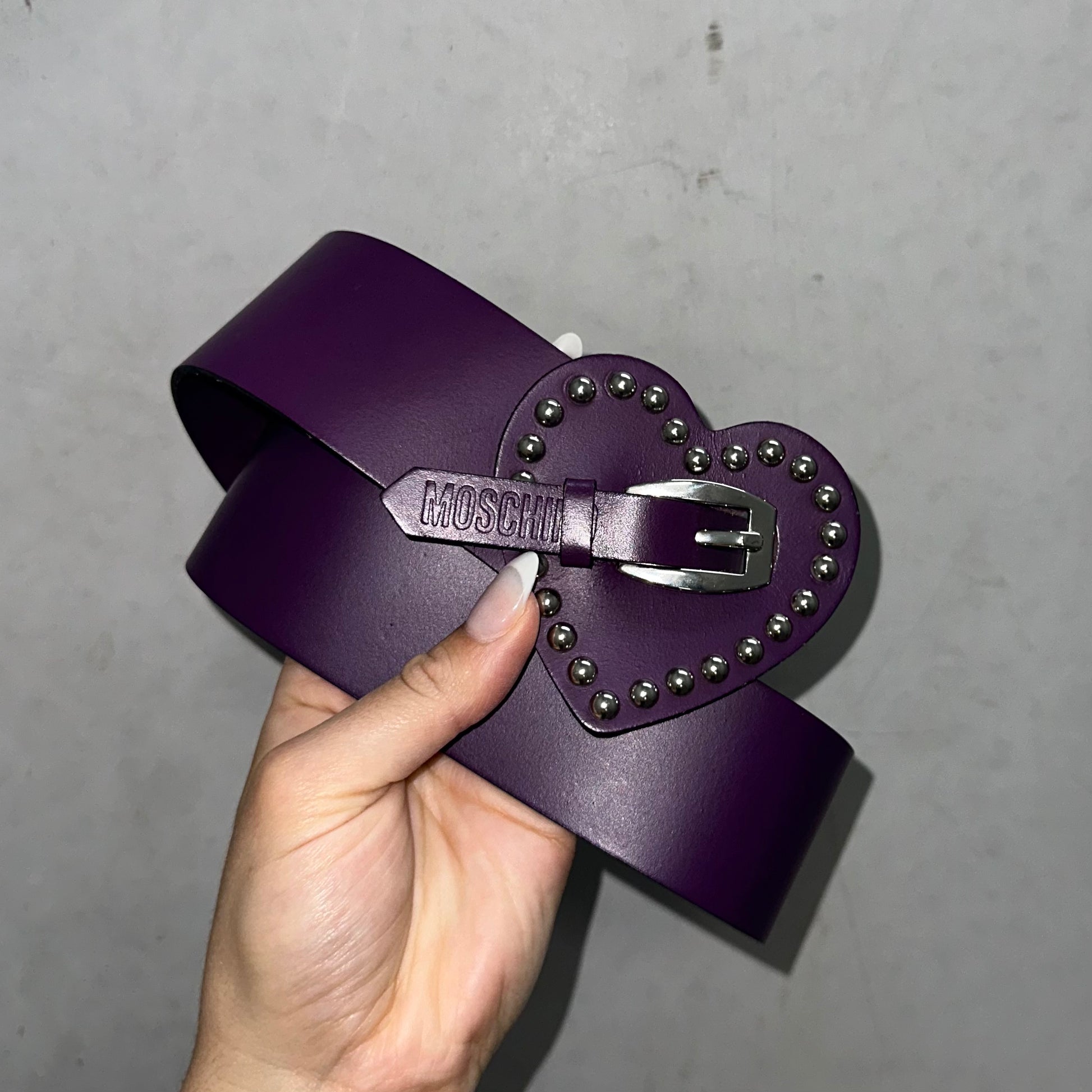 The most gorgeous eggplant leather belt by Moschino. Stud trim heart with MOSCHINO embossing.
