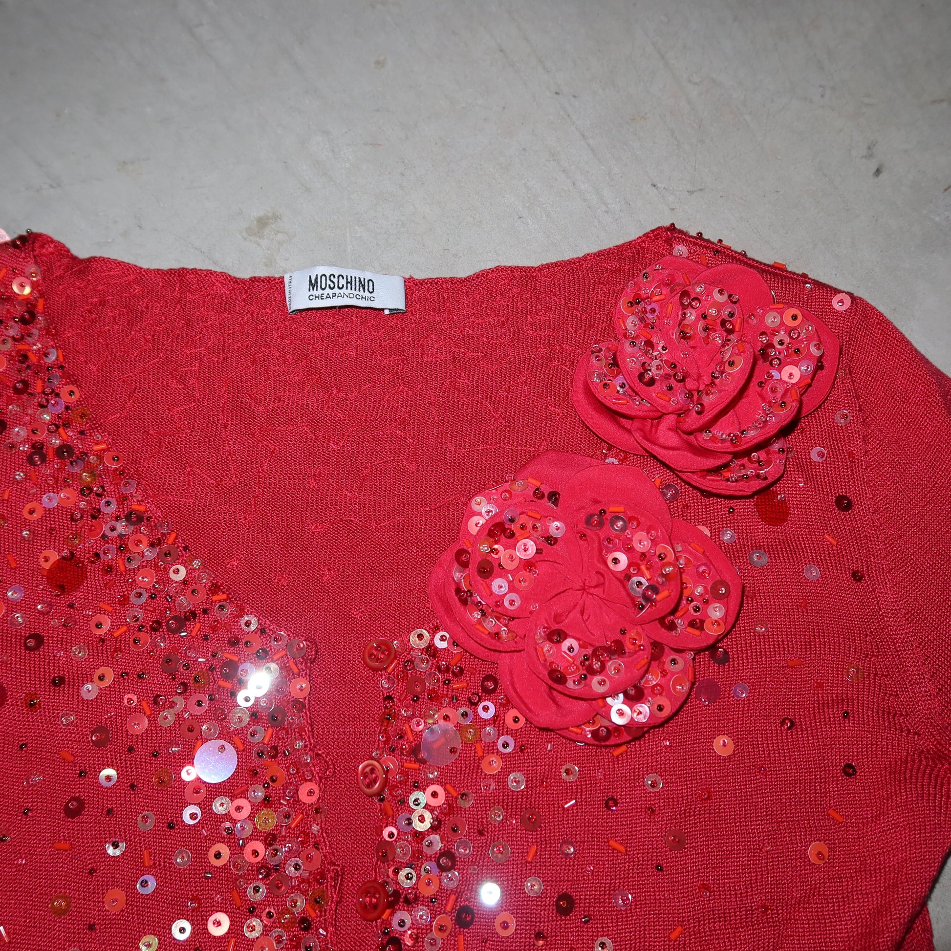 The most perfect fine knit red Moschino cardigan with sequin and rosette embellishment. 100% silk. Super flattering cut with the cutest loop button closure so you can choose how many you want to do up!